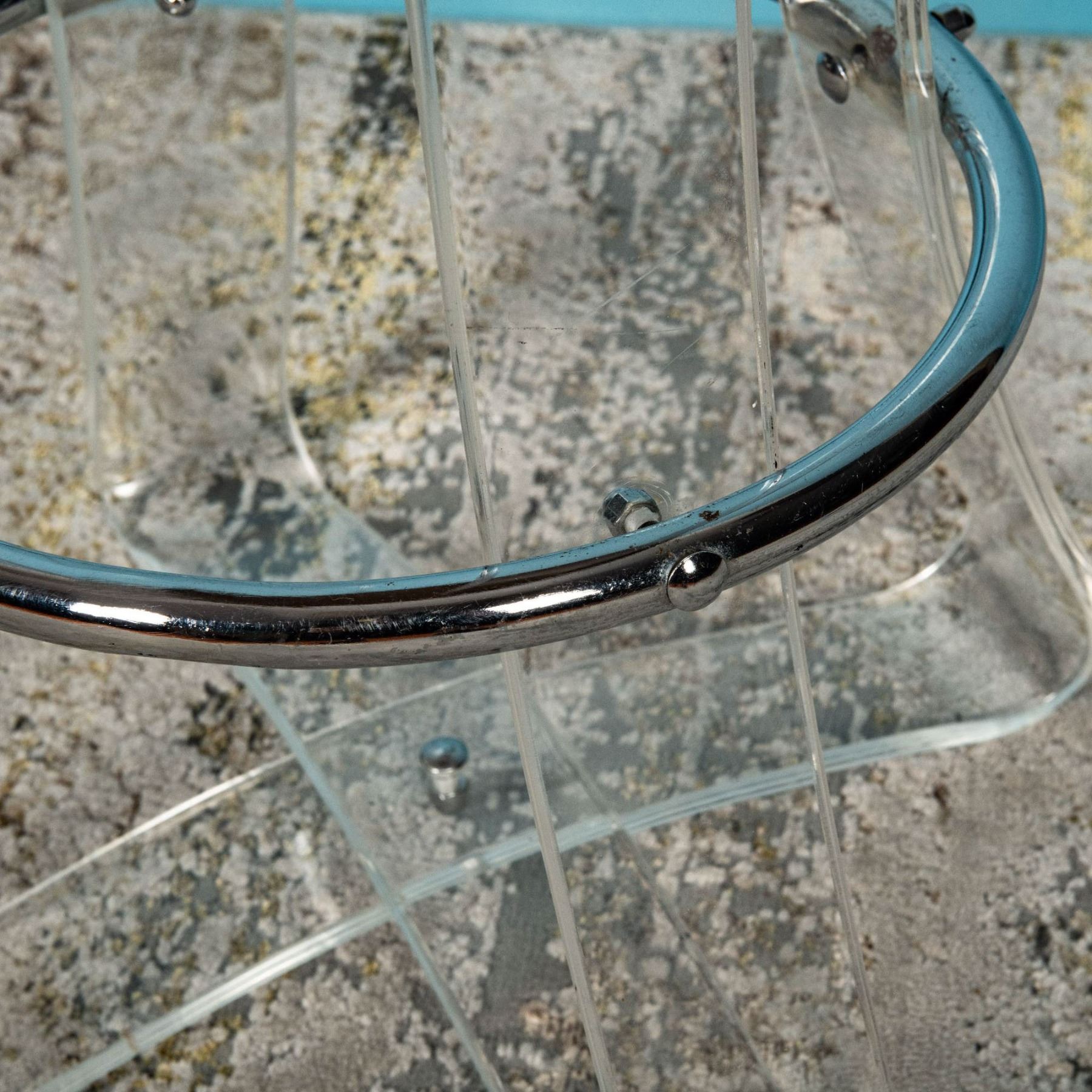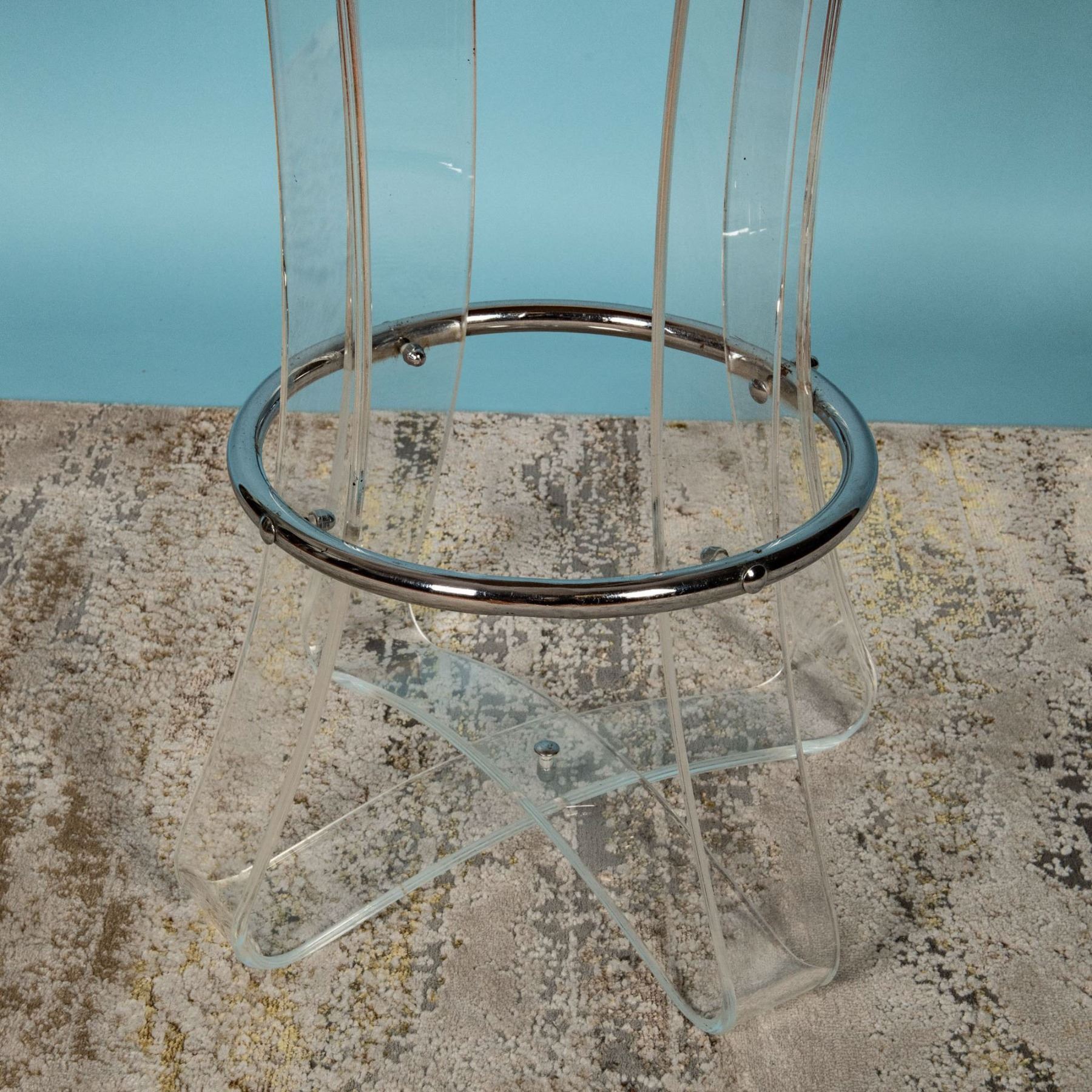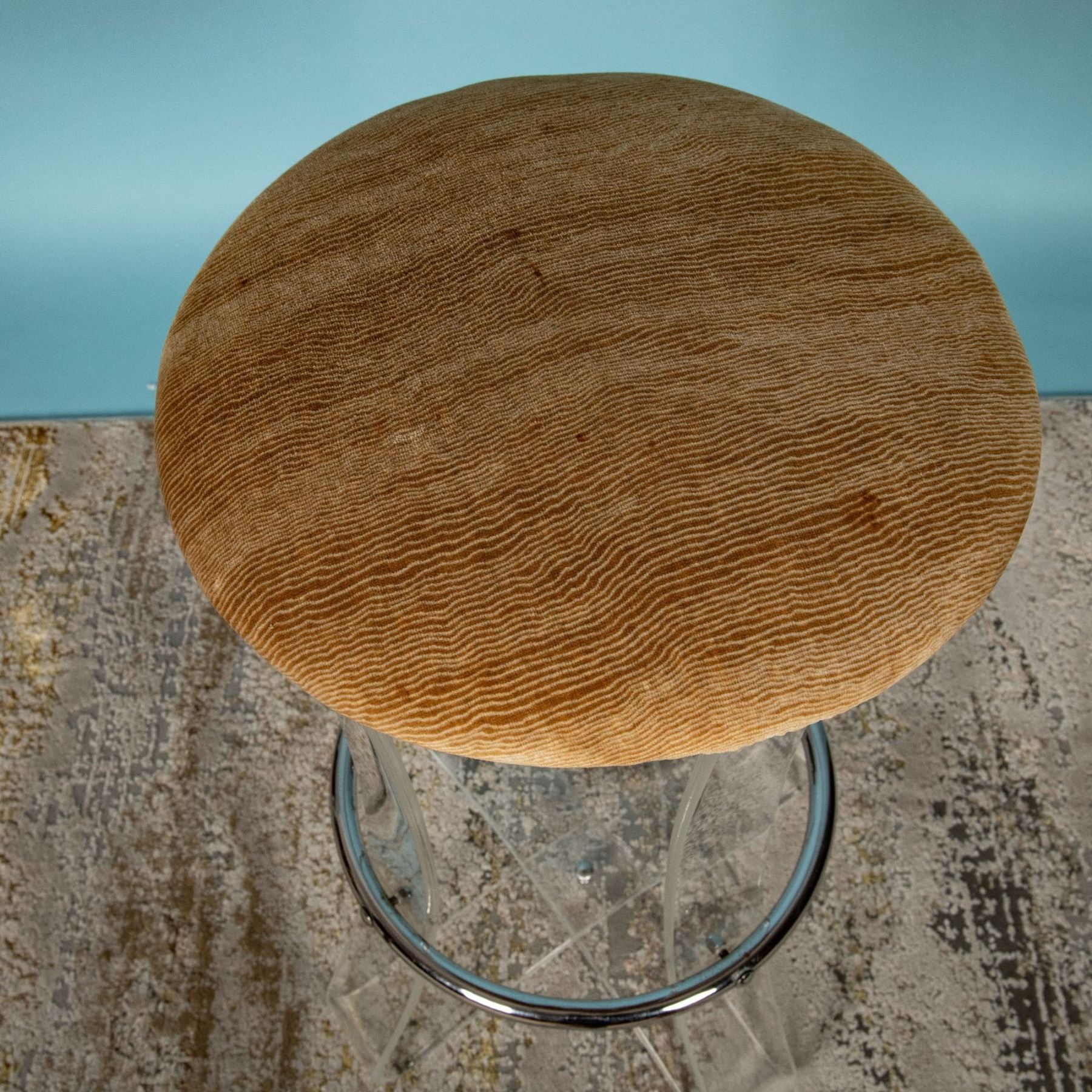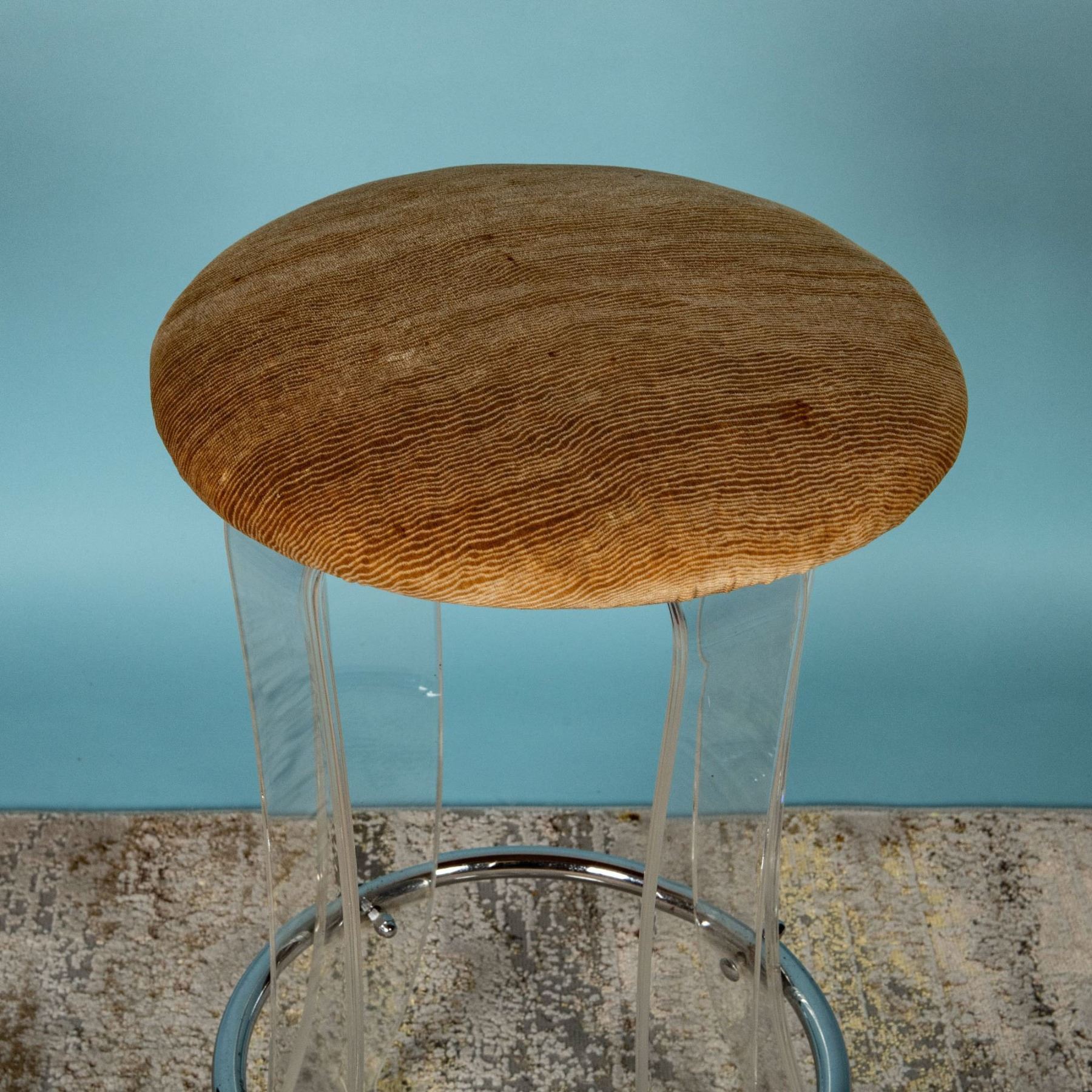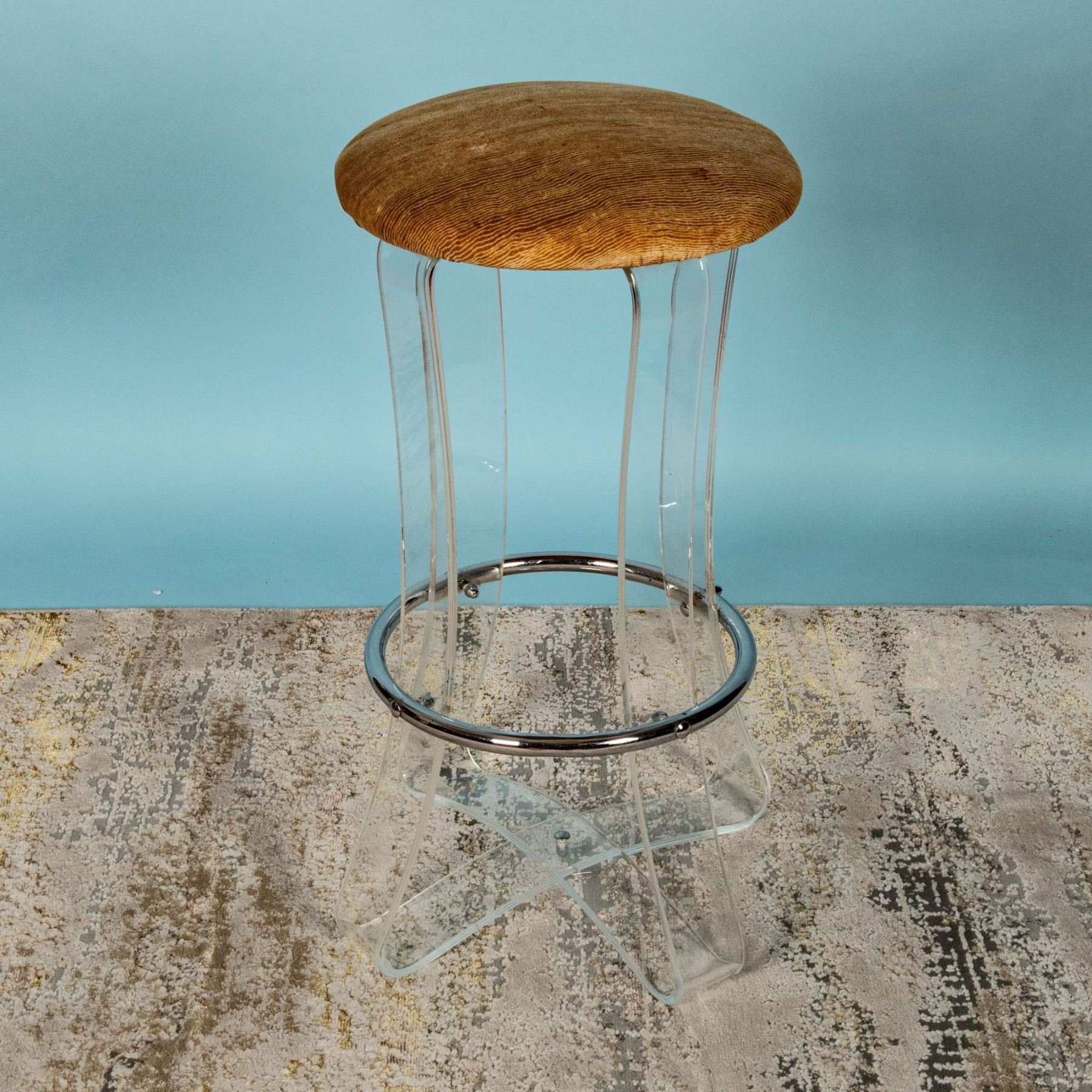 A stylish and rare Mid-Century Modern bar stool crafted by Karmel Plastics, a pioneering manufacturer known for its innovative use of acrylics and lucite during the mid-20th century. Karmel Plastics played a significant role in popularizing lucite furniture, blending durability with sleek, modernist aesthetics. This stool features a high-quality lucite frame with chamfered, curved legs that showcase clean lines and a minimalist design. The chrome circular footrest enhances both functionality and visual appeal. Topped with a plush, caramel-colored velvet cushion, this piece combines comfort with sophisticated design. The stool exemplifies the innovation of mid-century design, making it a sought-after collectible for interior design enthusiasts. Its lightweight yet sturdy lucite construction demonstrates the era's fascination with new materials and minimalist forms. 28.50 inches in height x 18 inches in diameter.
