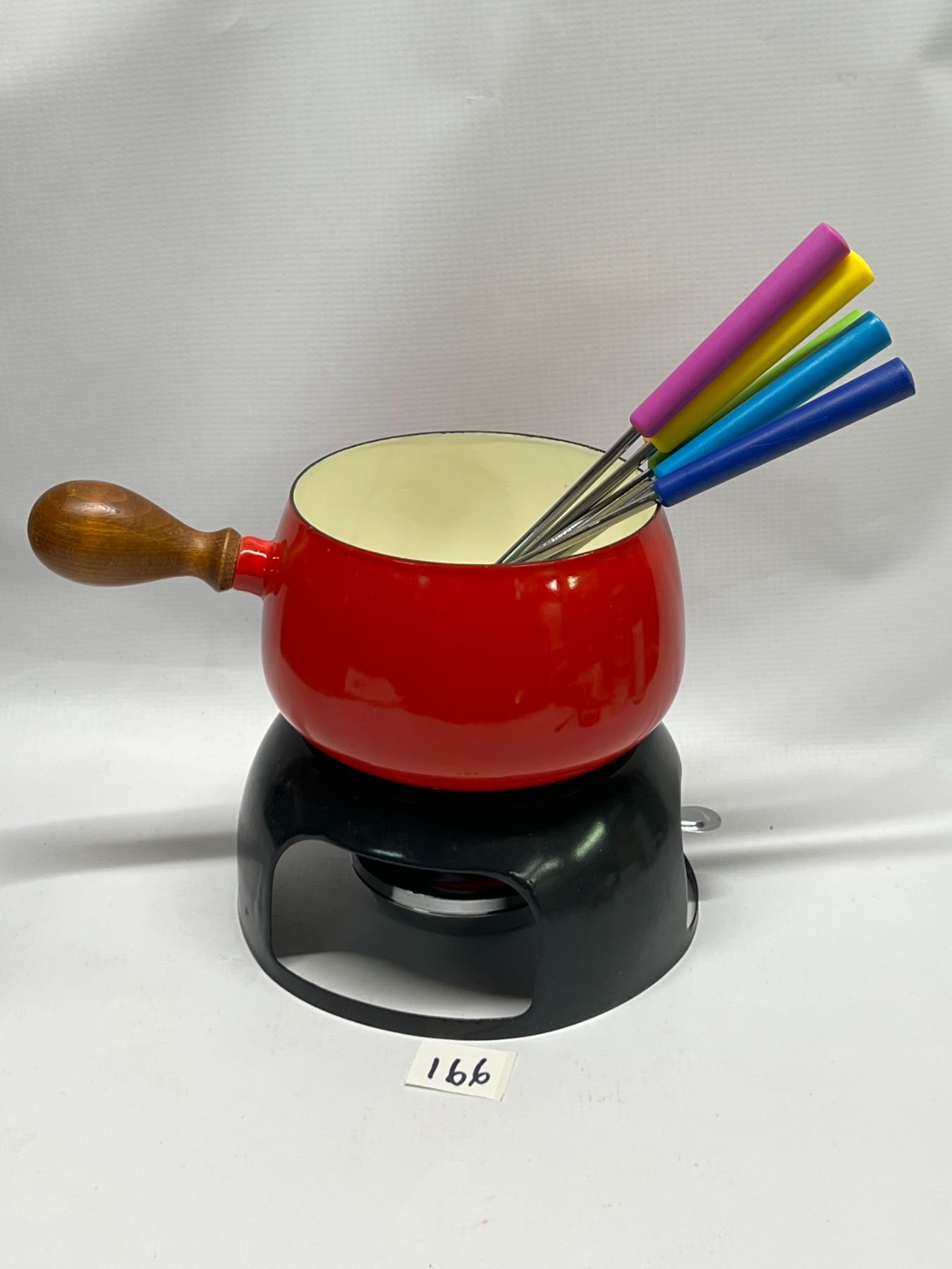 Mid Century Metal / Red Enamel Fondue Set w/Forks Approx: 7"T 9.25"W