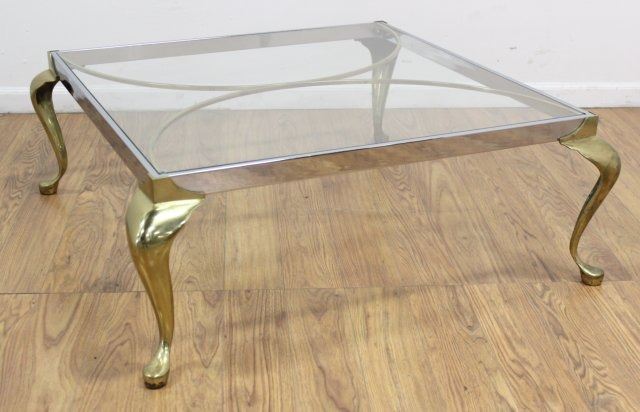 Gilt brass and chrome. Glass top. Approx. 14 1/2" H x 38" W x 38" D.
