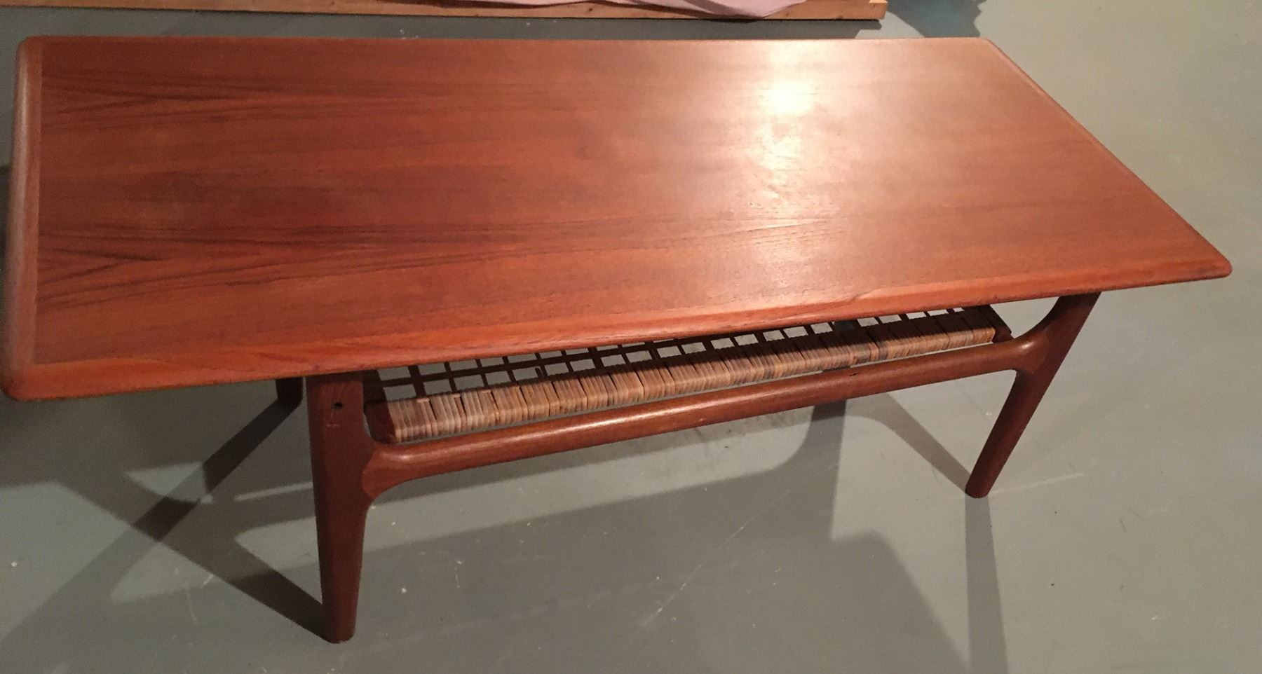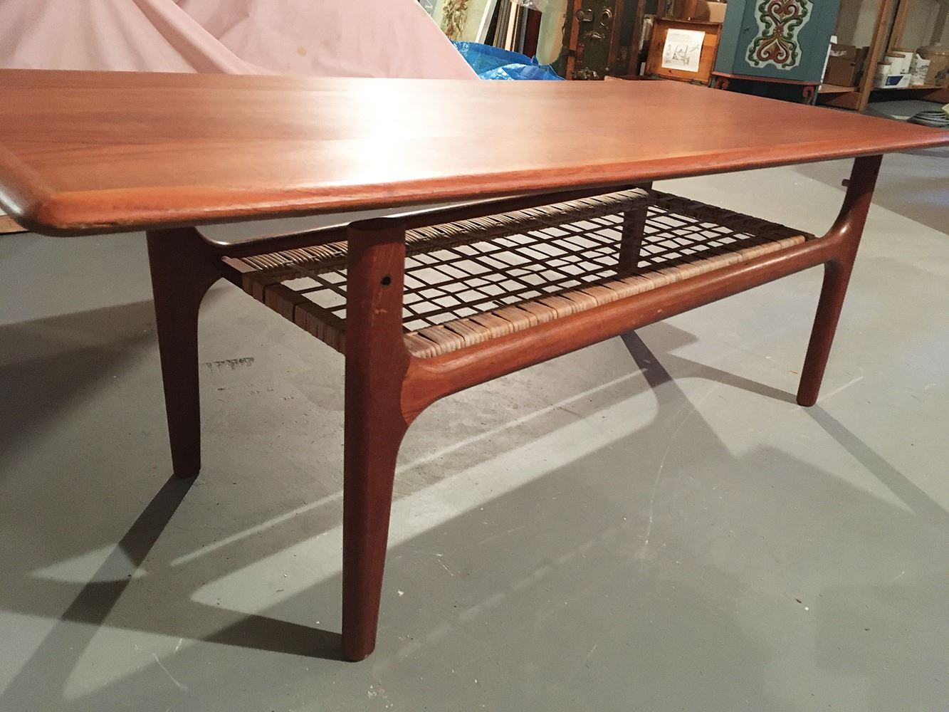 Mid-Centry modern coffee table with caned shelf, measures approx. 47 inches x 20.5 inches x 17 inches.