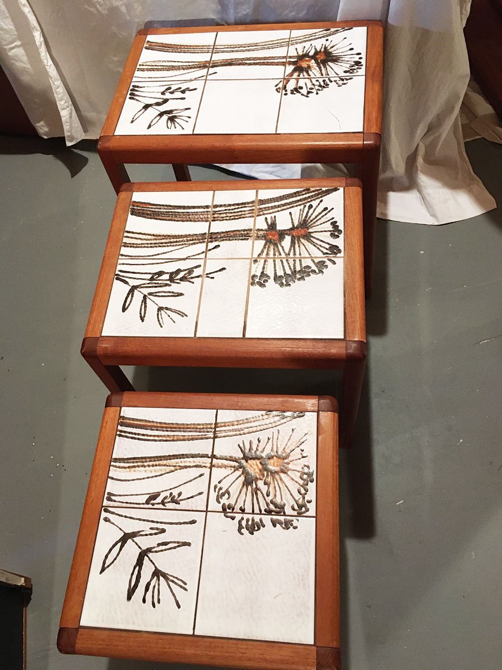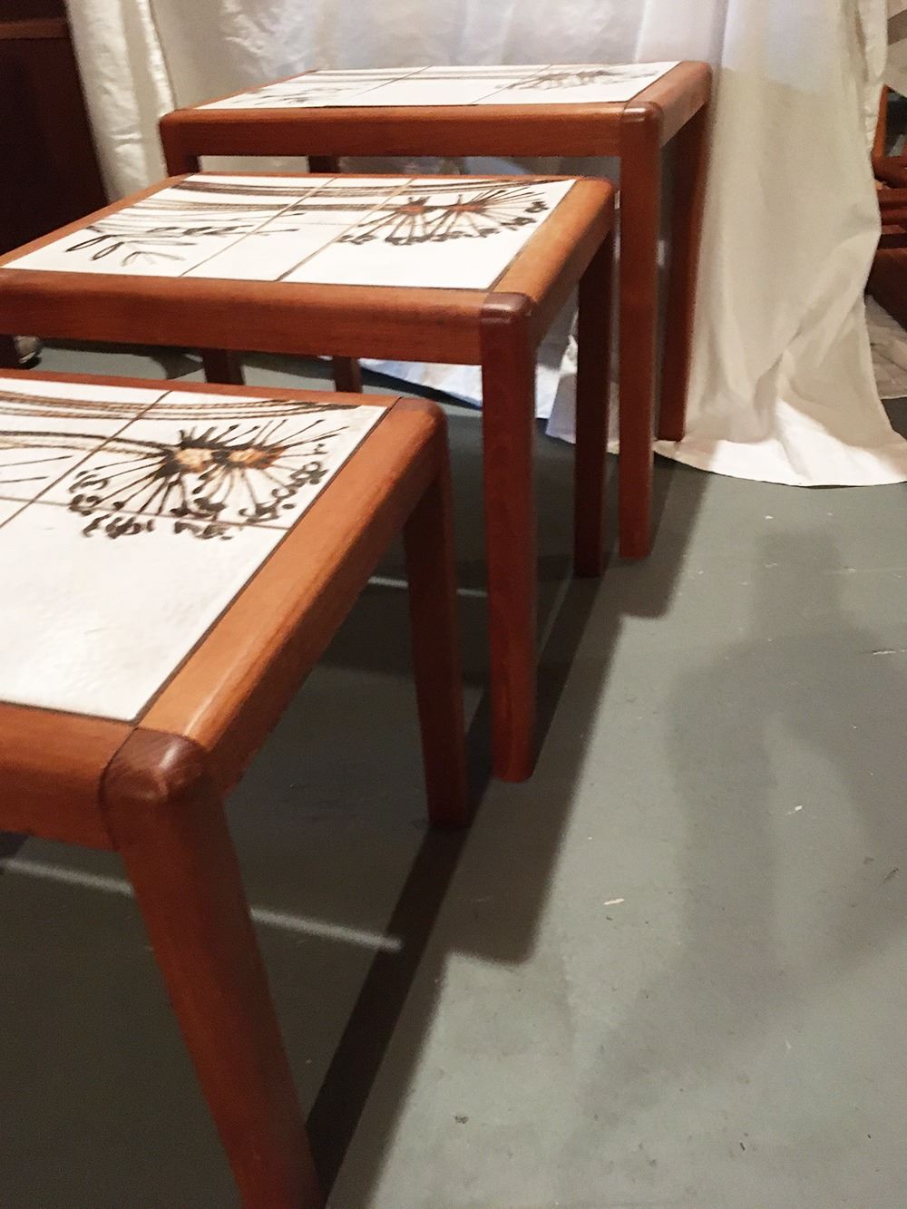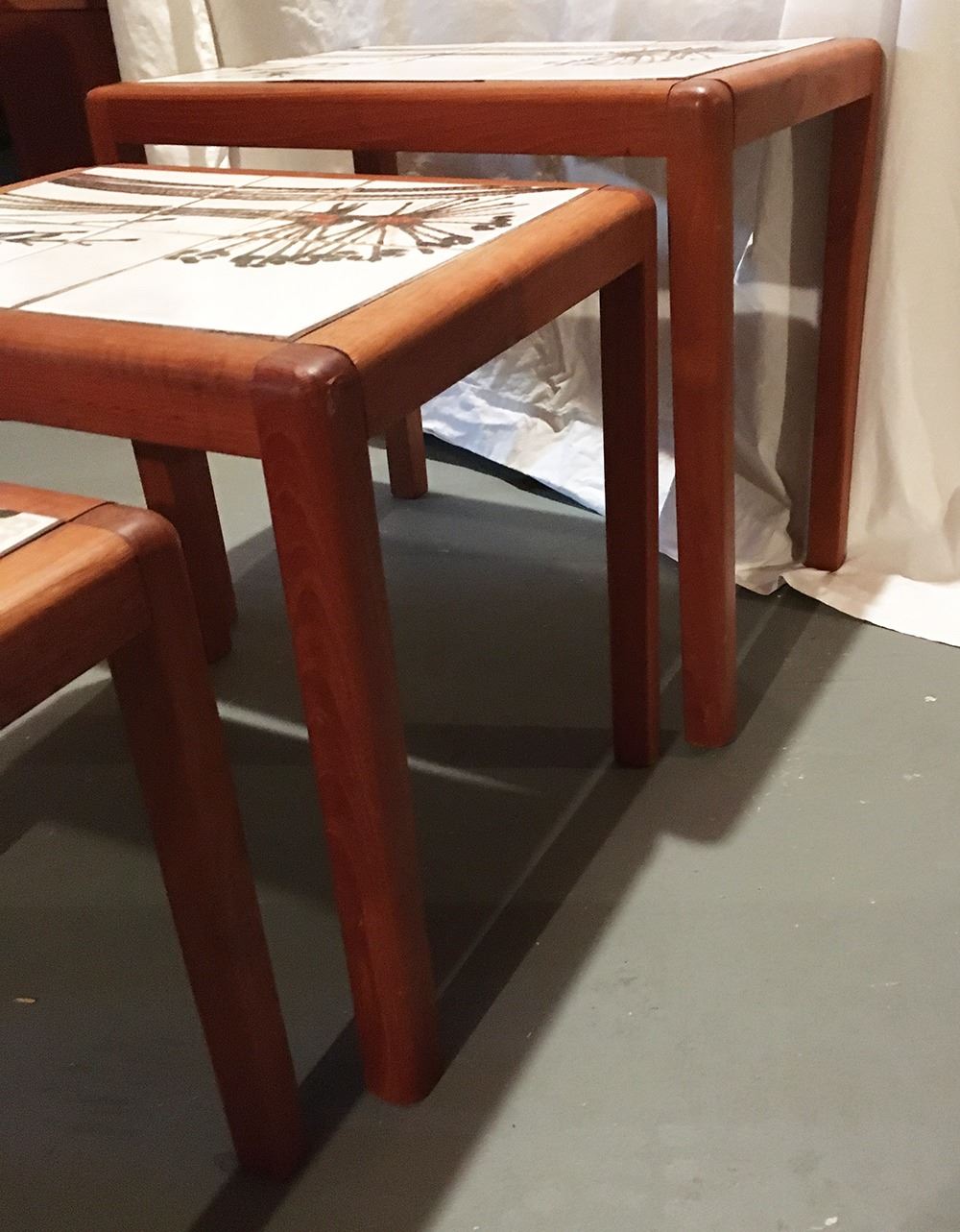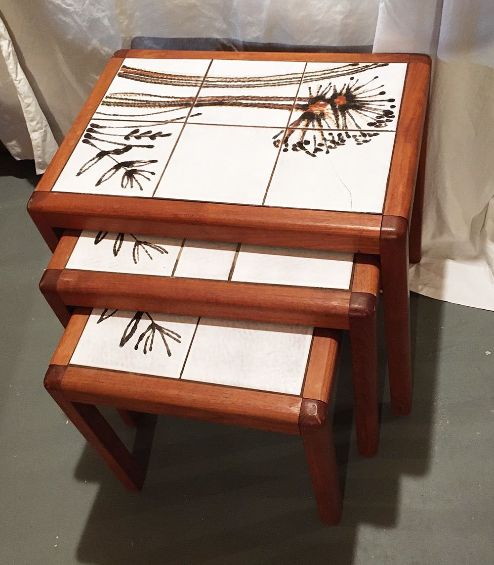 Vintage Toften Mobelfabrikken Danish Mid-Centry Modern tile top nesting tables, set of 3, largest table measures approx. 20 inches x 14.5 inches x 18 inches, largest has a small crack in tile.