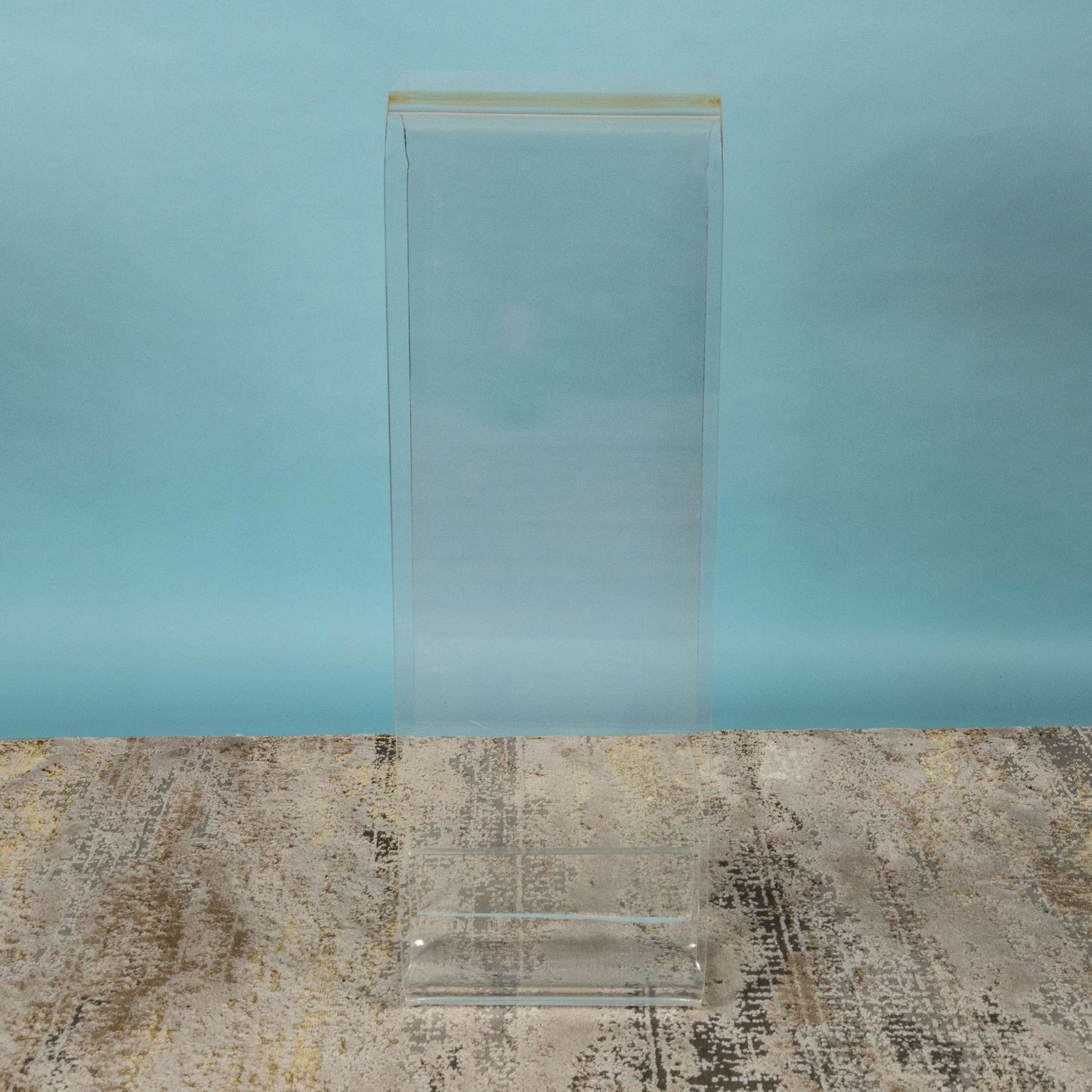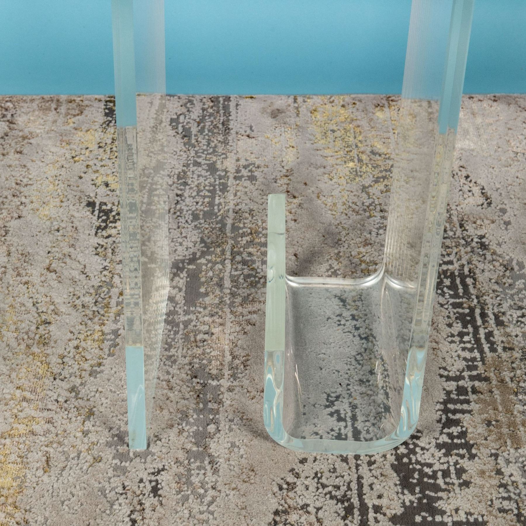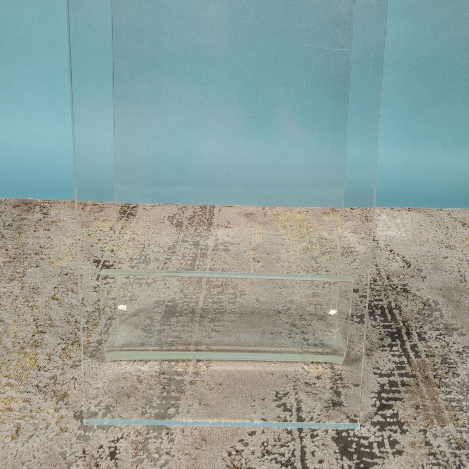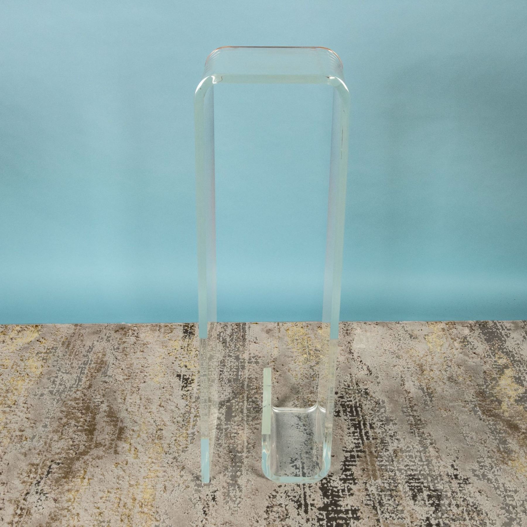 A minimalist and chic Mid-Century Modern Lucite side table that doubles as a stand. This elegant piece features a clean and streamlined design, with smoothly curved corners and a distinctive chamfered edge along one side of the base. Constructed entirely of clear Lucite, it showcases a transparent aesthetic that complements a wide range of interior styles, from retro-modern to contemporary minimalist. The table's versatile dimensions make it suitable for use as a side table, display stand, or decorative accent piece. Its lightweight yet durable construction reflects the innovative use of acrylic materials popularized during the mid-20th century.