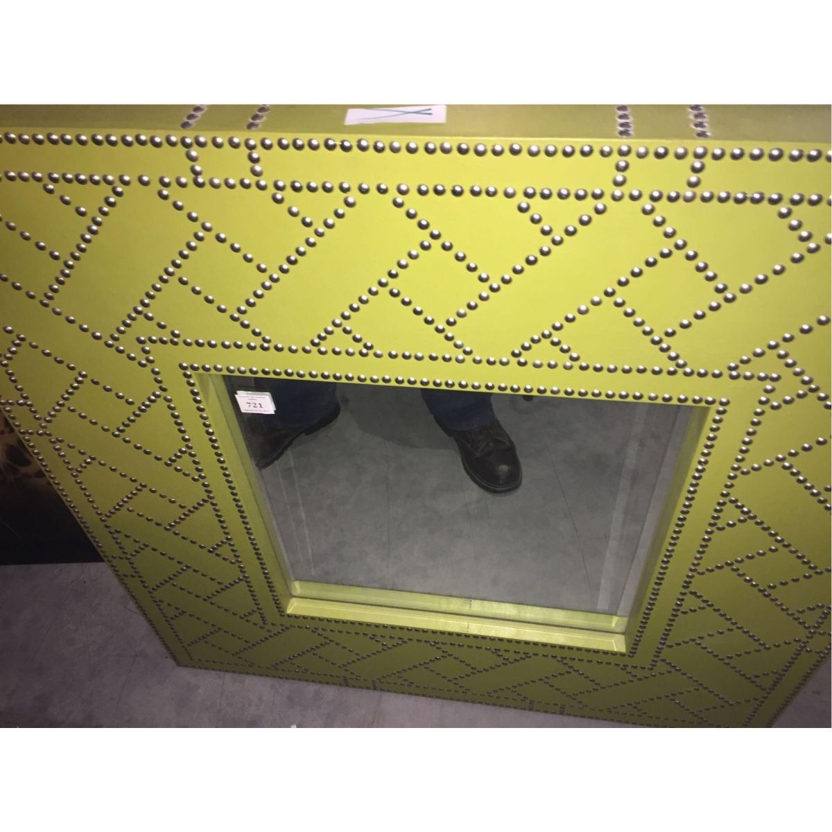 Mid-Century Modern designer style, vintage green colored studded framed mirror.Measures about 30"x30" square.