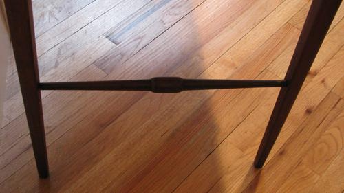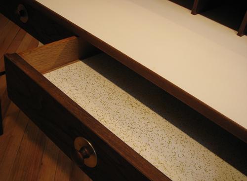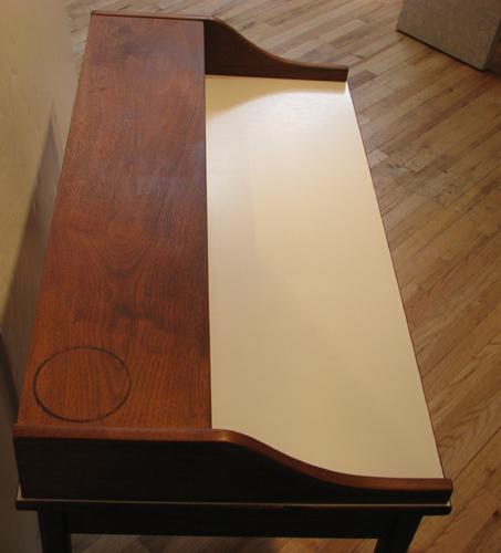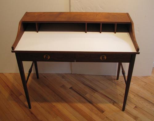Title: Mid Century Modern Desk with formica top, two drawers, mail slots, brass pulls, finished back