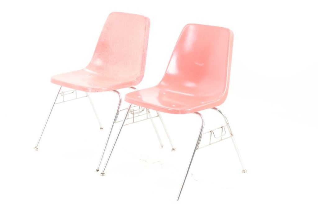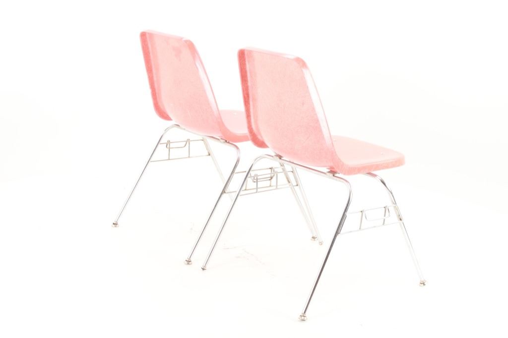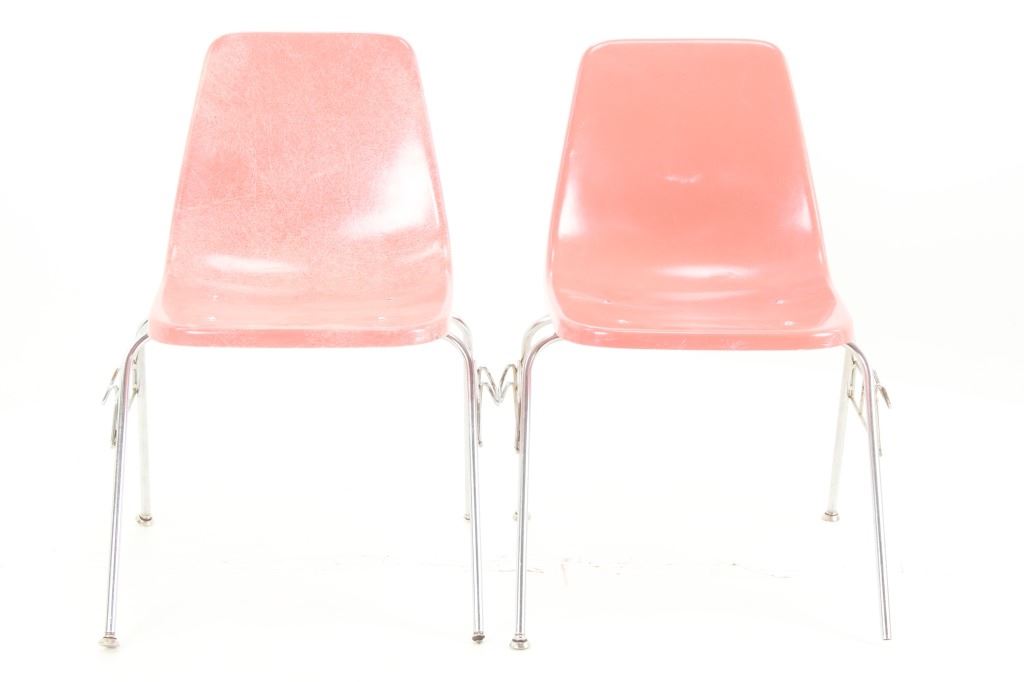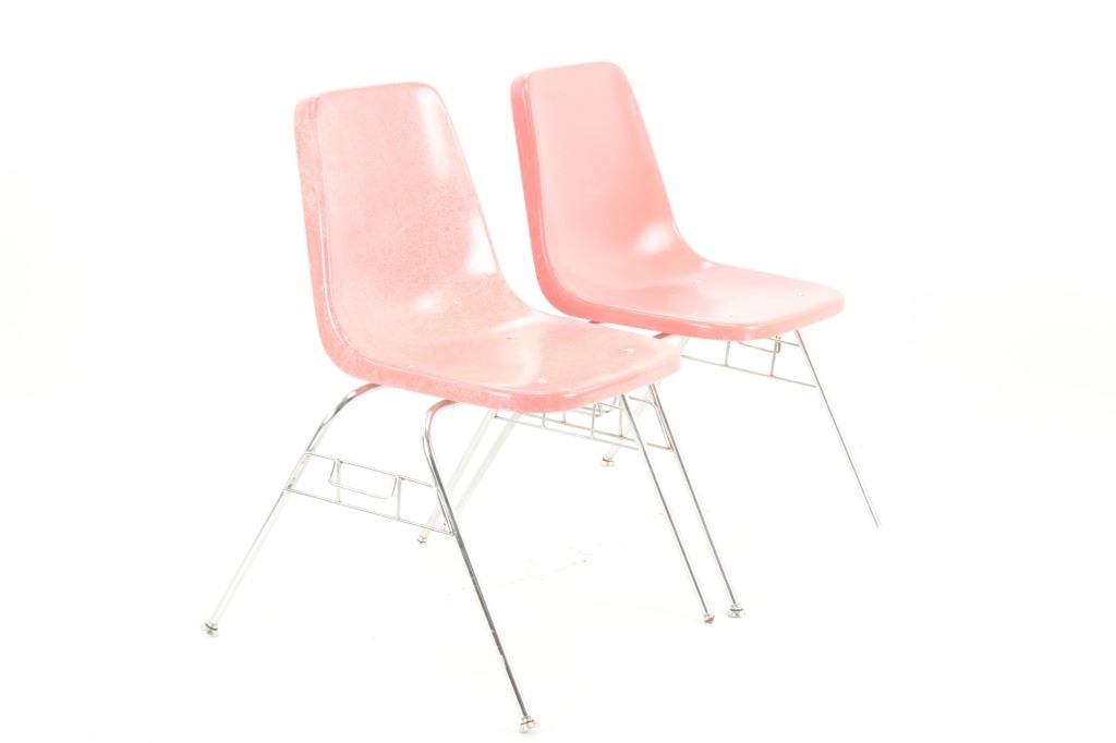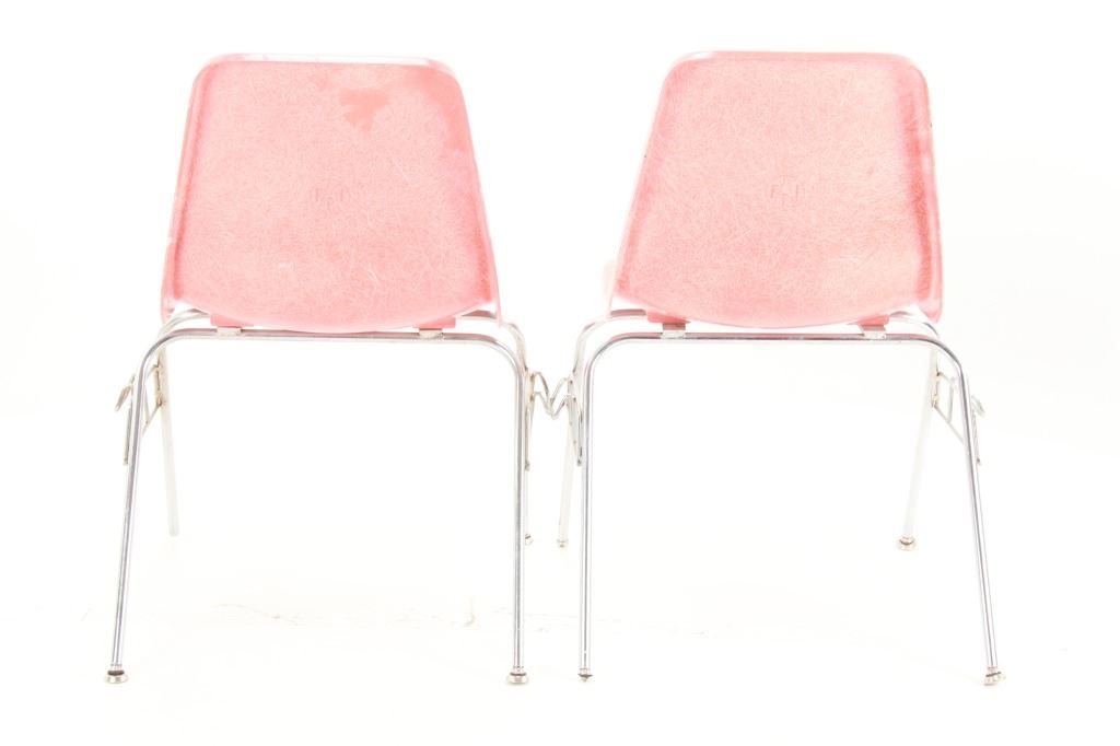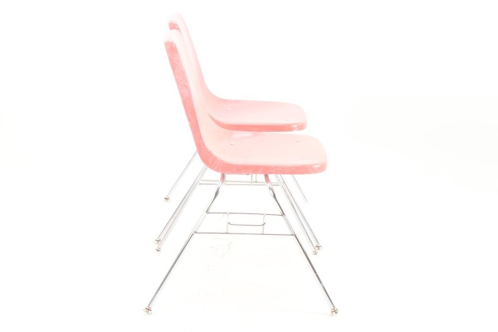 Featured are a pair (2) of Mid-Century Modern , Eames style stacking and interlocking molded plastic shell chairs, circa 1950's. Orange fiberglass molded chairs that stack and can be interlocked at the sides to create a row. Metal legs have a "U" shape for interlocking. Chairs are in fair to good condition, able to be used for their intended purpose. Dimensions of each chair are 20"W x 32"H