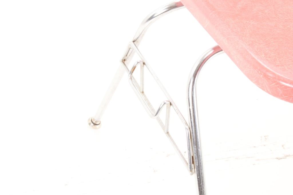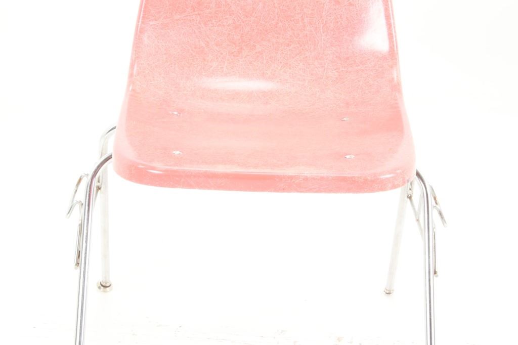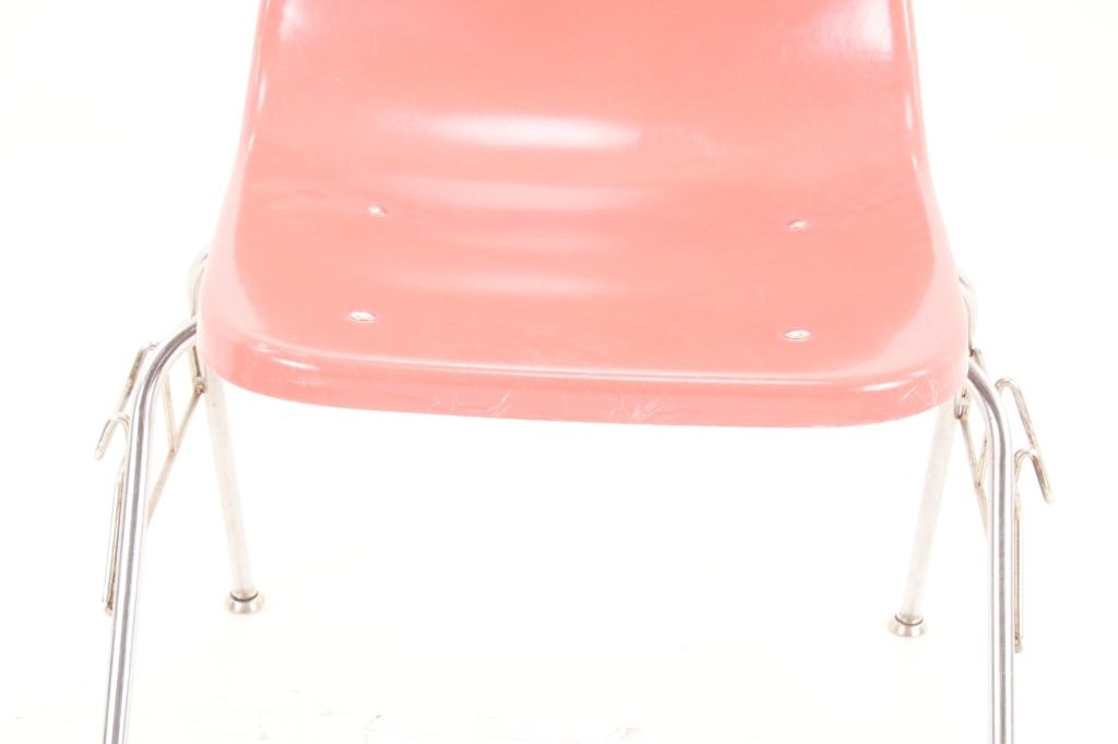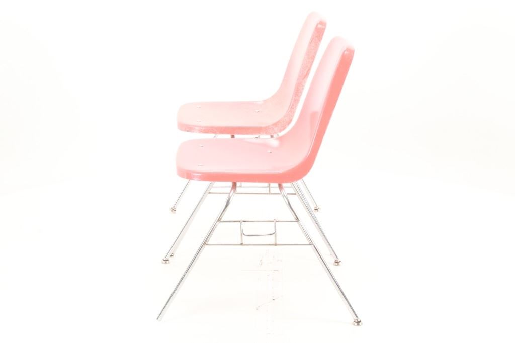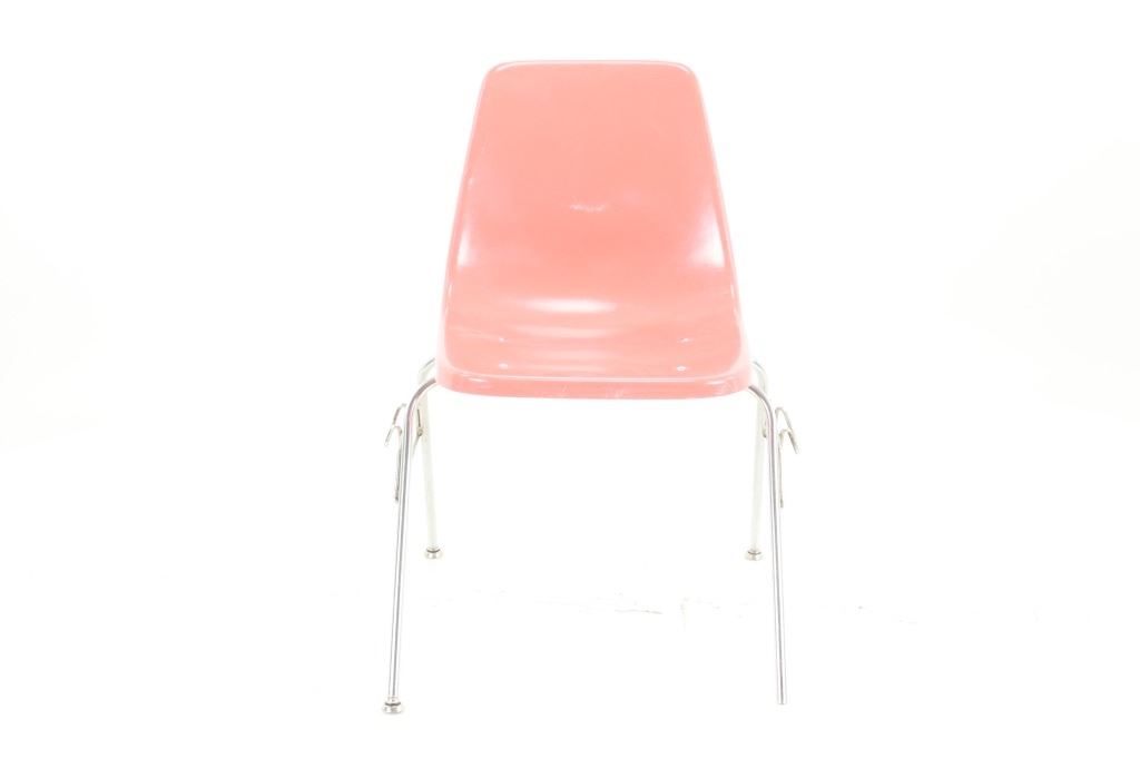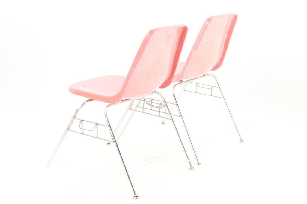 Featured are a pair (2) of Mid-Century Modern , Eames style stacking and interlocking molded plastic shell chairs, circa 1950's. Orange fiberglass molded chairs that stack and can be interlocked at the sides to create a row. Metal legs have a "U" shape for interlocking. Chairs are in fair to good condition, able to be used for their intended purpose. Dimensions of each chair are 20"W x 32"H