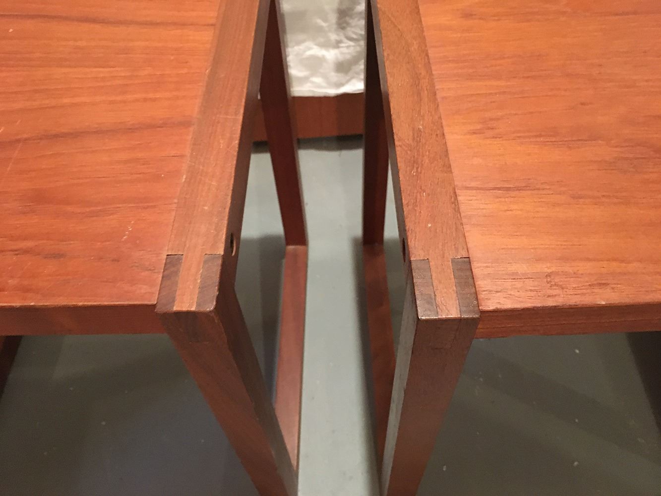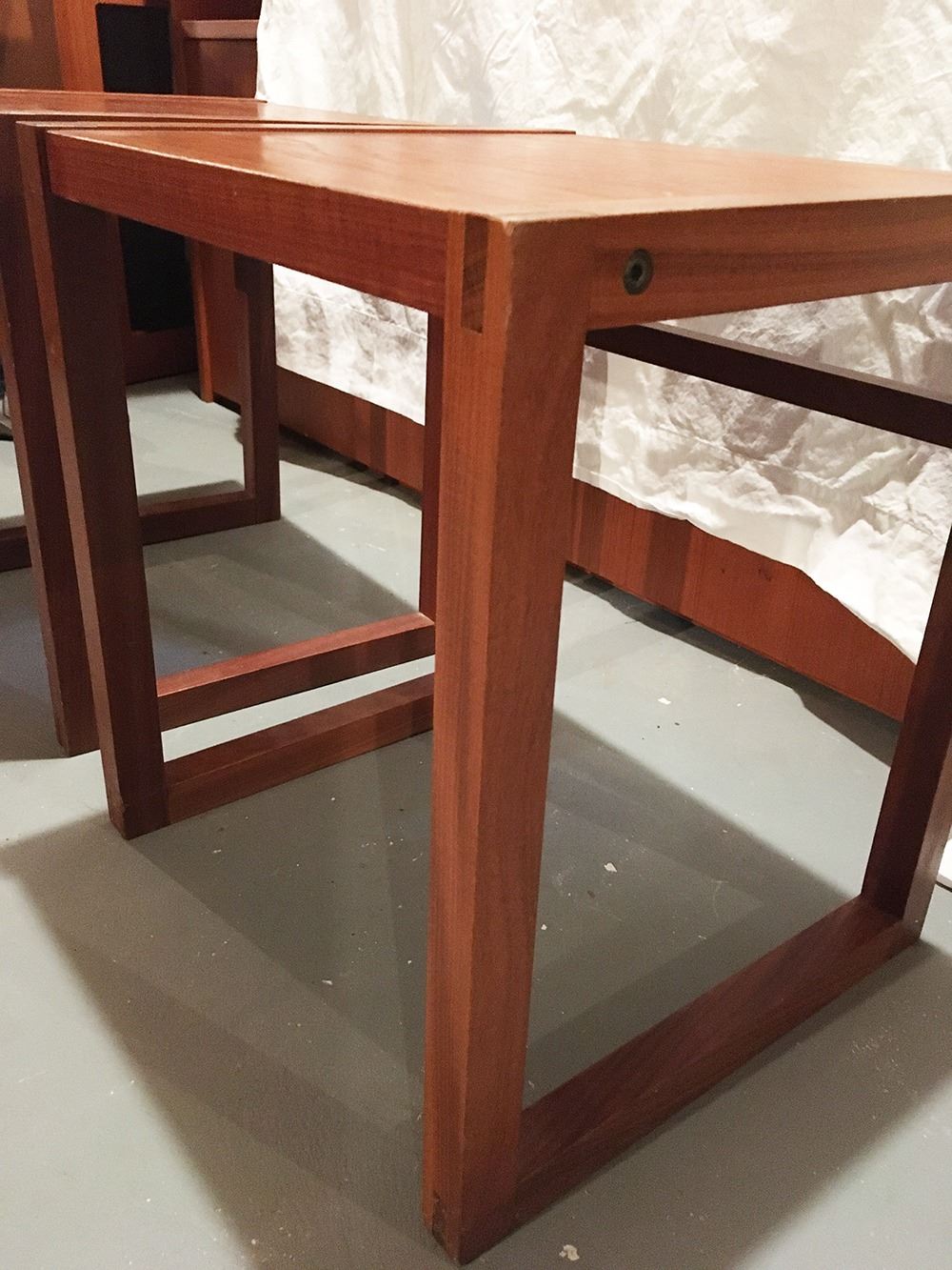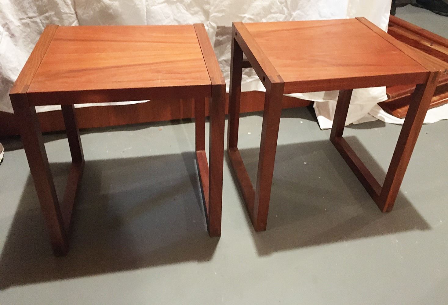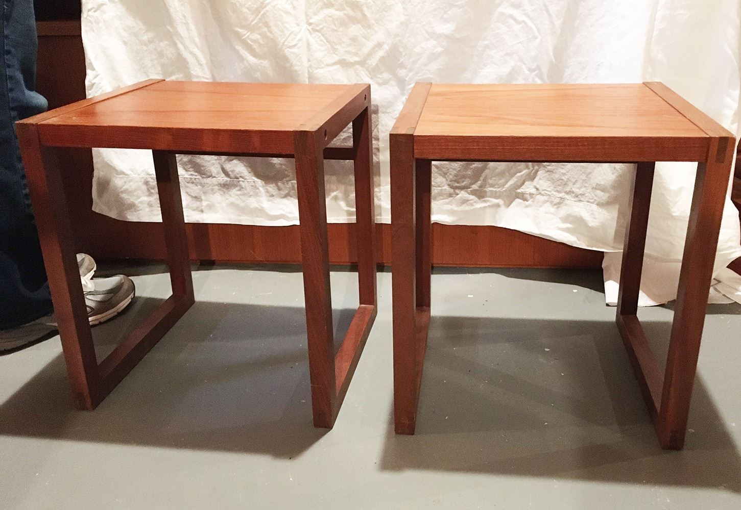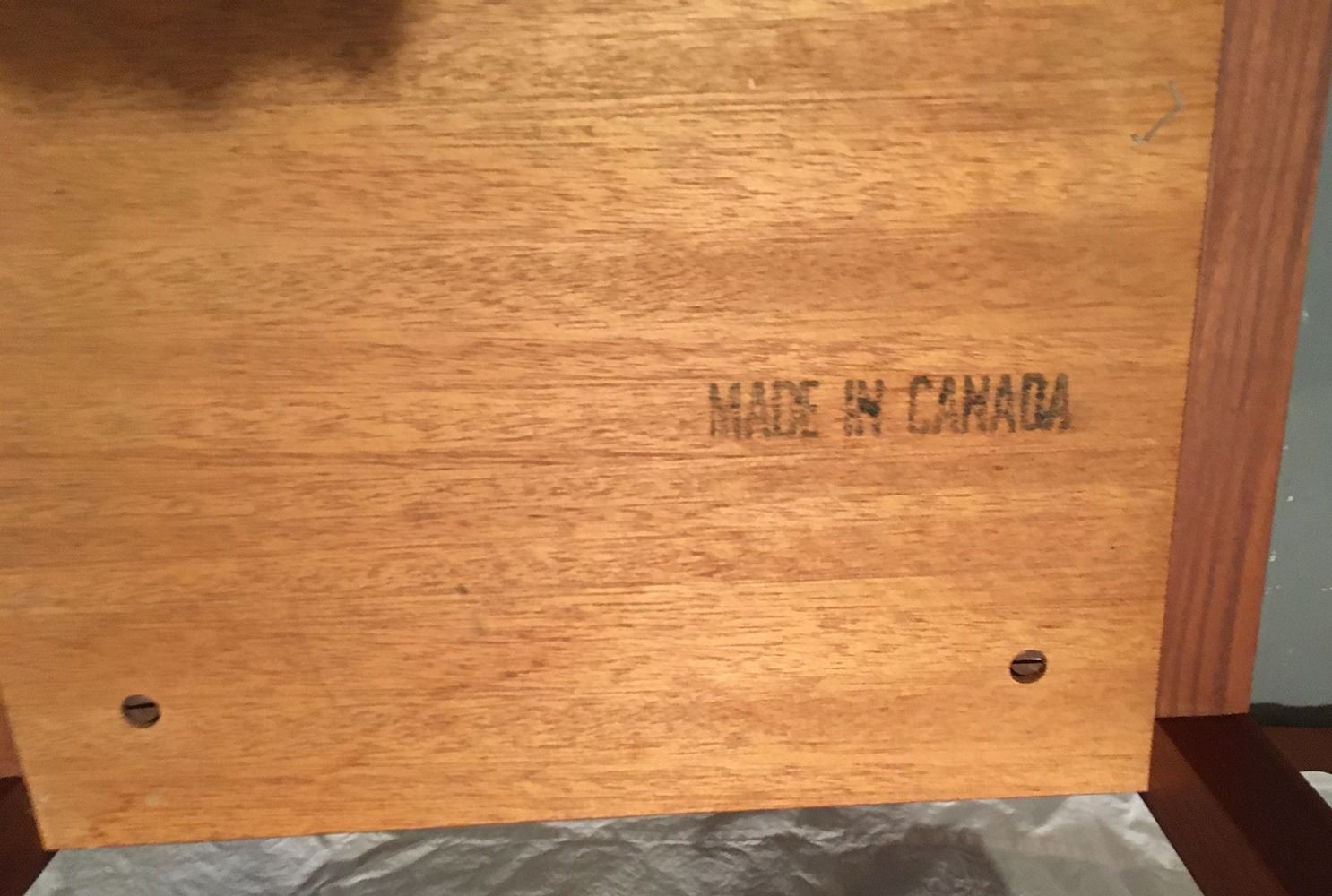Pair of matching Mid-Centry Modern end tables, Made in Canada, measure approx. 15 inches by 13.75 inches x 17 inches.