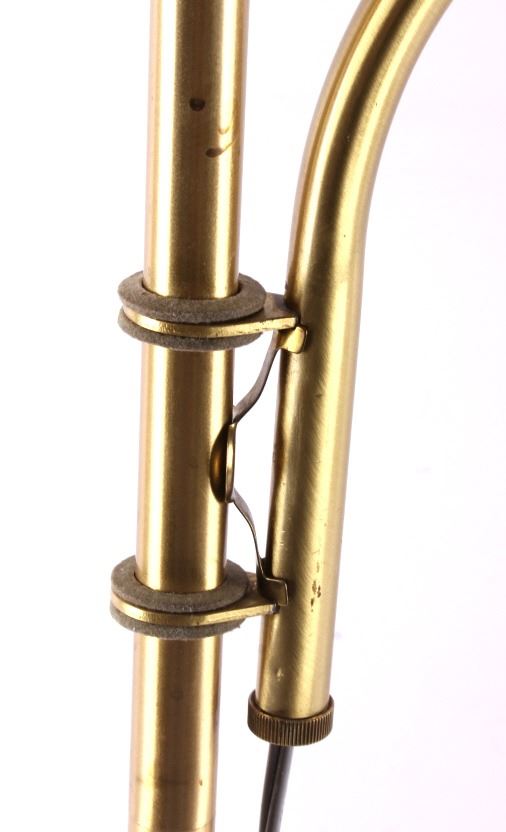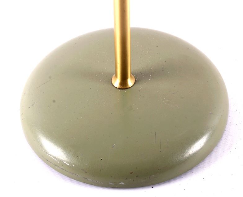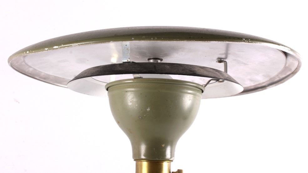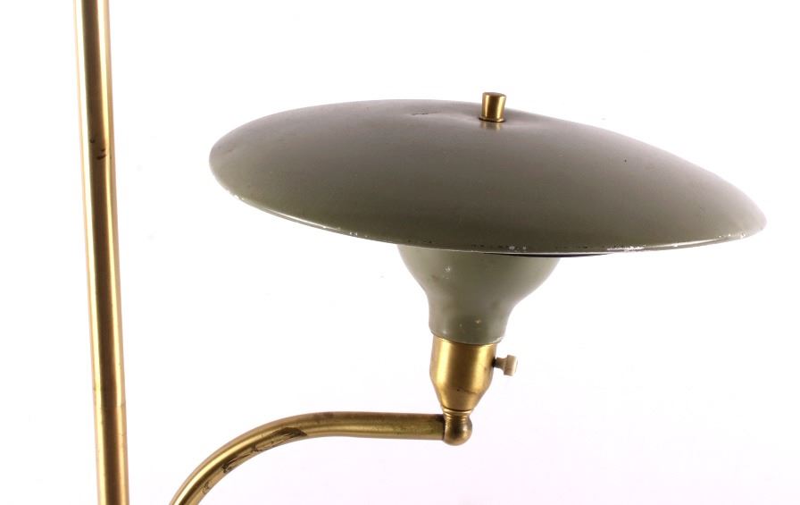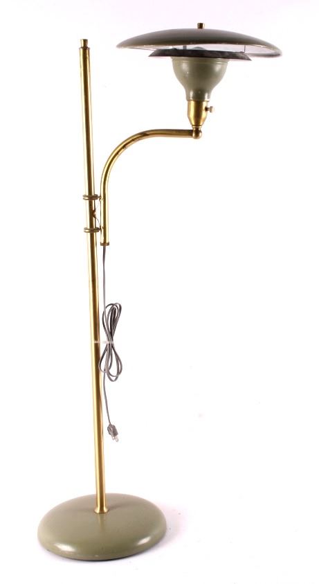 This is a Mid Century Modern flying saucer floor lamp. The lamp features a disk shaped shade and matching base. The height of the lamp is adjustable. The lamp shows good overall condition. It measures 12" in diameter and can be adjusted to 49.5" tall.