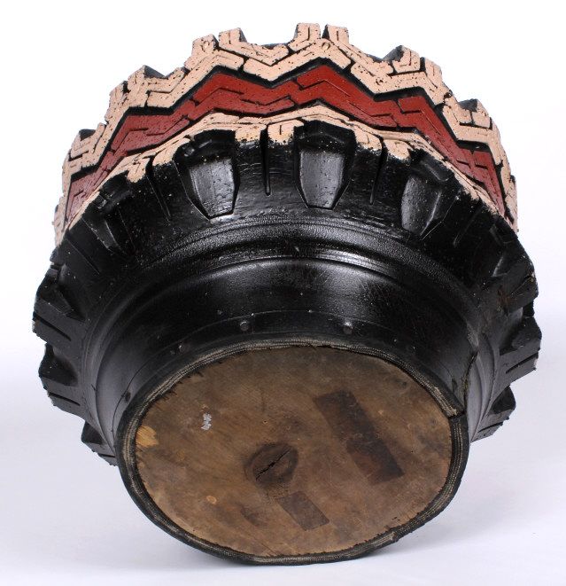 This is an original artwork that is a unique one of a kind design made from a truck tire and hand painted. This has been crafted very well and the light earth tone paints bring out the natural Southwest Design in the tire tread. The Artwork could be used as a centerpiece or planter. Pete is a Amsterdam, Montana artist. The piece is made in the mid 20th century. The dimensions