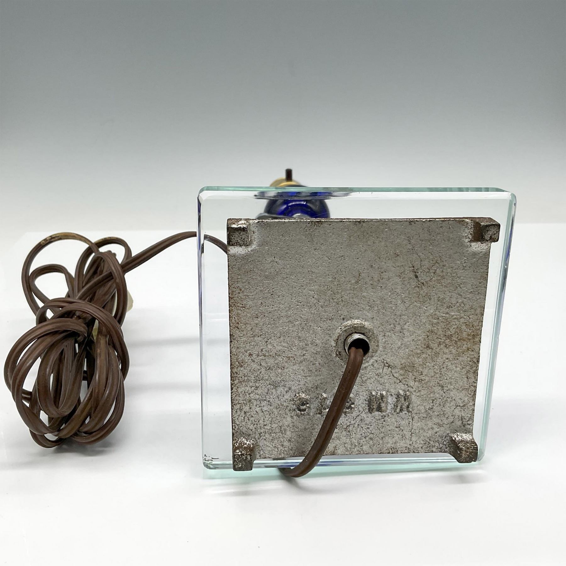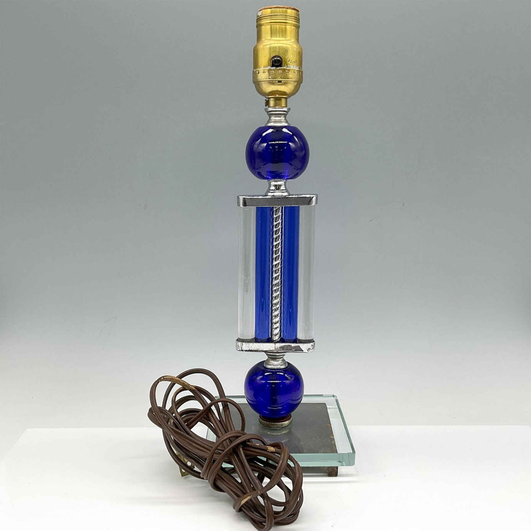 Cobalt blue accent balls with center clear and blue glass design set on clear thick glass base. Toggle switch on neck. MM 375 engraved on base.