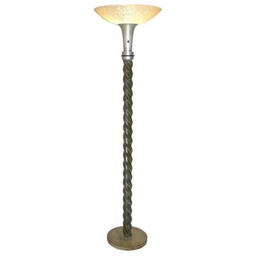 This unique mid-century floor lamp, circa 1950s, features a beautiful limed walnut pedestal with twisted carved shape and rich green stain, topped with an aluminum fixture frame and its original glass shade. Fine working order. Measures 67.5" high and 17.5" across. This lamp resides on the upper west side of Manhattan ( New York city ) and may be seen by appointment. Thanks for visiting. Please let us know if you have any questions or comments.