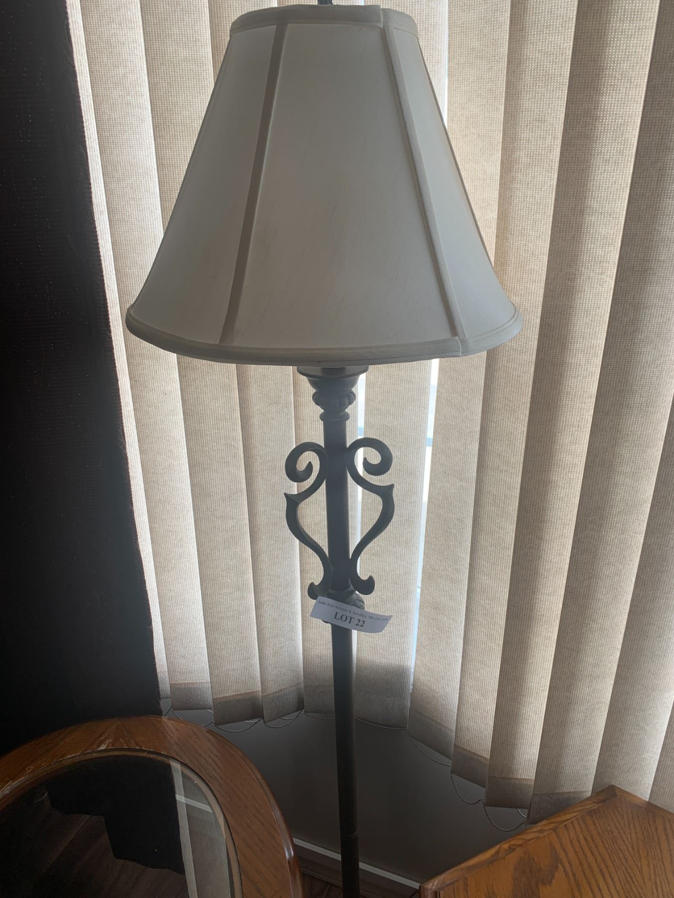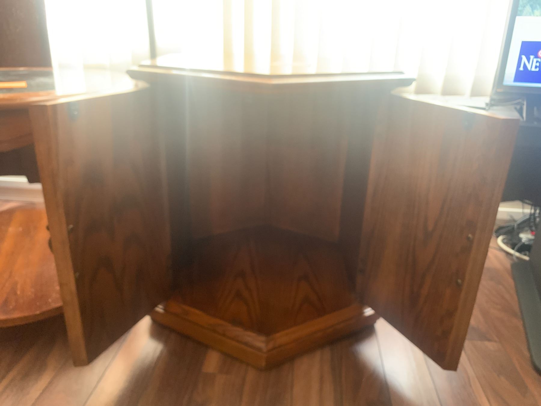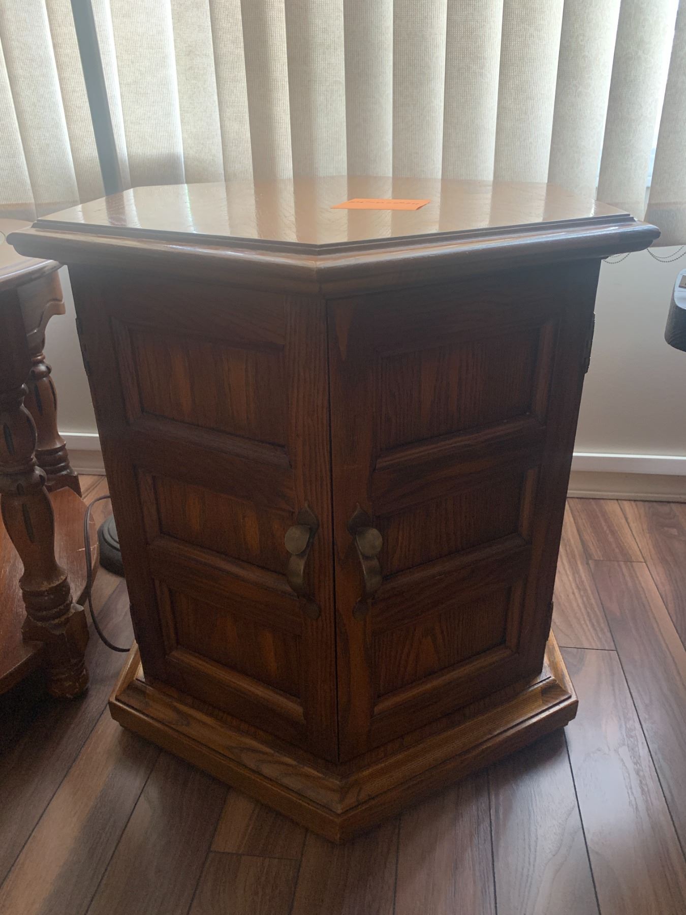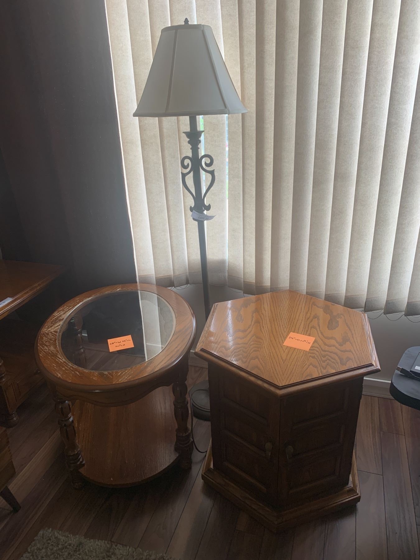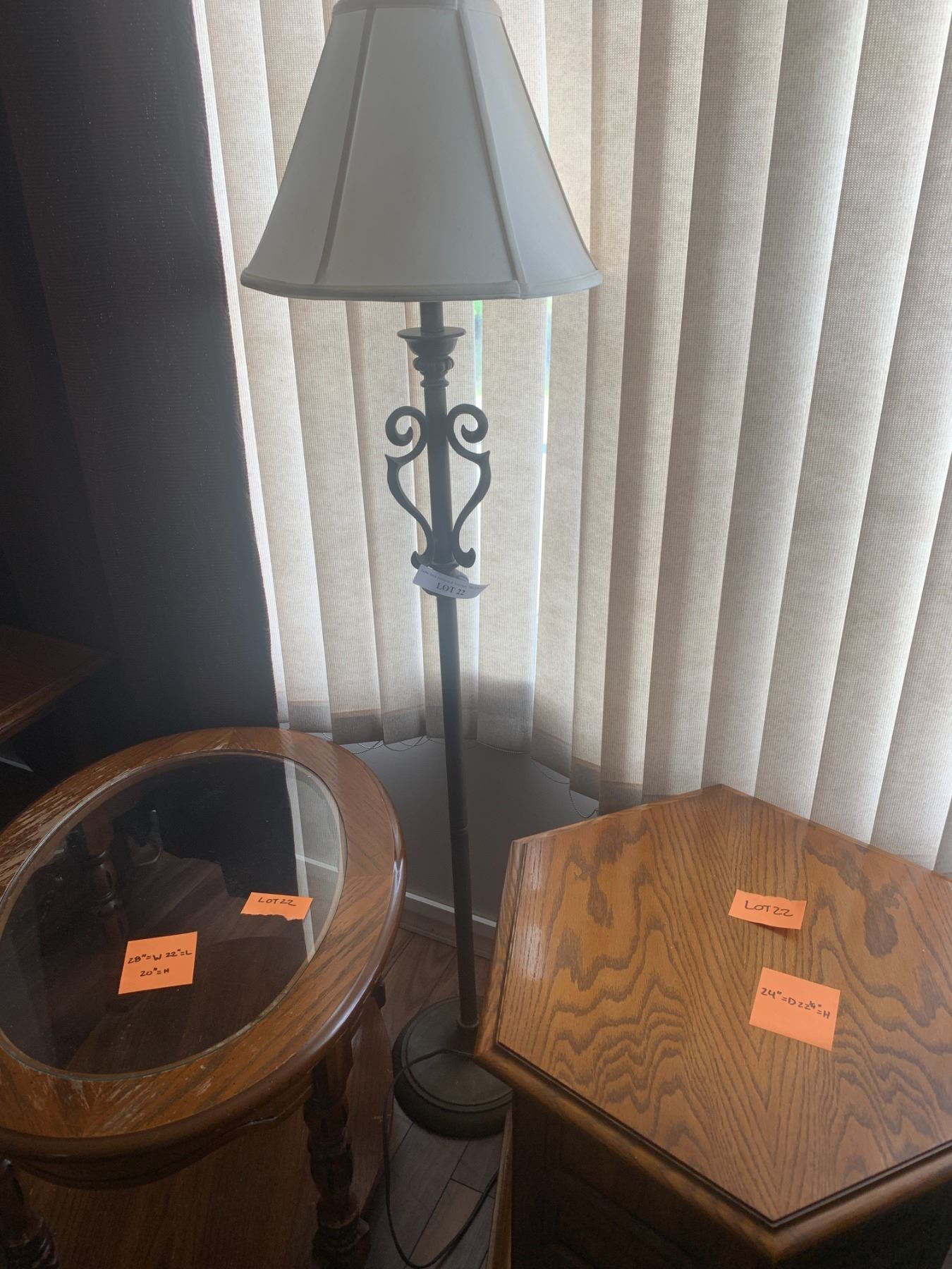 Mid Century Modern Hexagonal Table w Storage, Wood & Glass End Table & Metal Floor Lamp