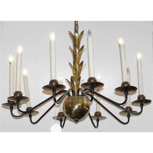 This vintage polished brass and black enamel chandelier features 10 lighted arms and a center stalk with lotus flower motif. Measures 26" across and 19" high, and 30" high including hanging chain and ceiling plate. Likely dates from the 1950s or 1960s. Designer and maker are not known. Possibly of Italian origin. This item resides in Chelsea in Manhattan ( New York City ) and may be seen by appointment. Thanks for visiting. Please let us know if you have any questions or comments.