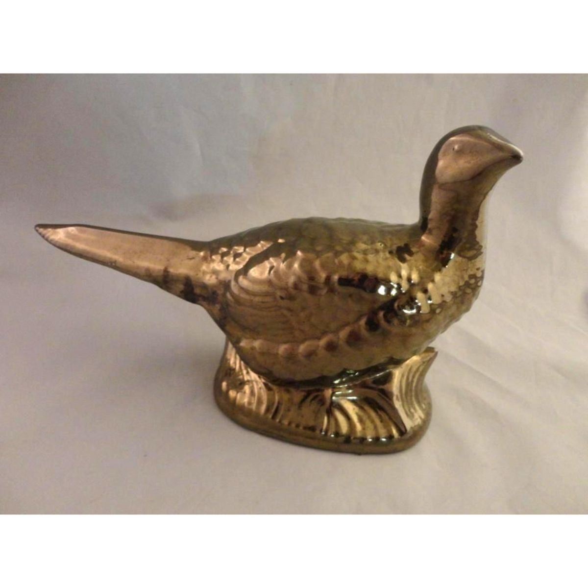 Mid Century modern ceramic, bronzed lusterware hunting figurine, table centerpiece, in the form of a pheasant bird. Signed "arners" on the base. 11" L X 6 1/2" H X 3 3/4' W.