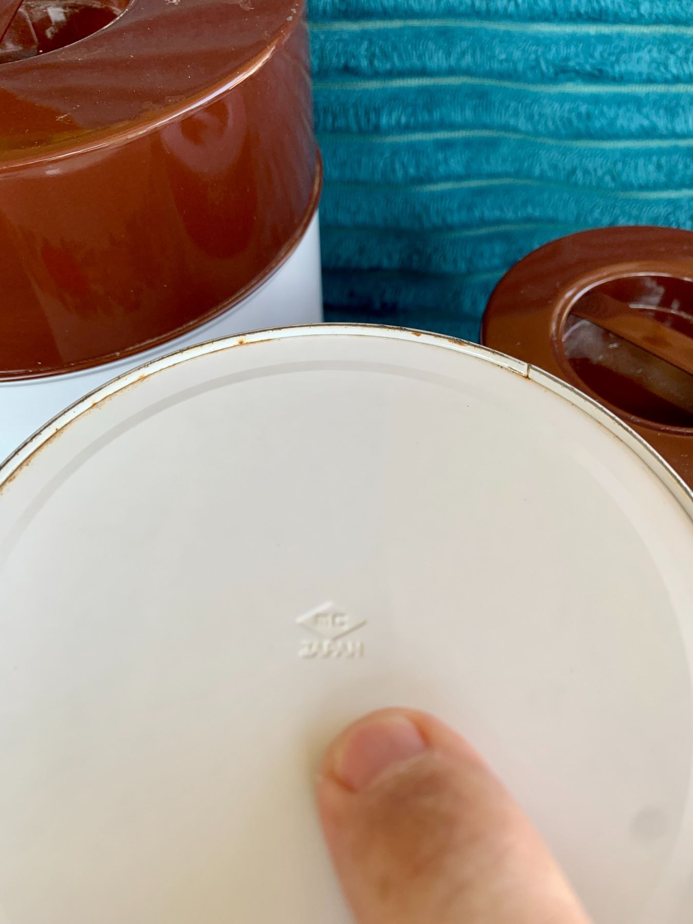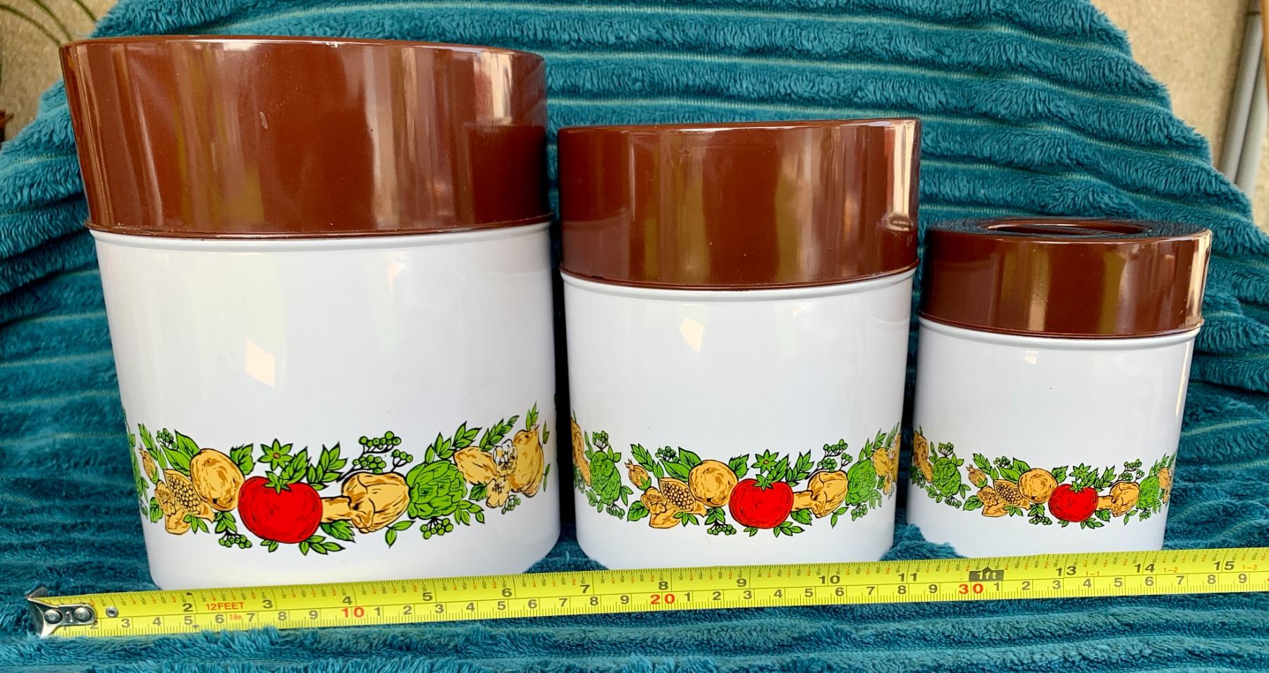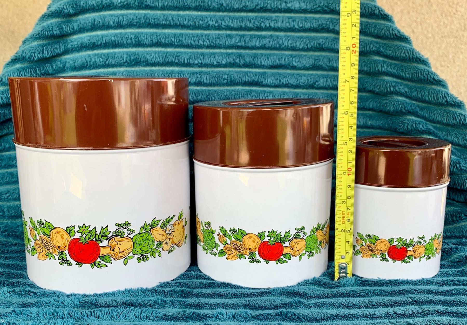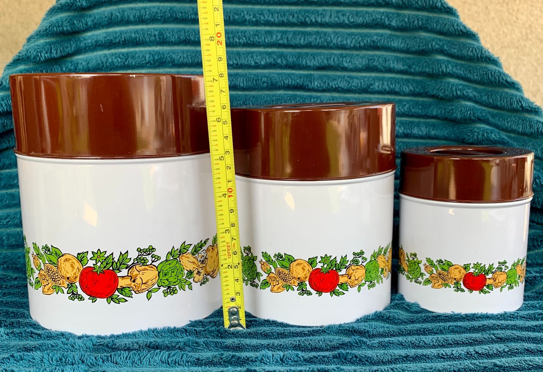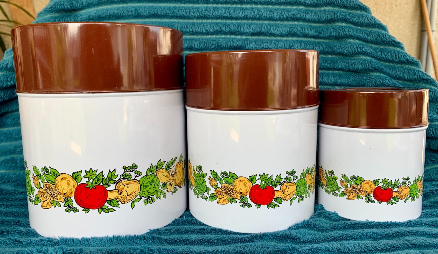 Mid Century Modern Marked MC Japan "Spice of Life" 3-Pc. Tin Enameled Canister Set (Great Condition)