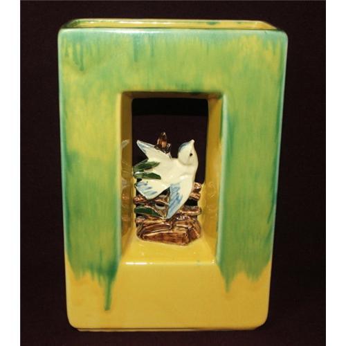 Mid-Century Modern (1951) McCoy 9 3/8 inch Arcature glazed art pottery vase, in greens and yellow with a small inset white and blue bird, in very good to excellent condition. Arcature is an architectural term referring to a small arcade or roofed passageway, which has influenced the design of this piece. This modernistic vase features bright spring colors and clean lines. It measures about 9 3/8 inches high, 6 1/2 inches wide, and 2 7/8 inches deep, and weighs about 3 1/2 pounds. It is in very good to excellent condition, with fine glaze crazing but no chips or cracks. Please refer to the 4 photographs for appearance and condition. Shipping / packaging will be $12.50.