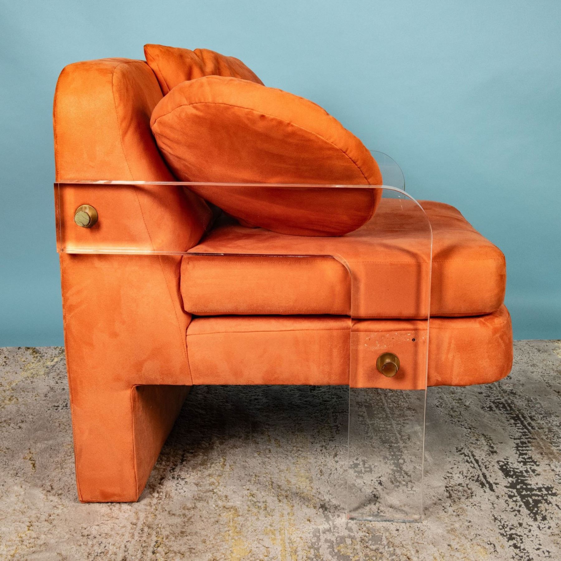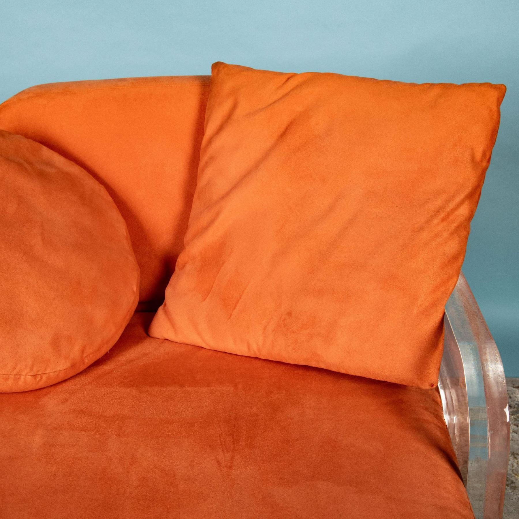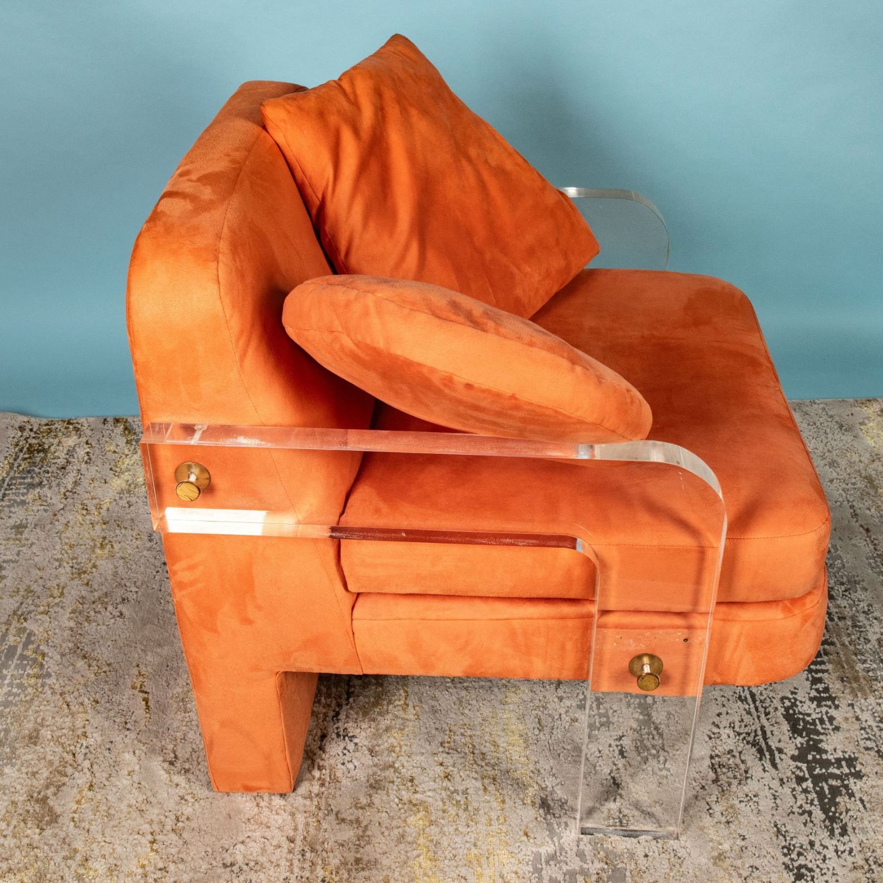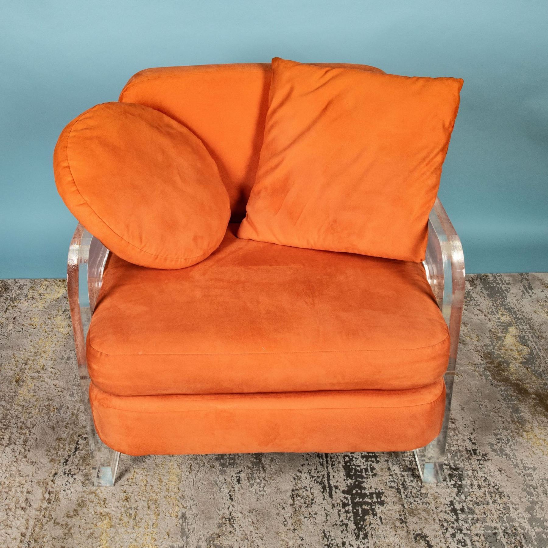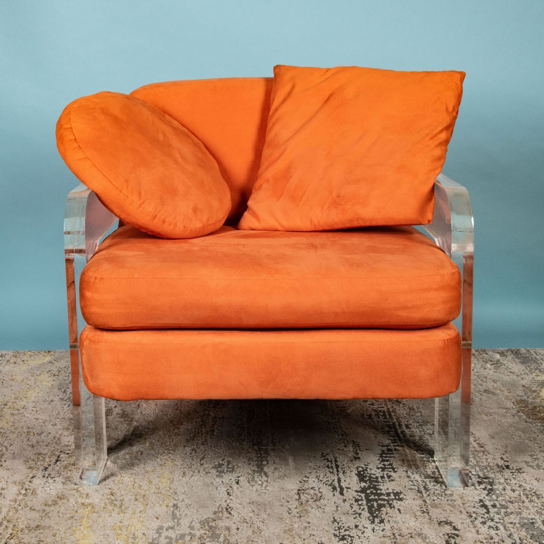 This striking mid-century modern lounge chair captures the innovative spirit of the 20th-century design movement. Upholstered in soft faux suede, the chair boasts a vibrant peach hue, providing a warm, inviting aesthetic. The smooth, curved Lucite armrests exemplify the period's fascination with modern materials, blending sophistication with transparency for a light, airy appearance. Lucite, a hallmark of the 1960s and 1970s, became synonymous with sleek, futuristic design, championed by visionaries like Charles Hollis Jones. The chair's streamlined form and minimalist construction align with the principles of mid-century modern design, which emphasized simplicity, functionality, and the integration of innovative materials. This piece not only serves as a comfortable seating option but also stands as a testament to the era's groundbreaking approach to furniture making. It is accompanied by two throw pillows€”one circular and one square€”for additional style and comfort. Mid-century modern design emerged in the mid-1940s and flourished through the 1960s, revolutionizing interior spaces with its emphasis on affordability, durability, and aesthetic appeal. Lucite, often referred to as Plexiglas, rose to prominence during this time, enabling designers to push creative boundaries. Furniture pieces like this chair epitomize the movement's timeless appeal and adaptability to modern interiors.
