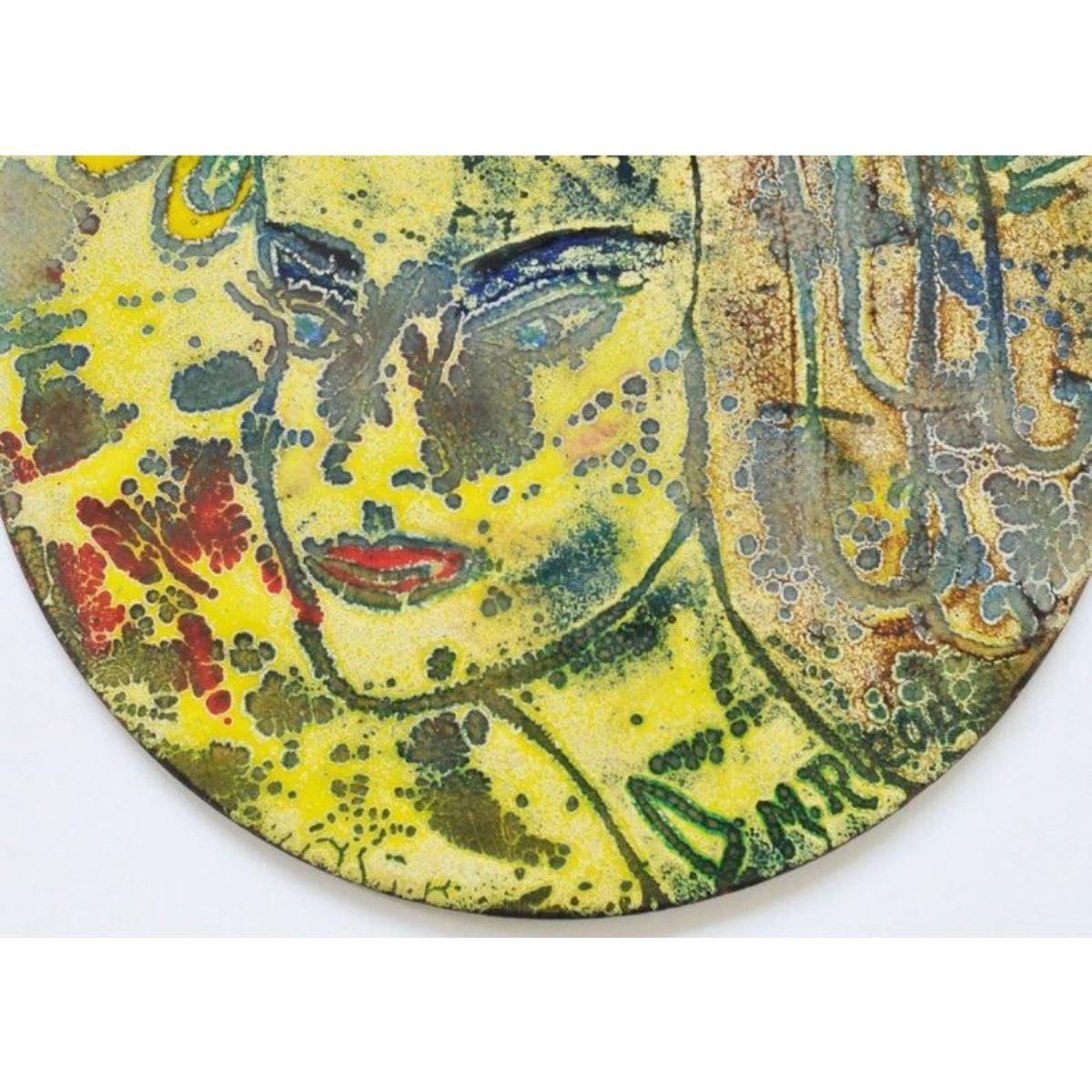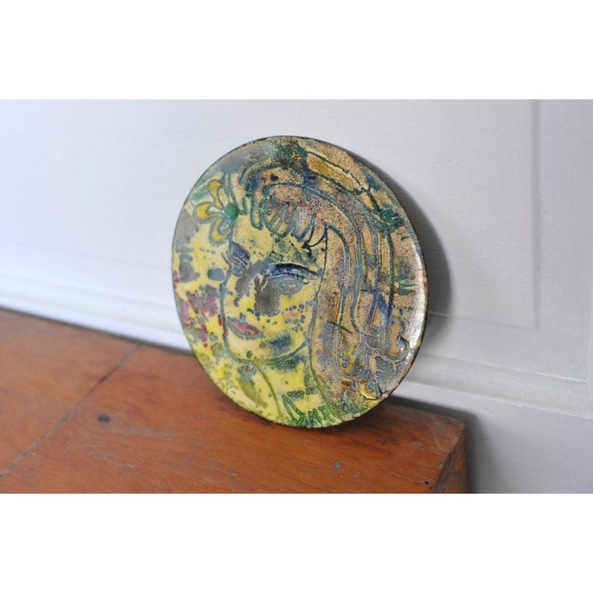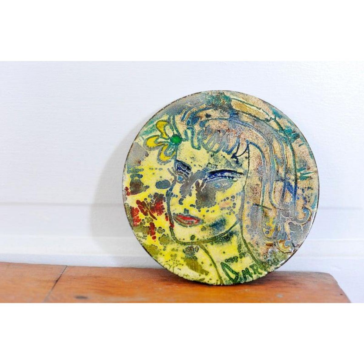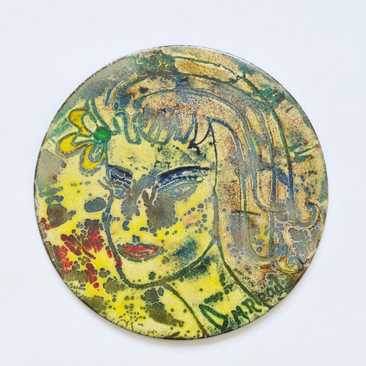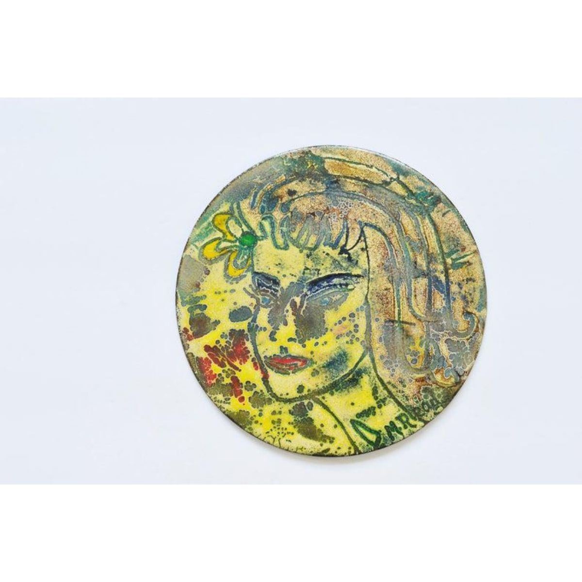 Vintage 1960's, mid-century modern, signed, art enameled tile plate, bust of a woman. 6"D. Â