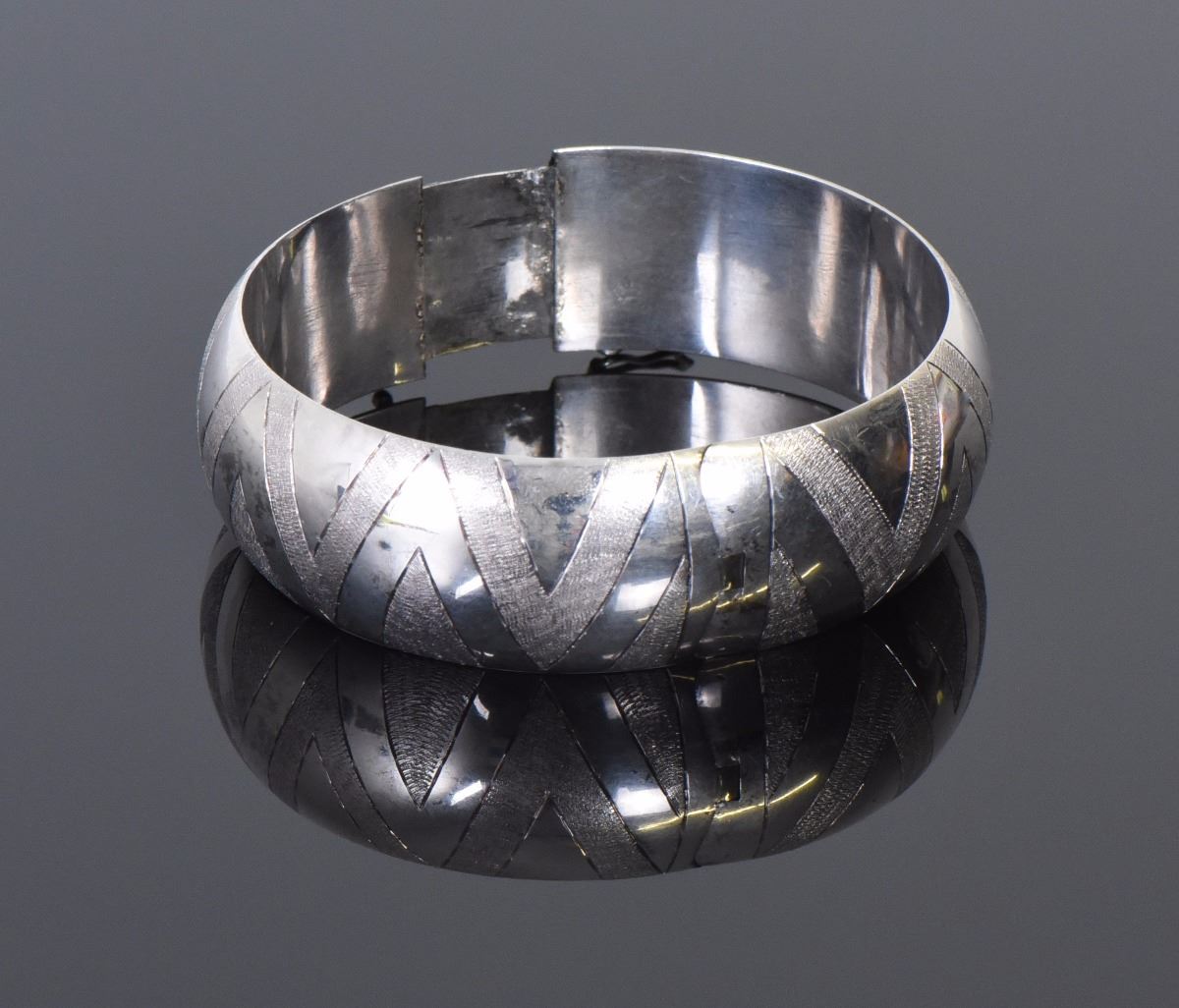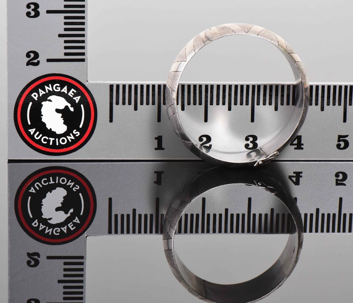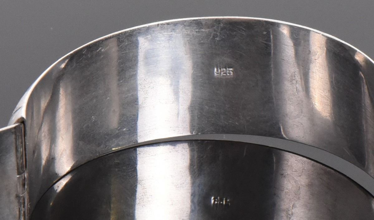 Mid Century Modern Sterling Silver Bracelet. Estimated more than 50 yrs old. 925 Sterling Silver consisting of 92.5% silver and 7.5% copper. Tested Positive using Nitric Acid Chemical Scratch Test, Cloth Rub Test, Smell Test, and Magnet Test. No Markings. The reason silver needs to be combined with other metals is that it is very difficult to make great designs with just pure silver, which is very soft and malleable. A bit of hardness has to be introduced by adding other metals such as copper. That is why jewelers are capable of making the most intricate an complex designs with 925 Sterling Silver. Silver is one of the most valuable elements next to gold. Mexico is the leading producer of sliver, followed by the United States, Canada, Australia, Spain, Peru, and Russia. Many countries do not require their precious metal items to be stamped and therefore we test to ensure we accurately represent the product. Size: See Ruler Photo. (Photos Represent The Condition Of The Lot.)