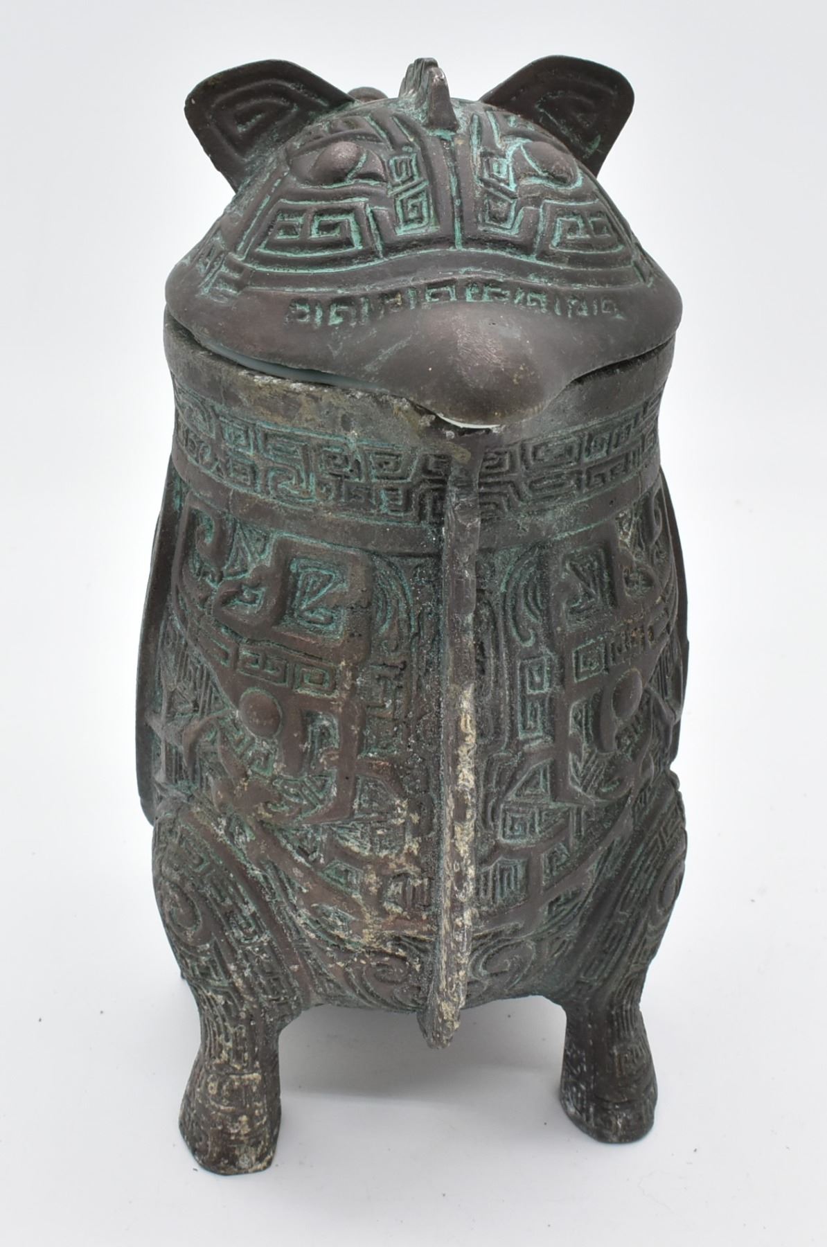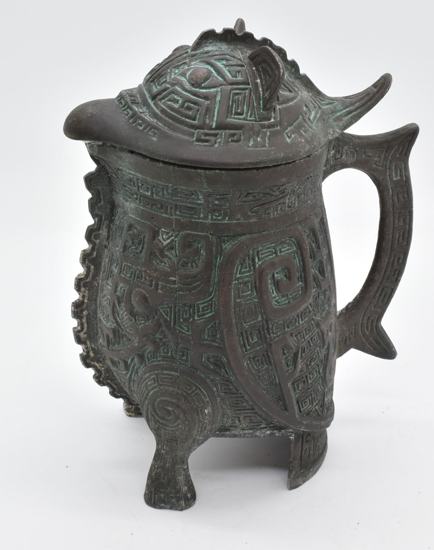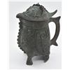 Mid Century Modern James Mont Style Taotie Pitcher, Verdigris Barware, pitcher is 4 cup capacity, and measures 10.5'' tall x 8'' wide x 6.5'' deep, (faux bronze) with verdigris finish made in Taiwan in the 1960s, pitcher has green insulation inside