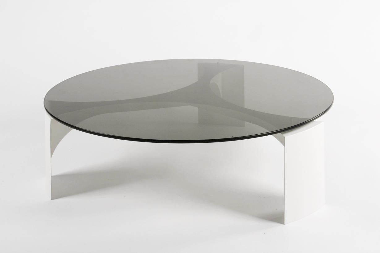 12h x 37.5dia inches, off white painted steel base, smoked glass