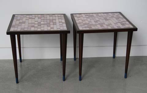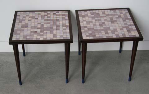 vintage pair of side tables with lavender tile tops. h. 15" w. 15" d. 15" very good condition. Newly refinished Material / Technique: wood and tile