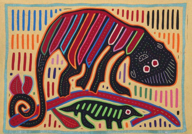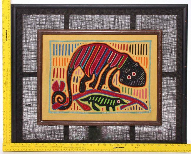 Mid Century "Monkey Playing with Lizard", a brilliant colored hand stitched Mola textile. The Mola forms part of the traditional outfit of a Kuna woman, two Mola panels being incorporated as front and back panels in a blouse. Molas have their origin in body painting. Only after colonization by the Spanish and contact with missionaries did the Kuna start to transfer their traditional geometric designs on fabric, first by painting directly on the fabric and later by using the technique of reverse application. It is not known for certain when this technique was first used. It is assumed that the oldest Molas are between 150 and 170 years old. SIZE: see attached ruler photo. Photos are part of the description representing the condition report and can be used for authentication prior to the sale date. Pangaea Auctions urges Bidder's to view all attached photos in detail.