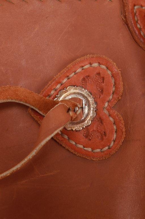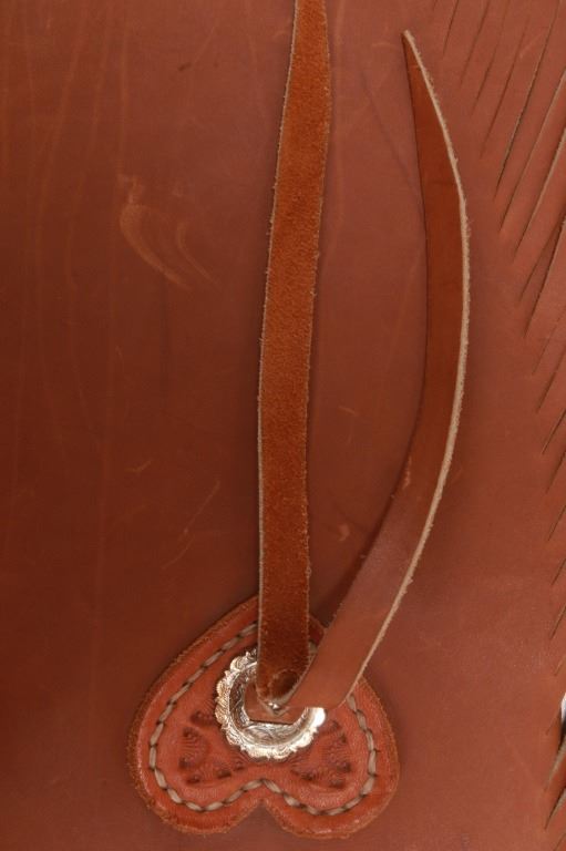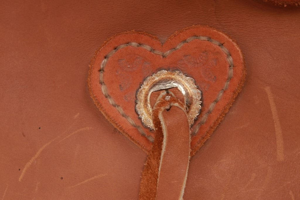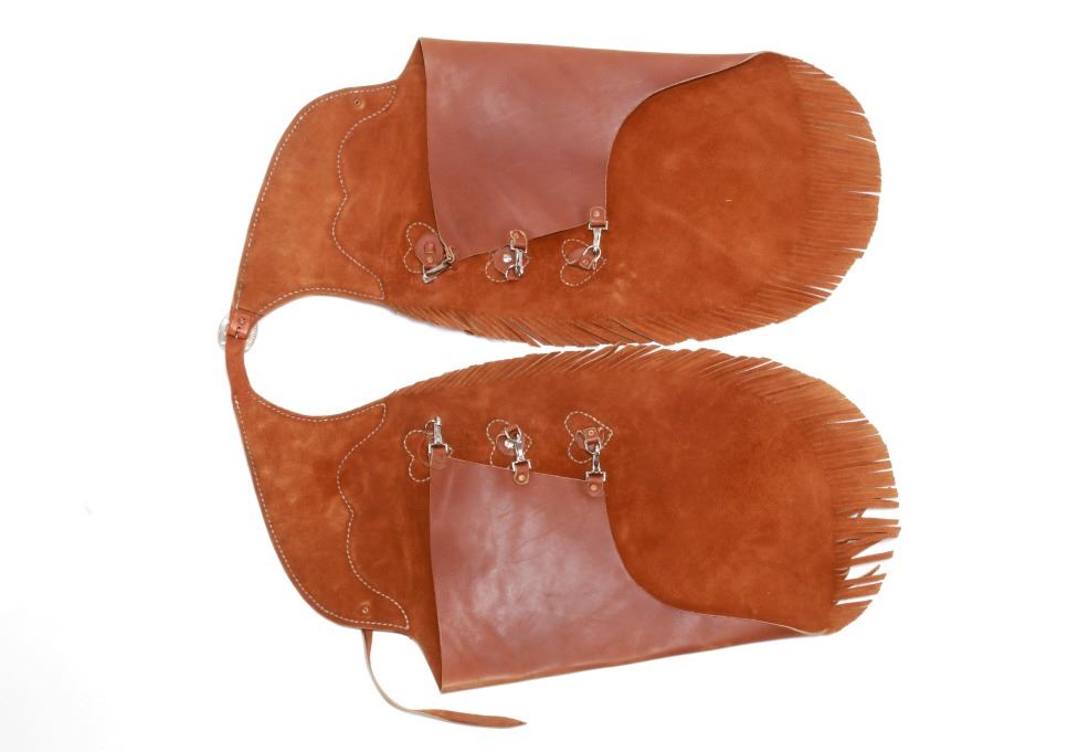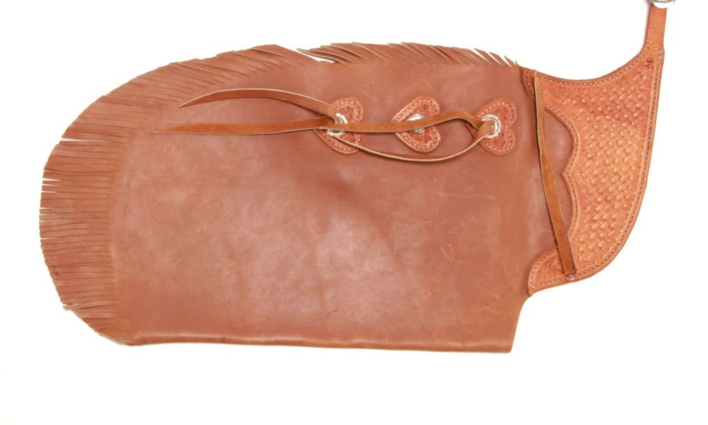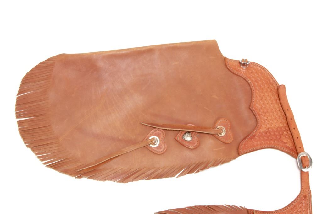 Featured in this lot is this mid-century Montana heart chinks/chaps. The chaps are female chaps with hearts sewn and an onsite fringe along the out seam and bottom of the chinks. The condition of this pair of chinks is good, with no obvious signs of damage. The measurements of this pair of chinks are 29" x 26" and a waist size of 39" and inseam measurements of 18".