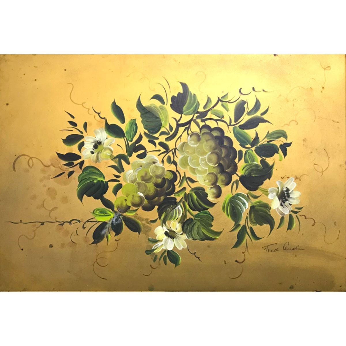 Mid-century Nashco metal toleware tray, hand-painted & signed by the artist Fred Austin, depicts clusters of grapes & flowers. Beautiful gold & vintage green colors. 22" W X 16" L. Comes with spring hanger attached for hanging on the wall.