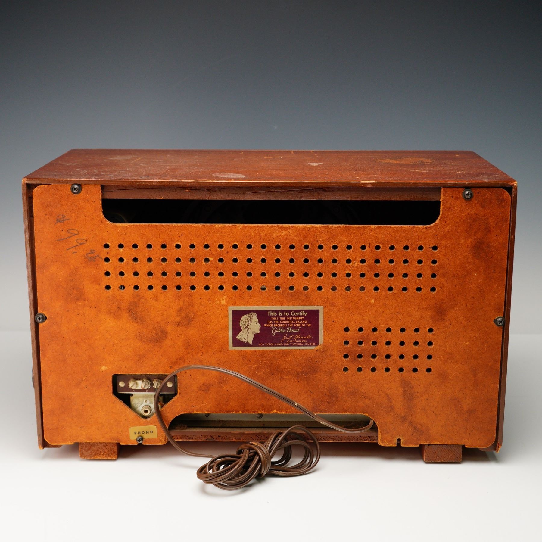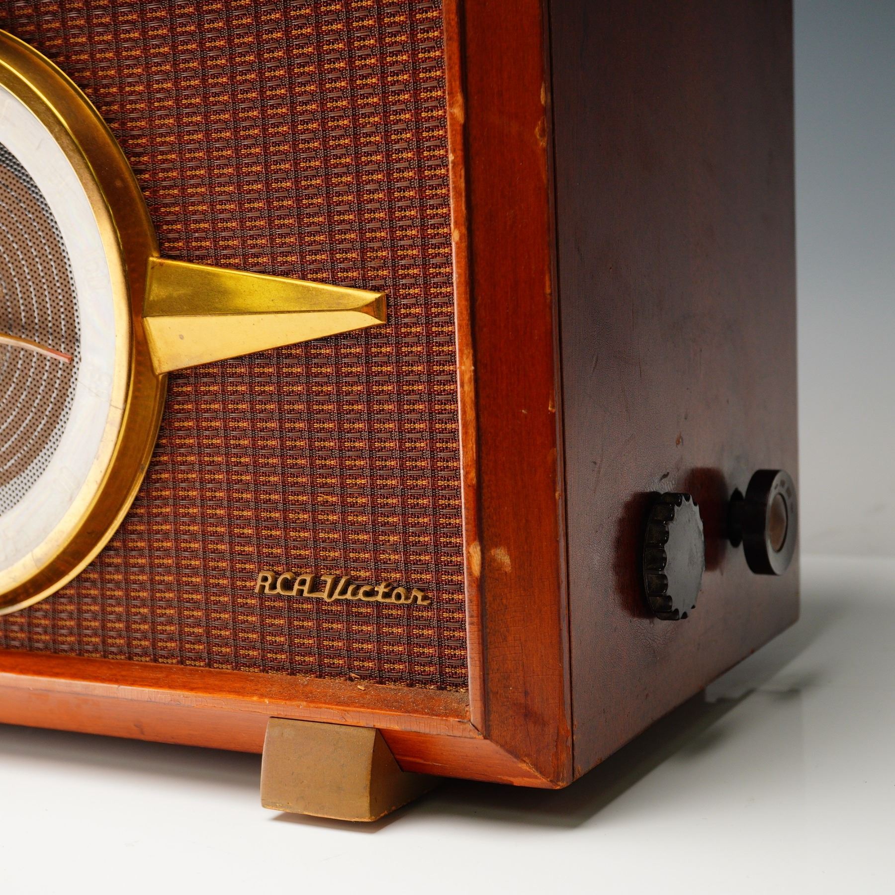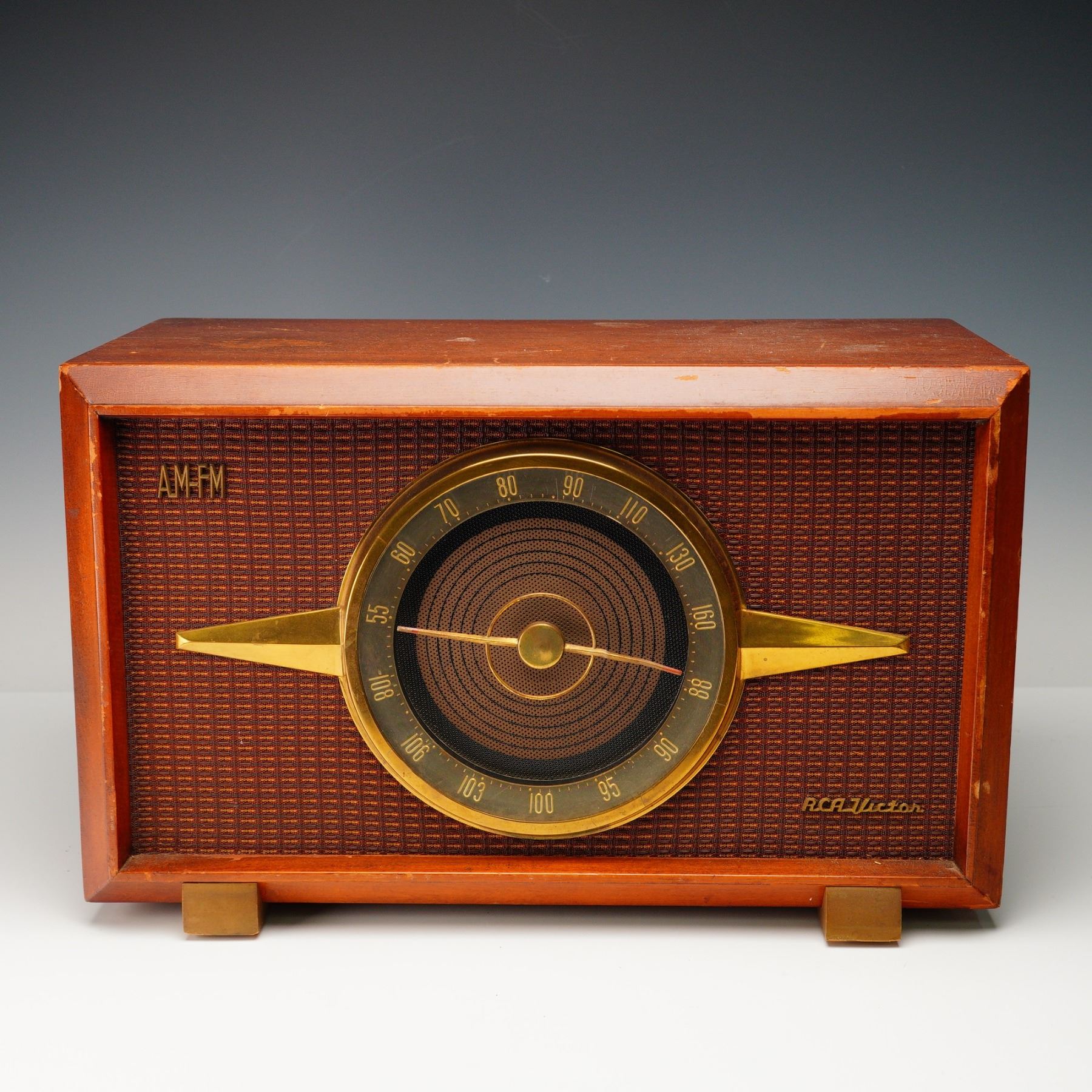 RCA Victor AM/FM tabletop radio housed in a mid-century modern wood cabinet with textured fabric grille and stylized brass circular dial flanked by directional fins. Features dual control knobs to each side, original back panel with phono input, and a certification label by John Thorncroft Radio & Television Service of Brooklyn, NY. The unit presents well with light wear, small scuffs to cabinet, and untested electronics.