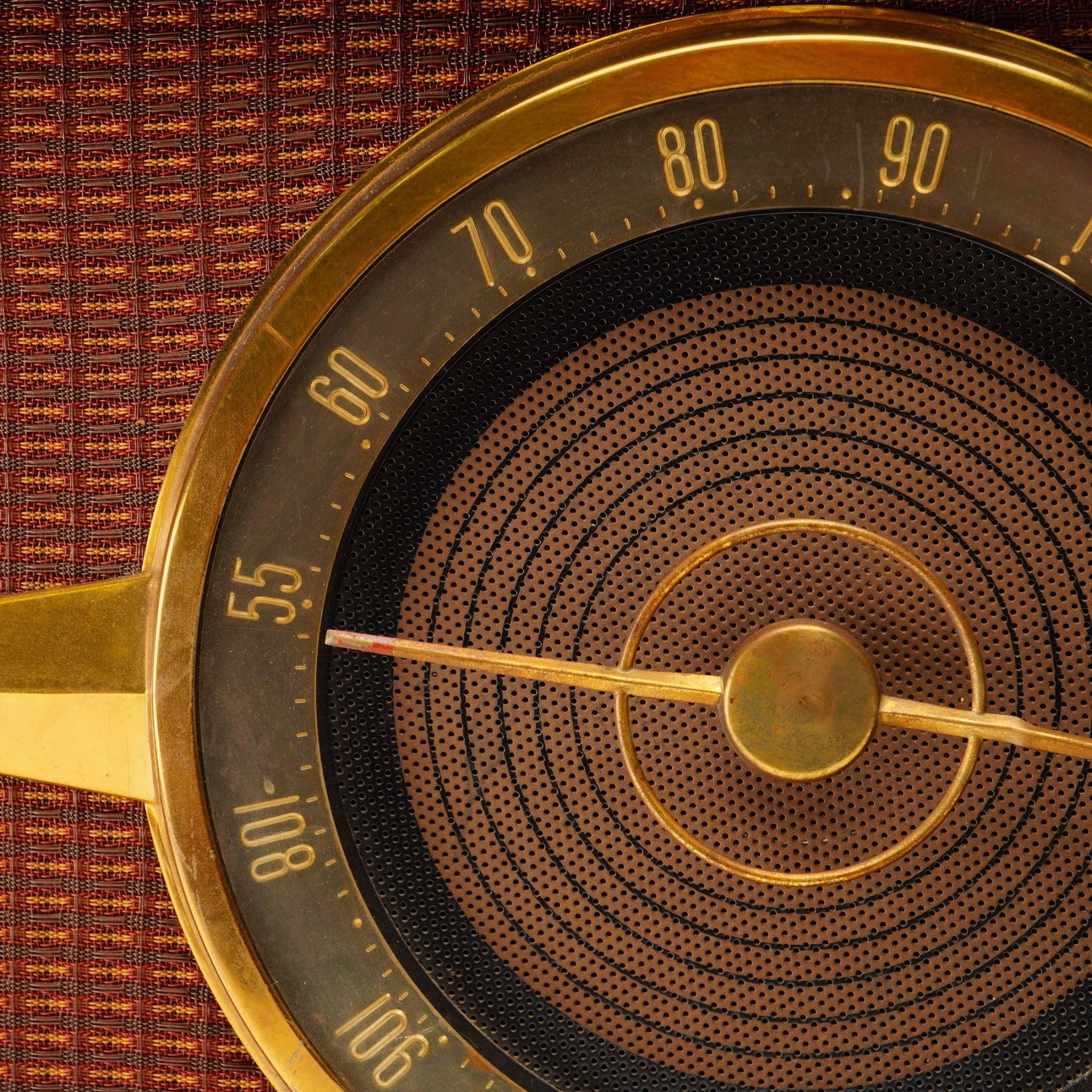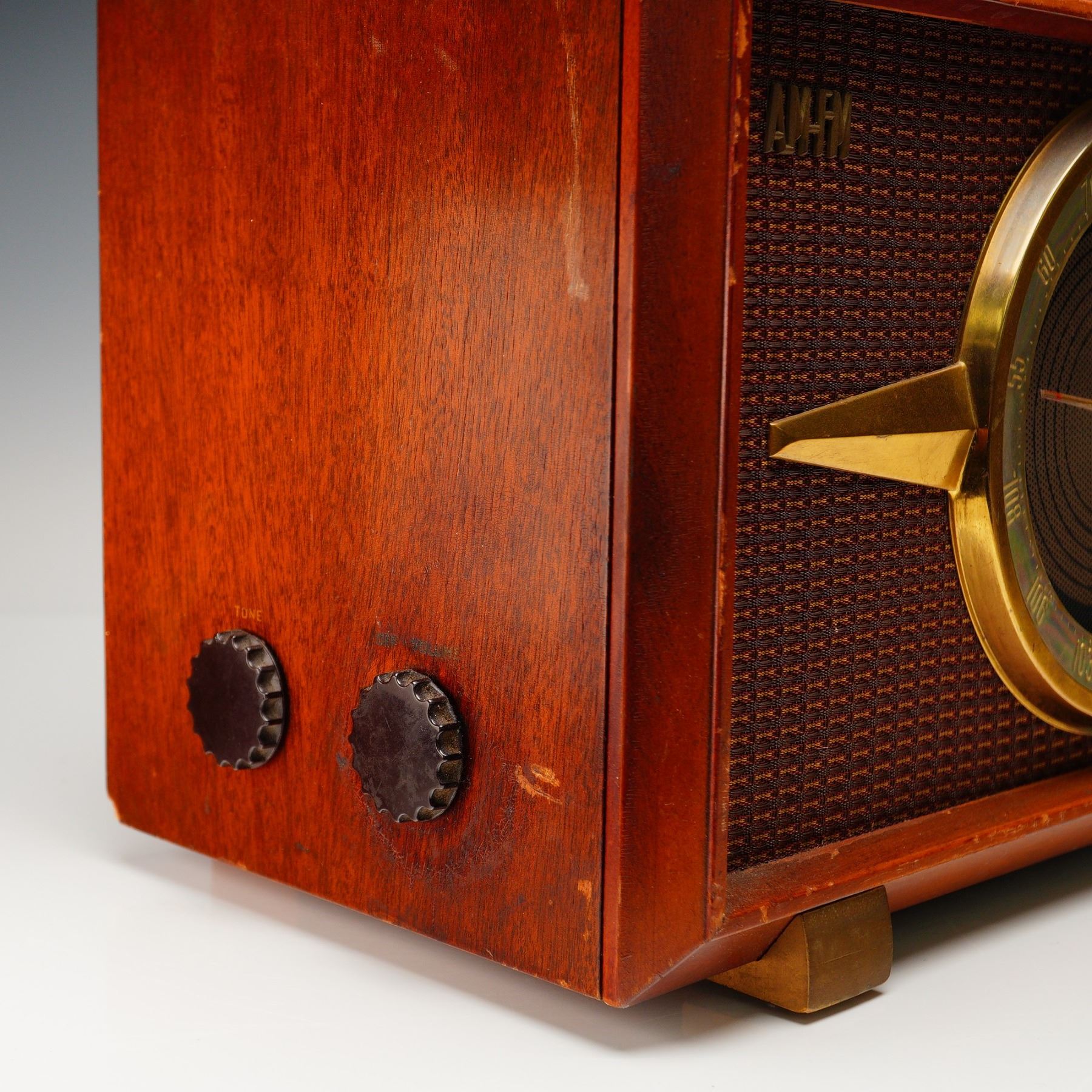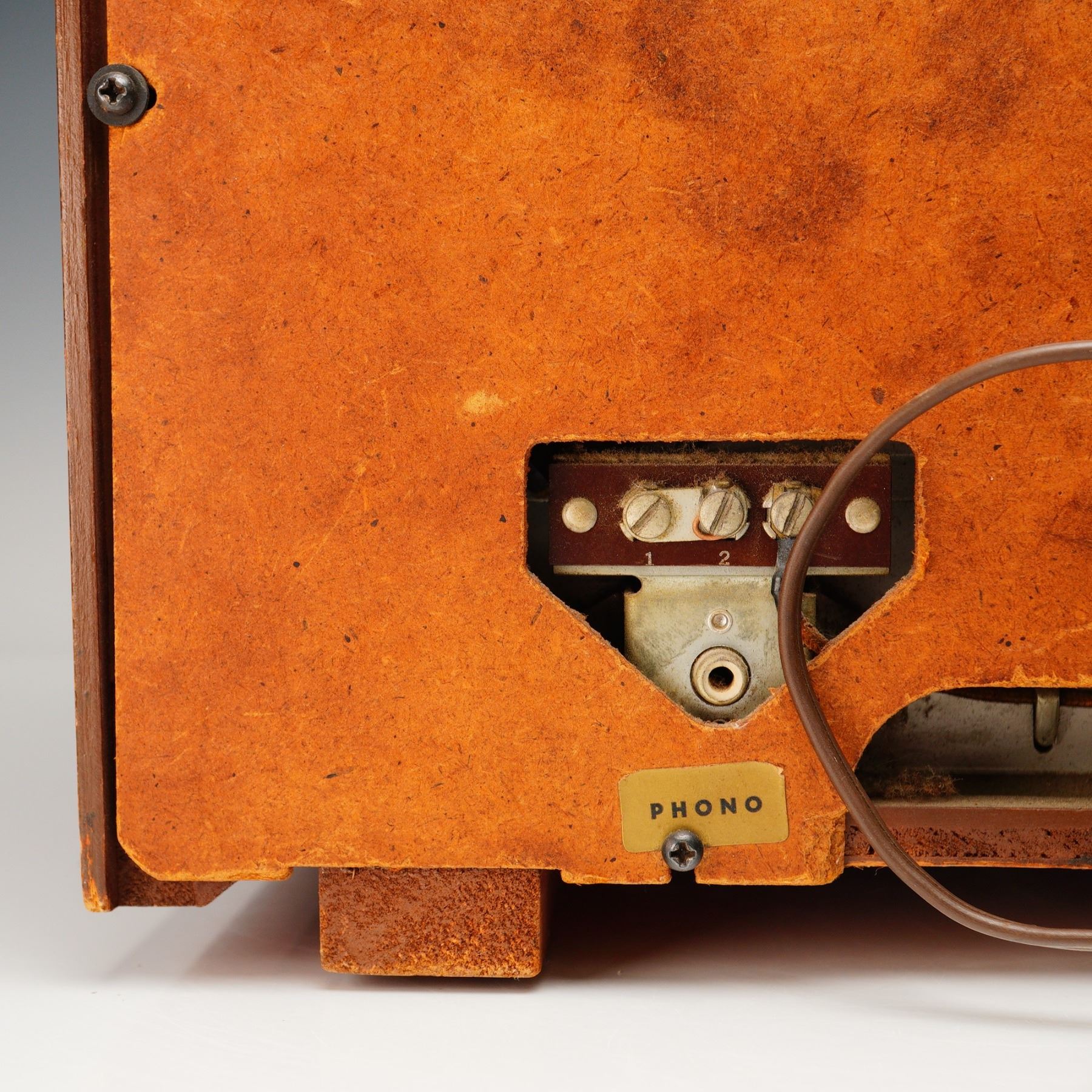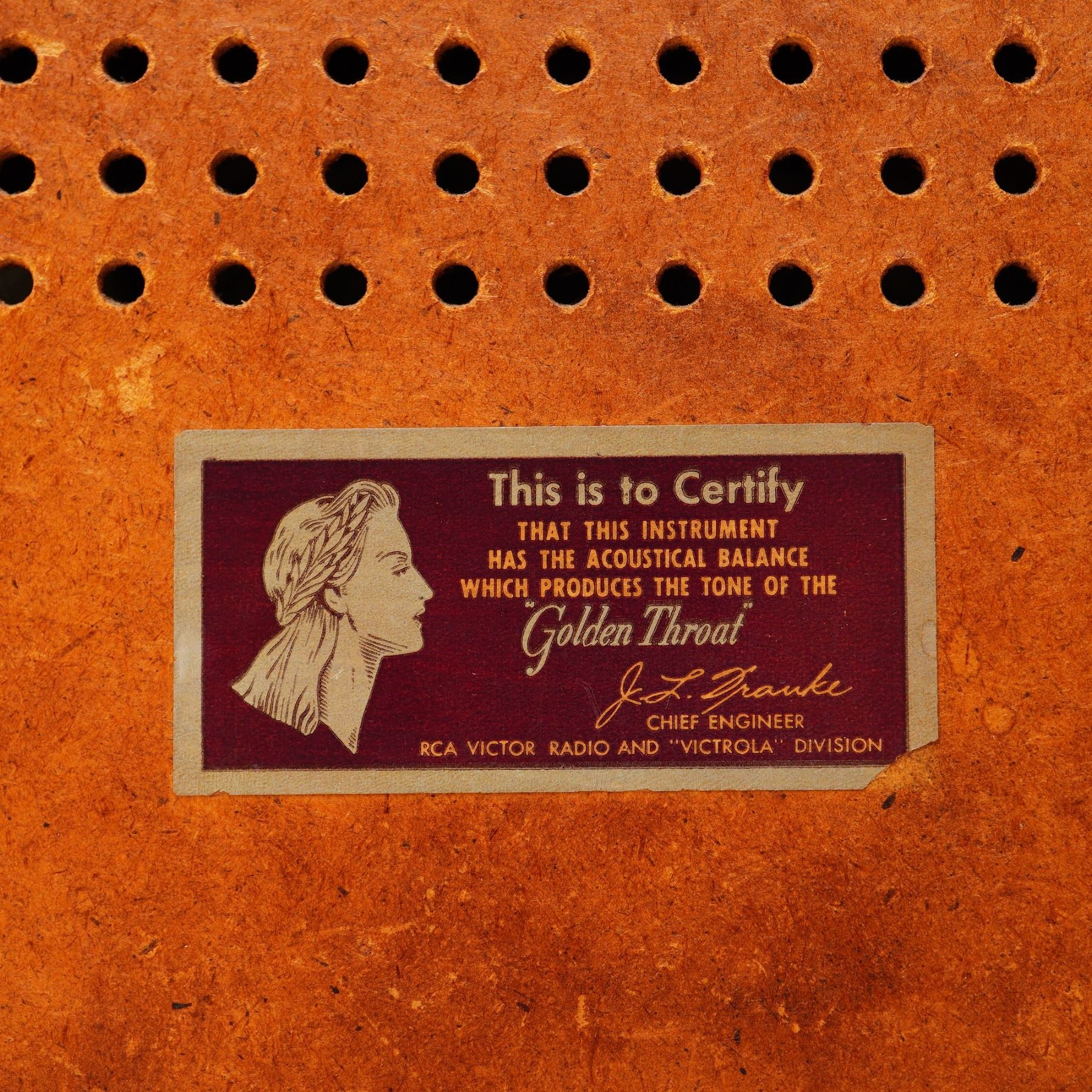 RCA Victor AM/FM tabletop radio housed in a mid-century modern wood cabinet with textured fabric grille and stylized brass circular dial flanked by directional fins. Features dual control knobs to each side, original back panel with phono input, and a certification label by John Thorncroft Radio & Television Service of Brooklyn, NY. The unit presents well with light wear, small scuffs to cabinet, and untested electronics.