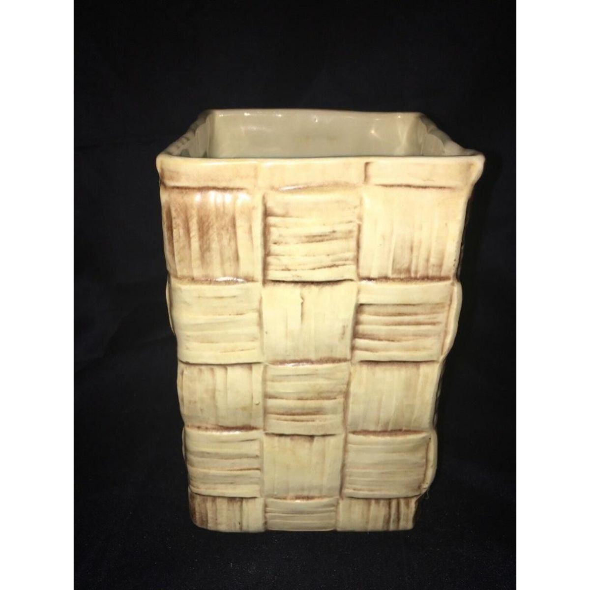 Mid-Century Shawnee USA basket weave, design pottery vase. "Shawnee USA, 842" on bottom. 7 1/2" H X 4 1/2" X 4 1/2".