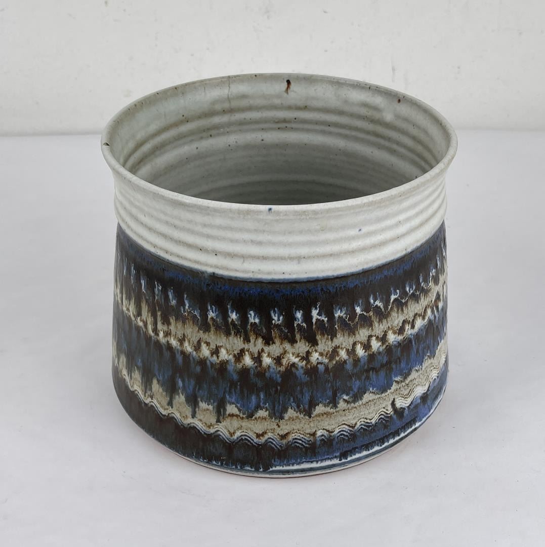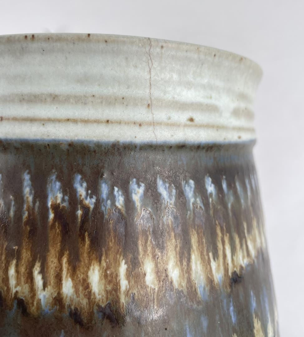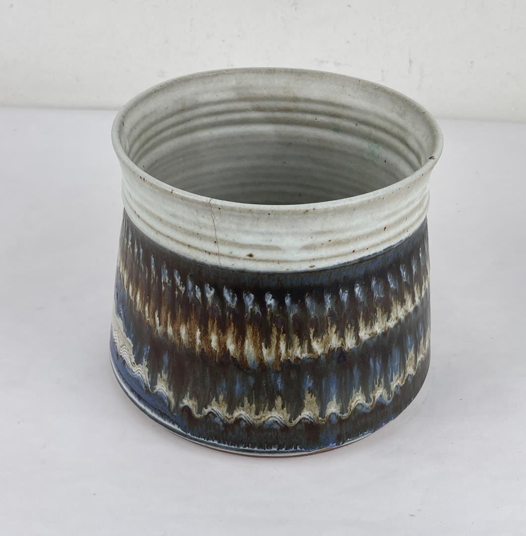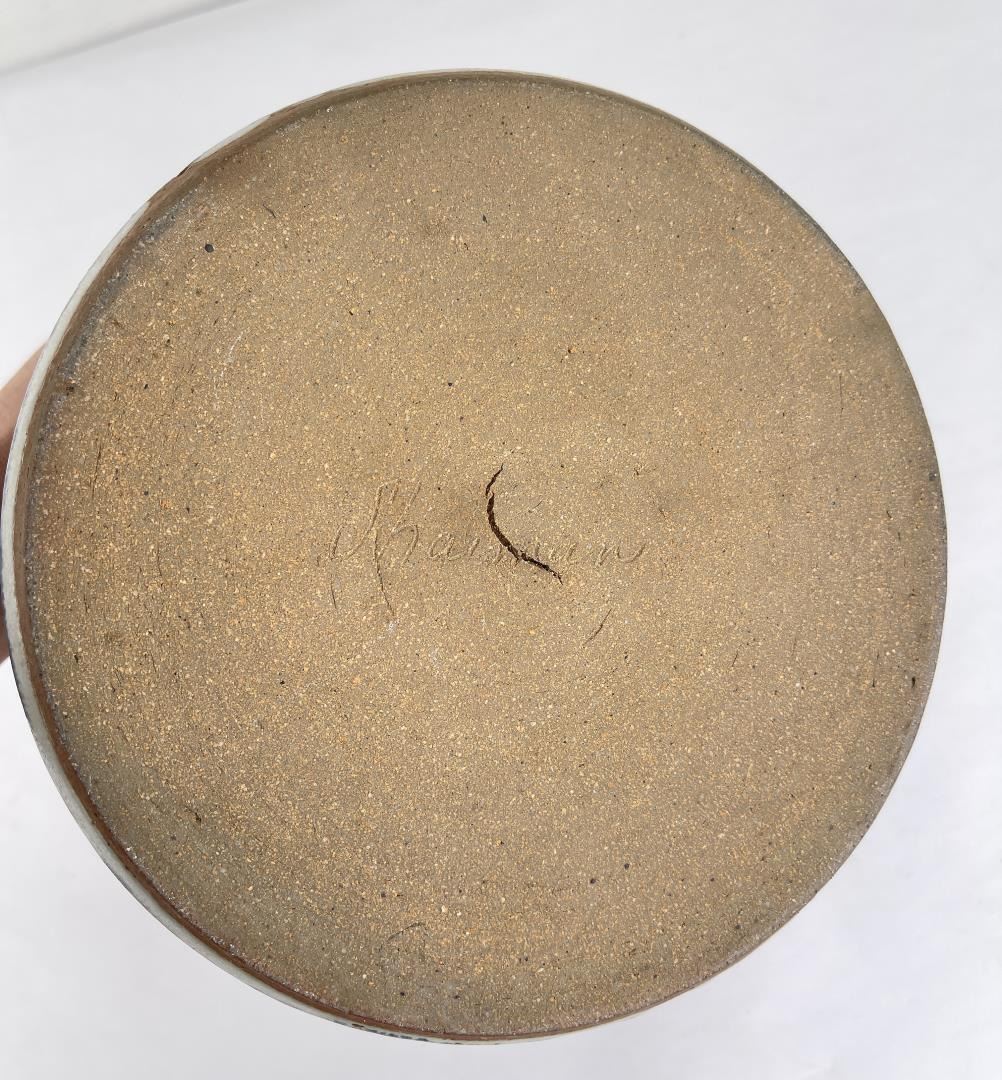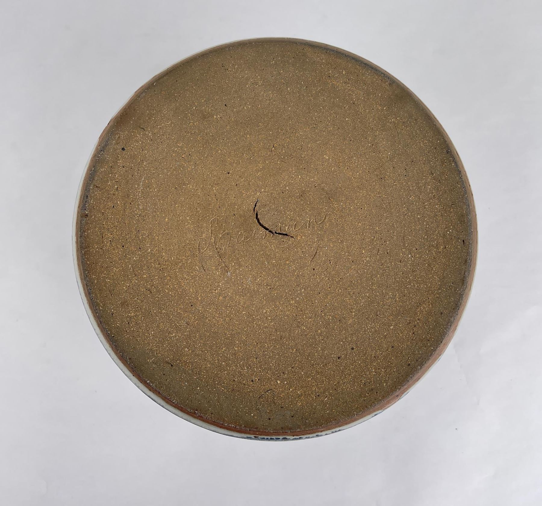 Signed as shown. 6.5" tall, 7" diameter. Cracked.