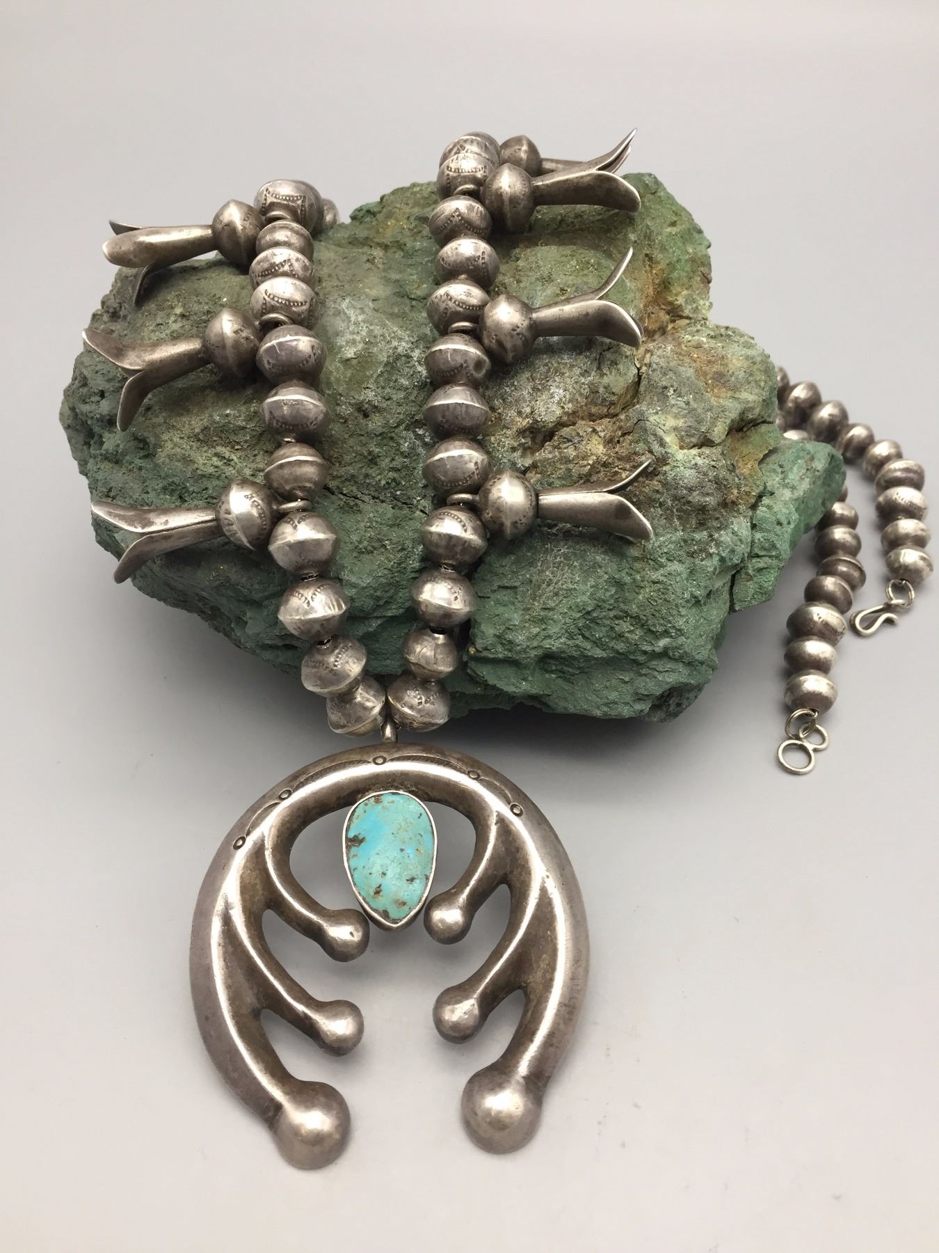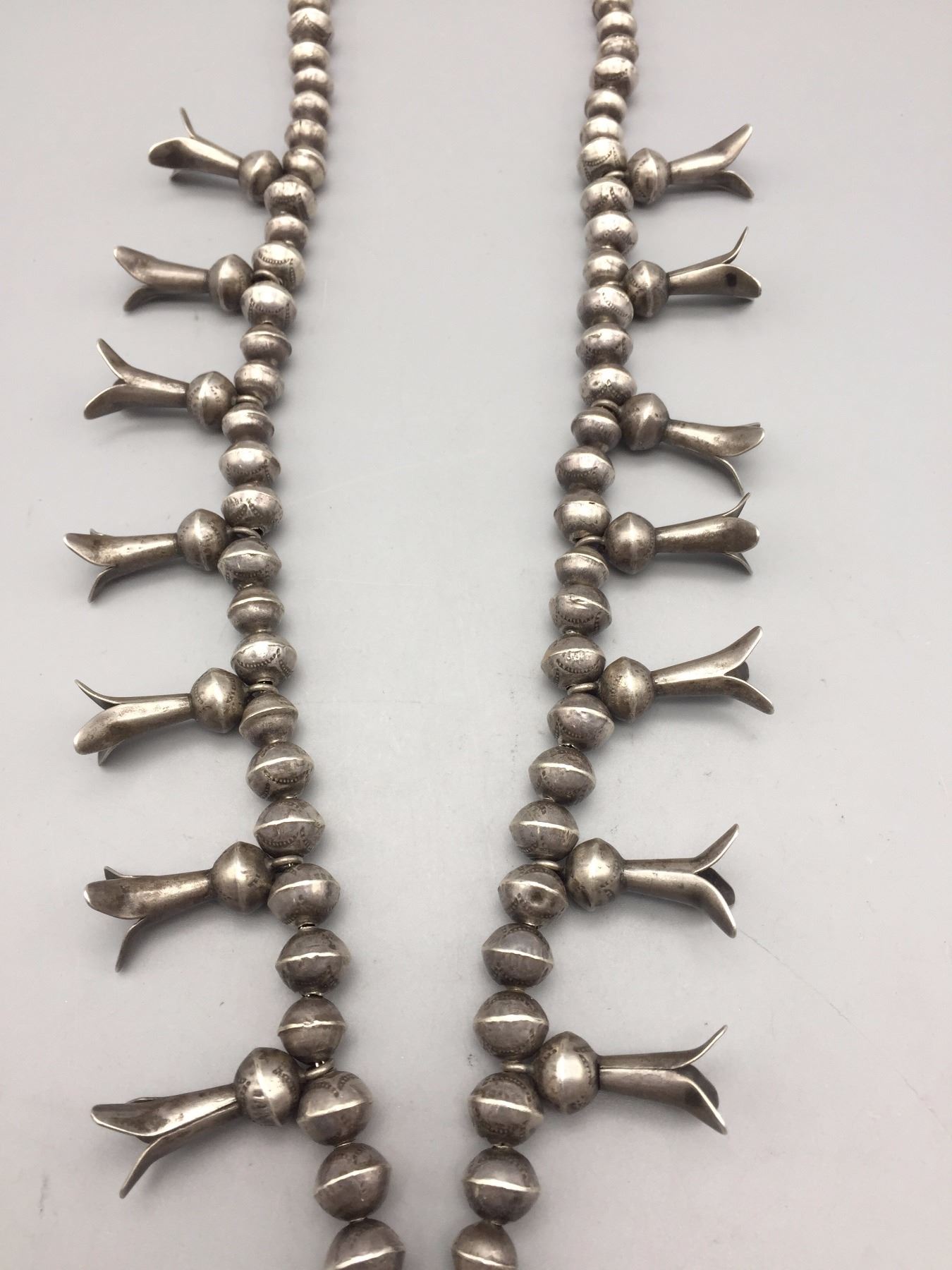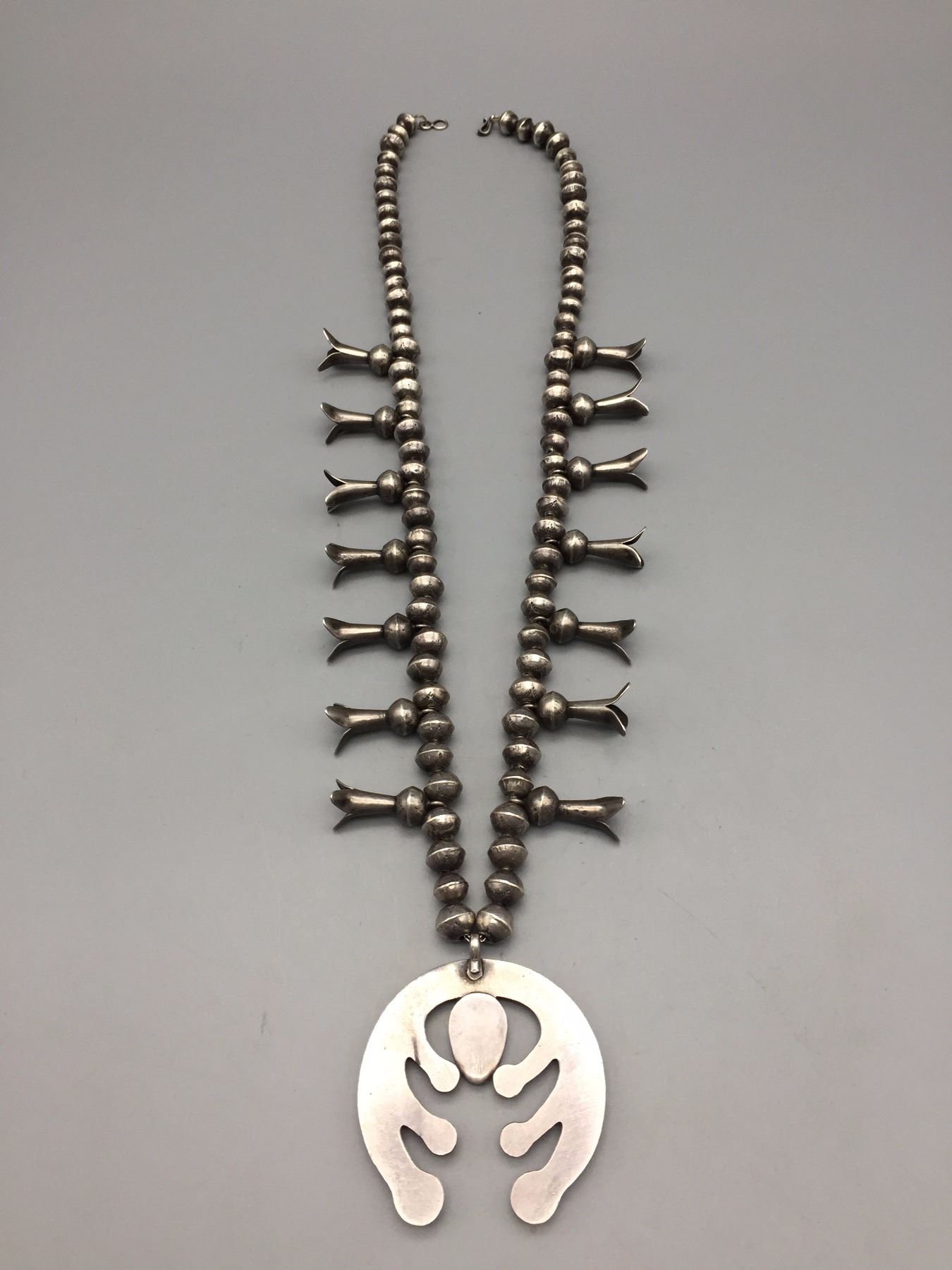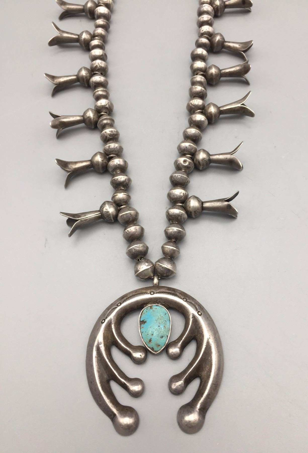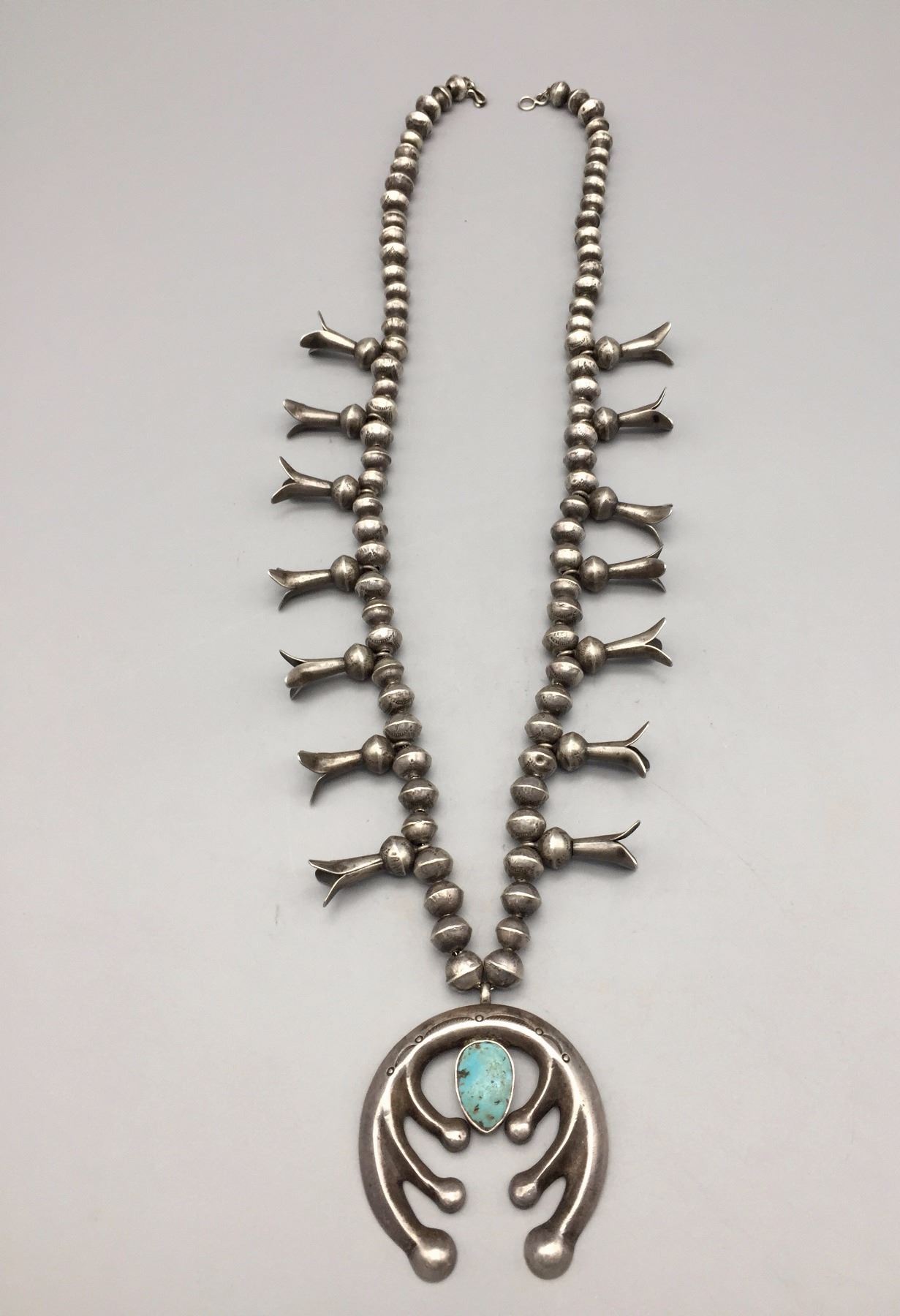 Description: A handmade, sterling silver squash blossom necklace with a single turquoise stone in the naja. Handmade beads, etc.                                                                                                                      Maker: Unknown.                                                                                                      Approx. Age: Vintage, circa mid-century.                                                                                                Size: Fits 26" around the neck. Weighs 116.4 g.                                                                                                                                                                                                              Condition: Good for its age, normal wear expected. Please look closely at the pictures - they are an important part of our description. Shipping: There will be a $5 handling / packaging fee for shipping this lot. The actual cost of postage will be added on top of that.