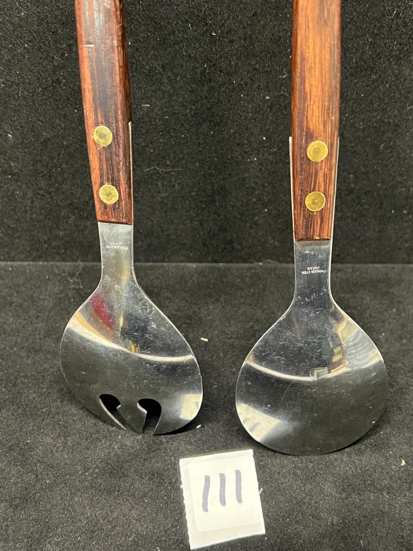 Mid Century Walnut & Stainless Salad Server Fork & Spoon Tongs Appr 13"