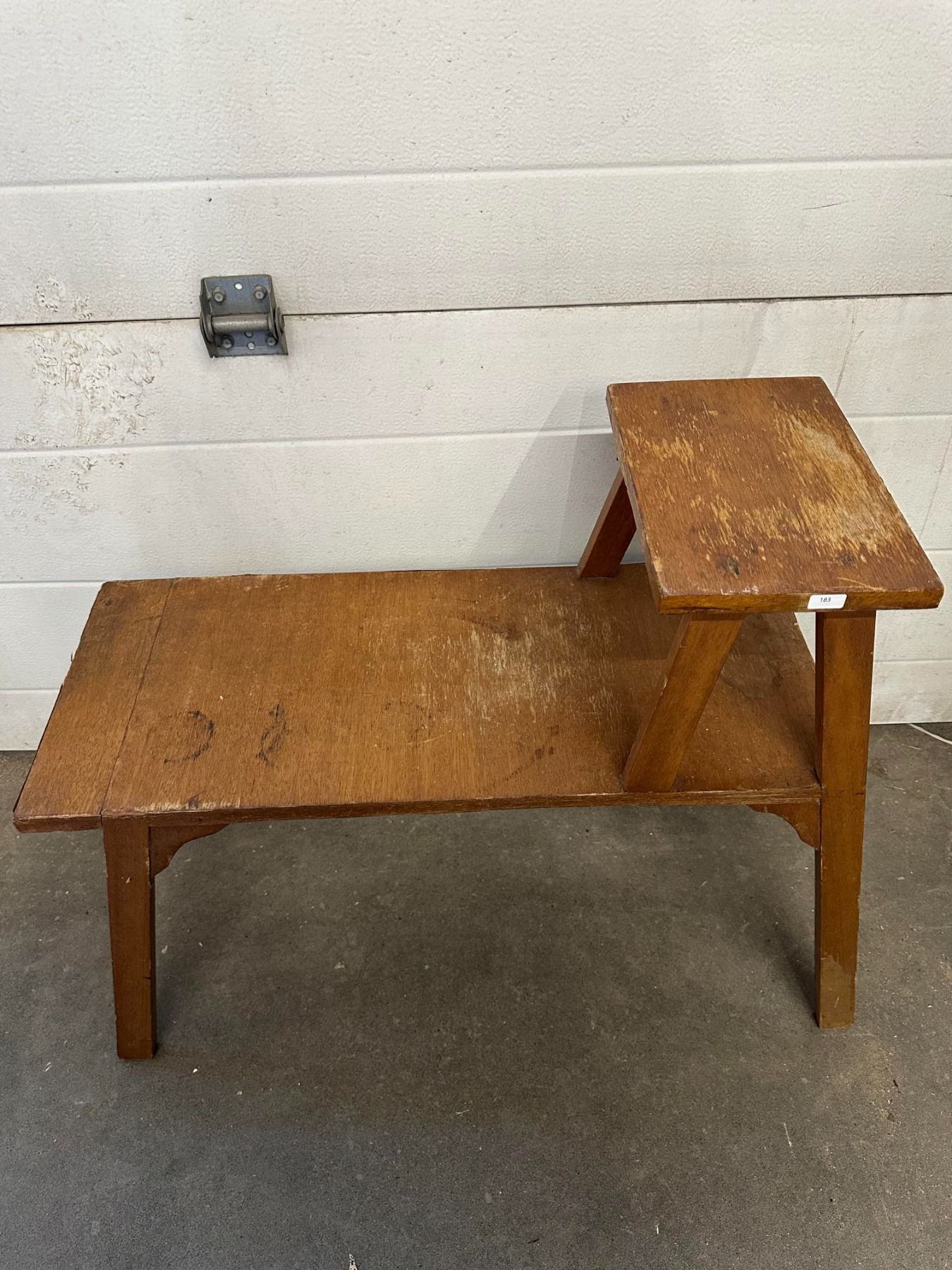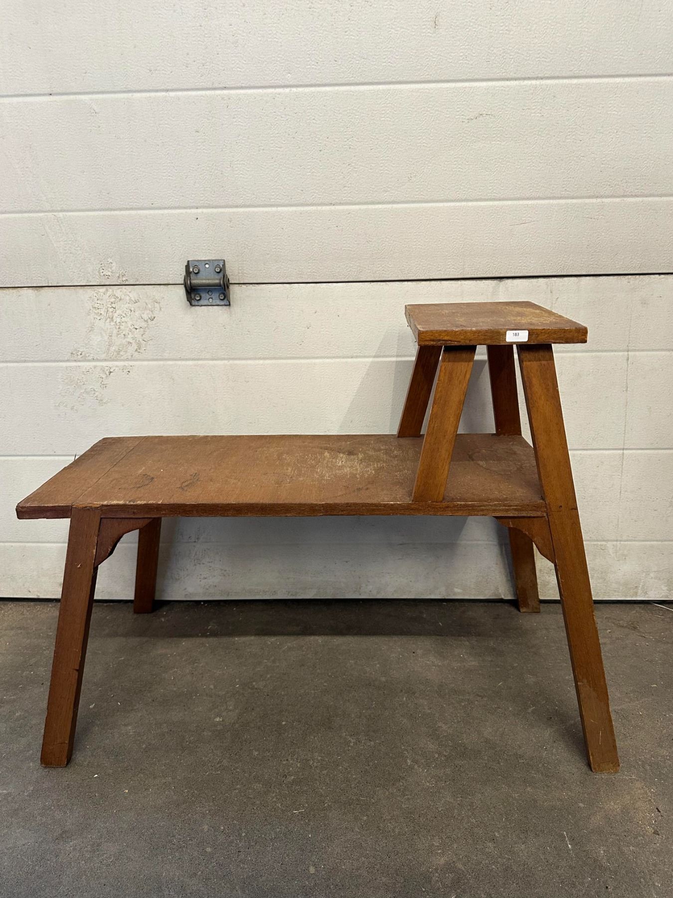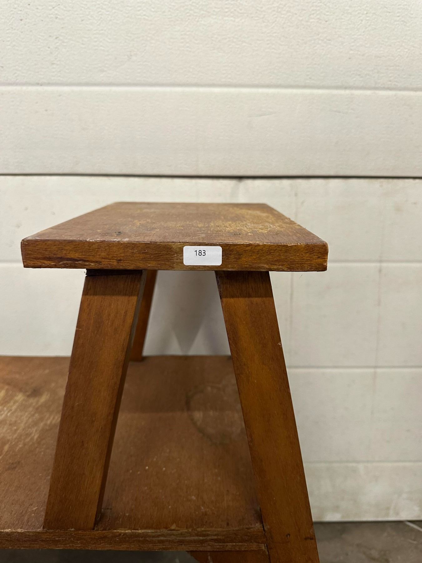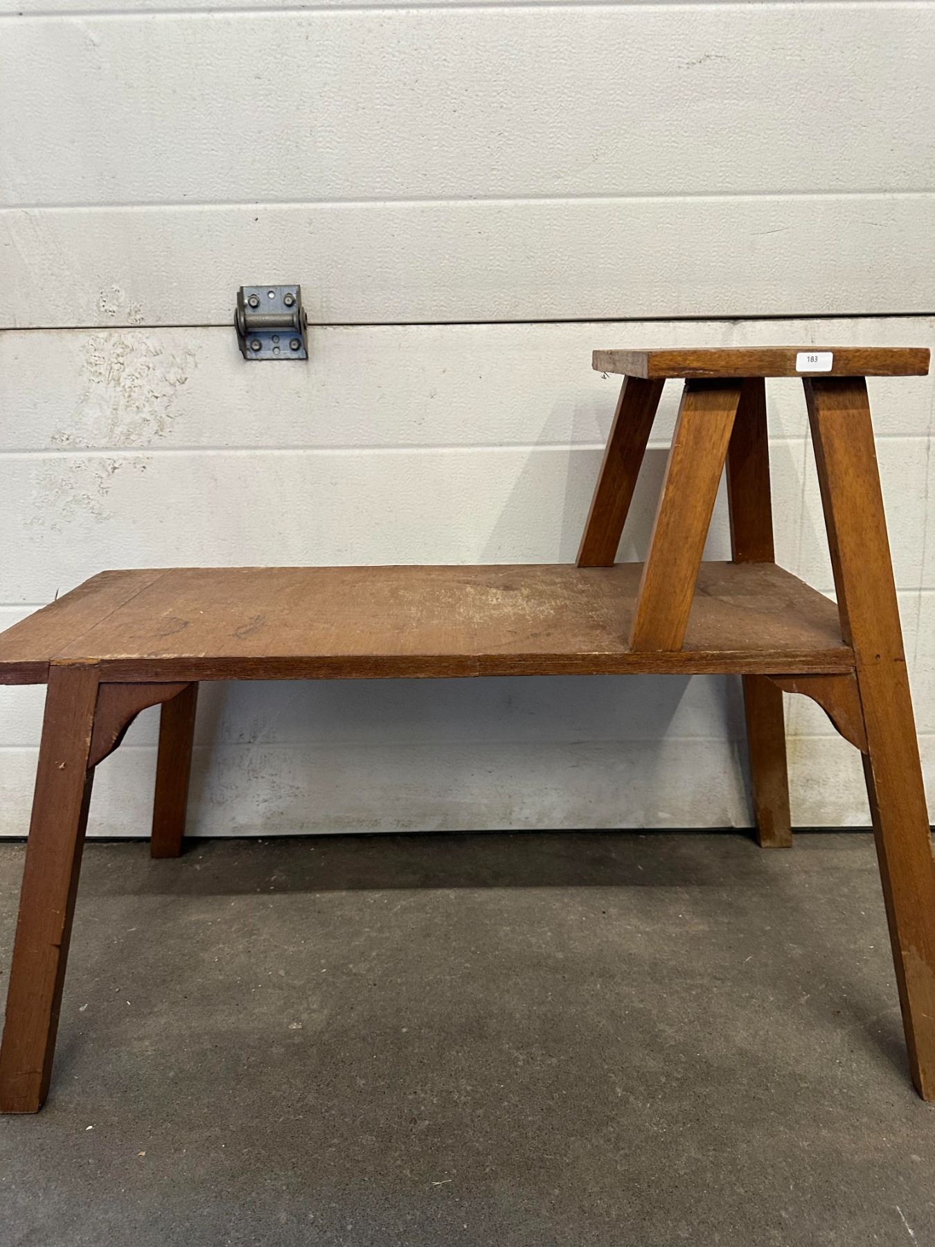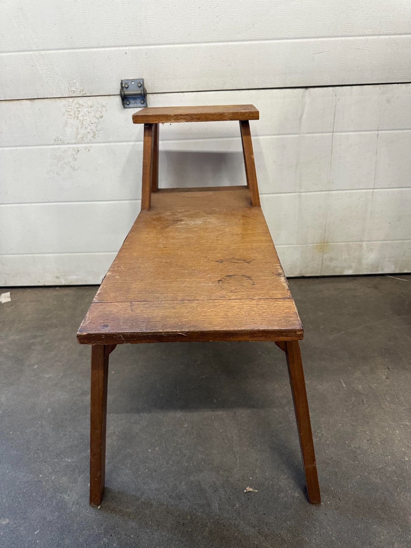 Wooden two-tier bench or small table with angled legs. Approx. mid-century. Condition: wear from age.