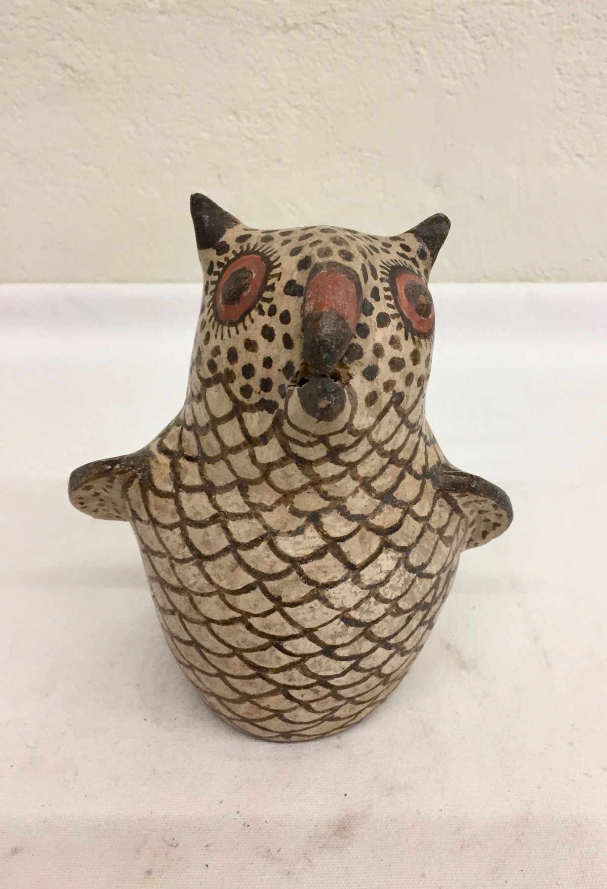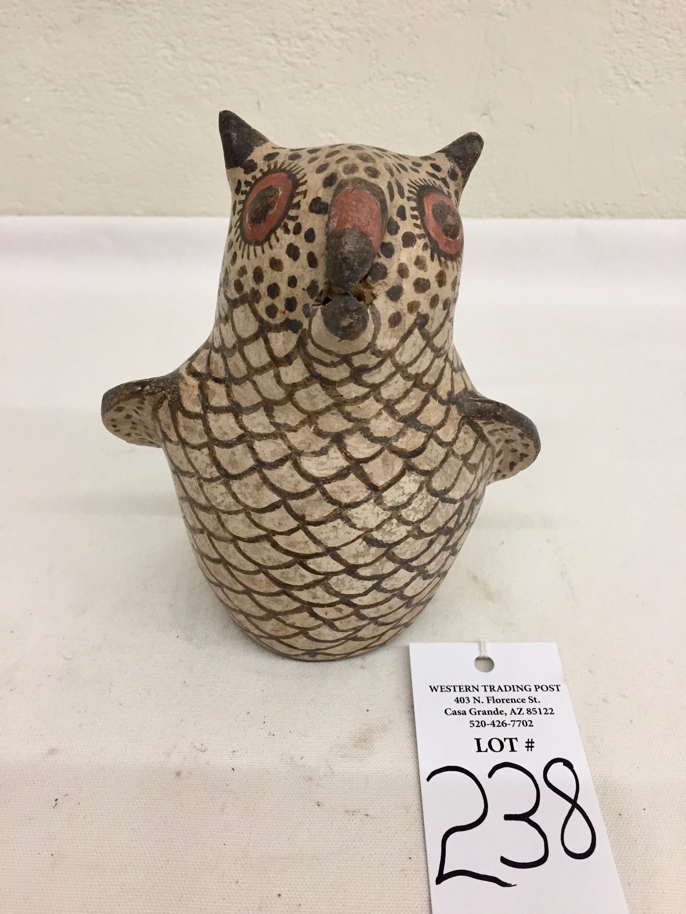 Description: A nice, mid-century era, Zuni pottery effigy owl. Maker: Unknown Zuni potter. Approx. Age: Circa mid-century. Size: Approx. 5-1/2” w x 7” tall. Condition: Good for its age, normal wear expected. Please look closely at the pictures - they are an important part of our description. Shipping: There will be a $8 handling / packaging fee for shipping this lot. The actual cost of postage will be added on top of that.