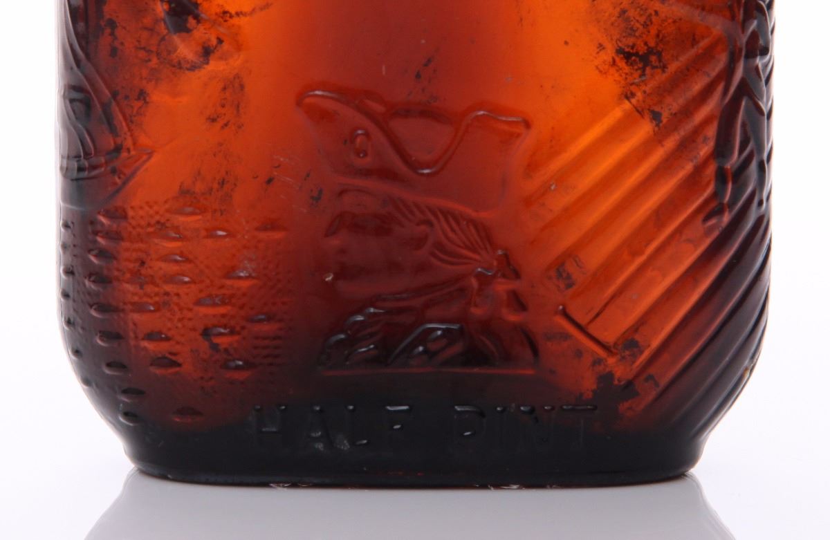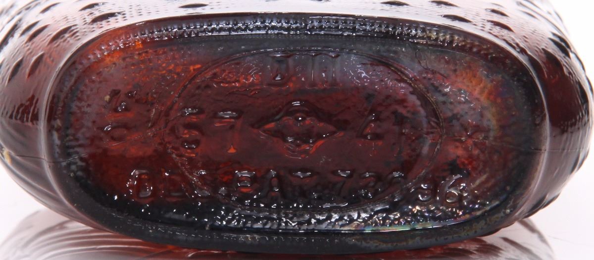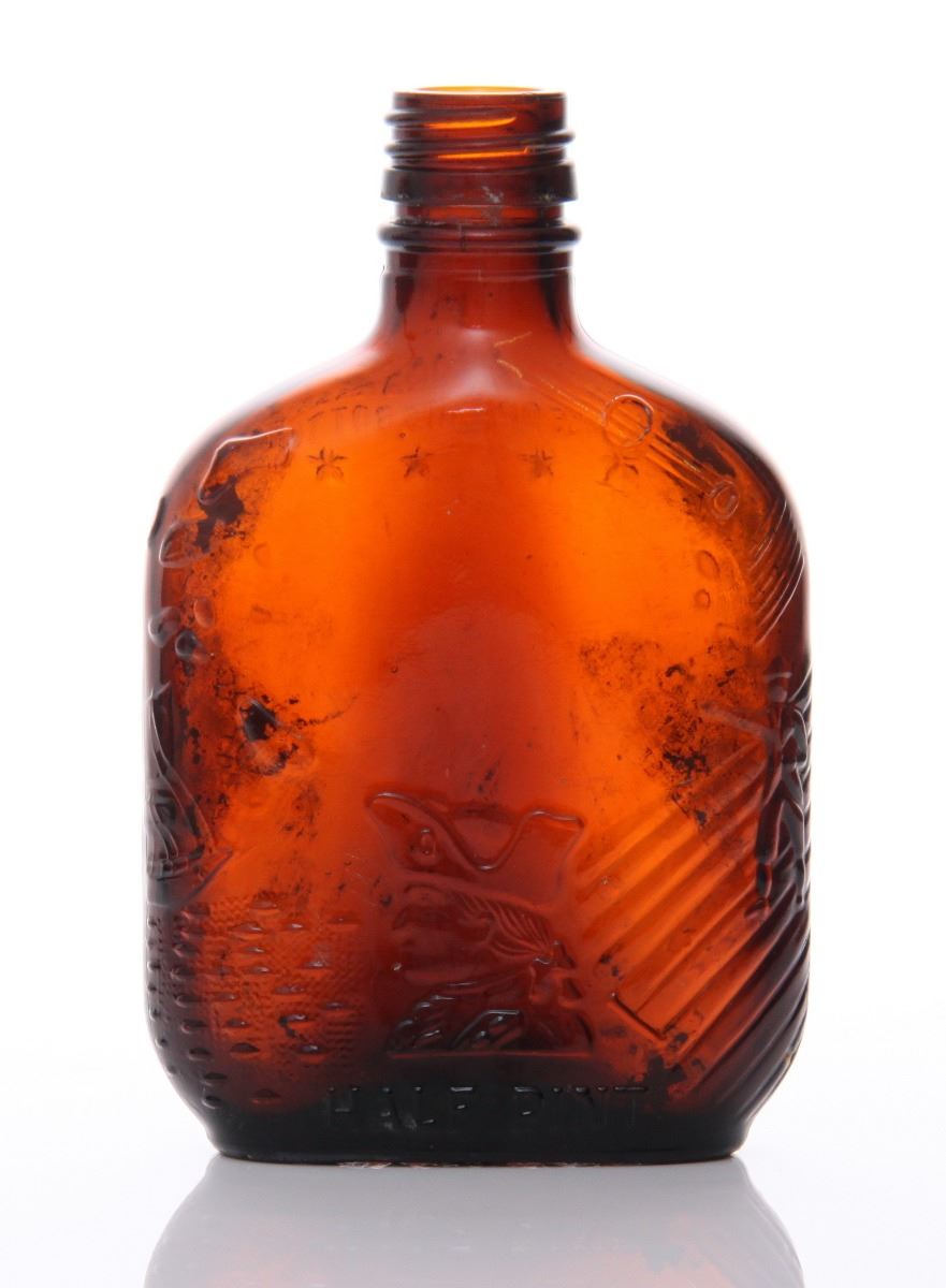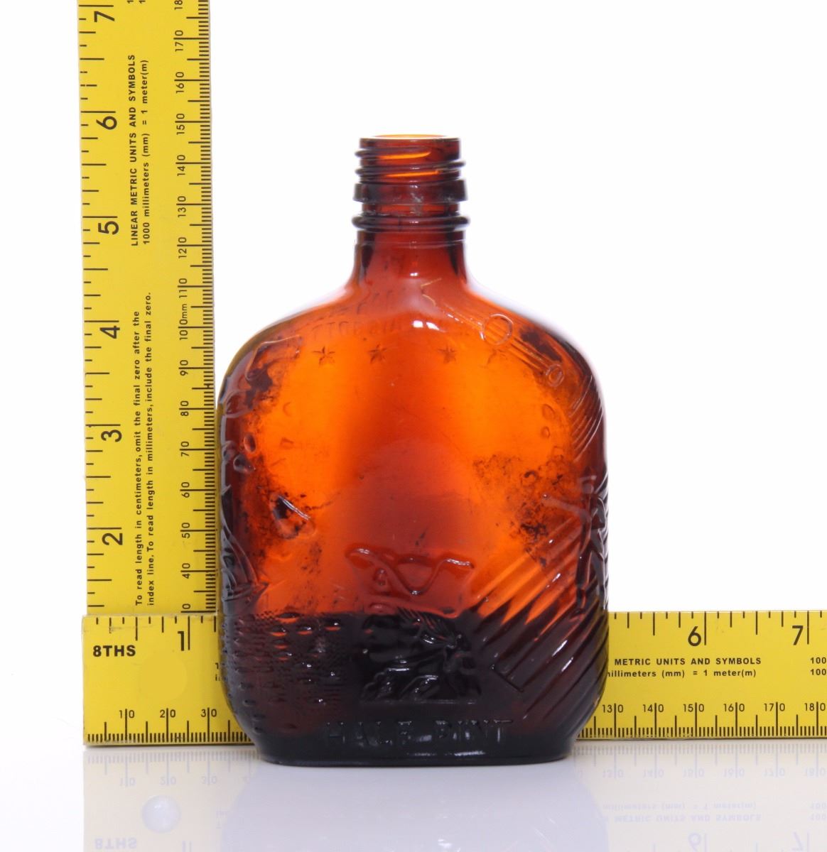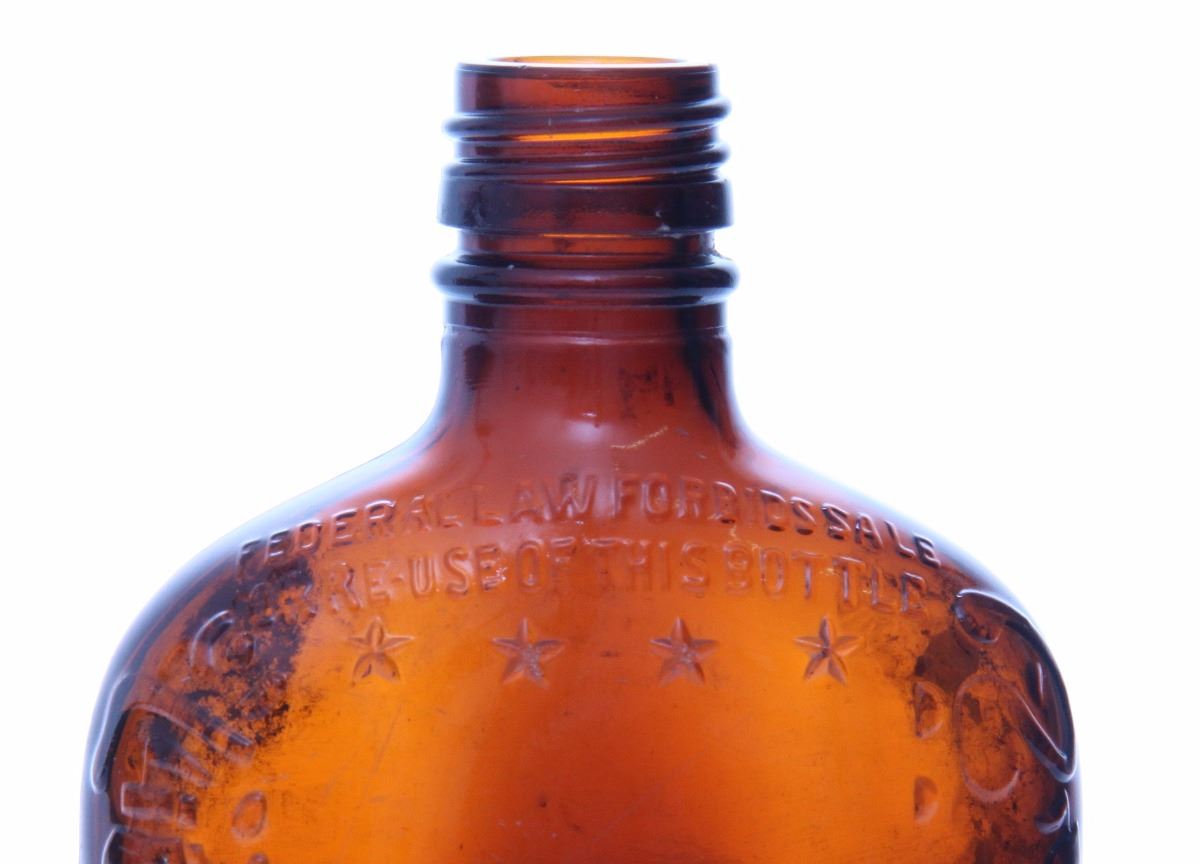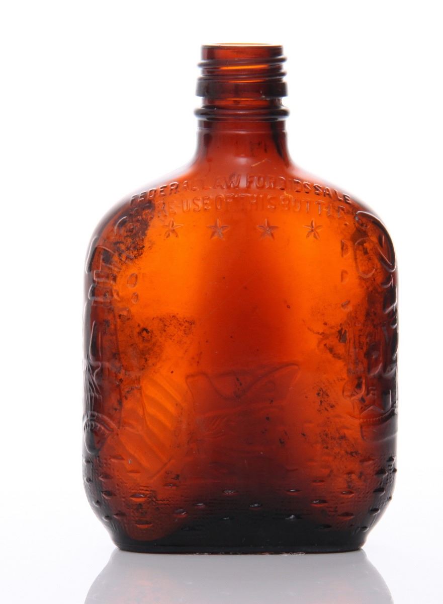 Mid Century brown glass whiskey bottle. The "Federal Law Forbids Sale or Reuse of this Bottle" marking was required on all liquor bottles sold in America from 1935-1964. Estimated more than 50 yrs old. (Pangaea Auctions) Size: See Ruler Photo. (Photos Represent The Condition Of The Lot.)