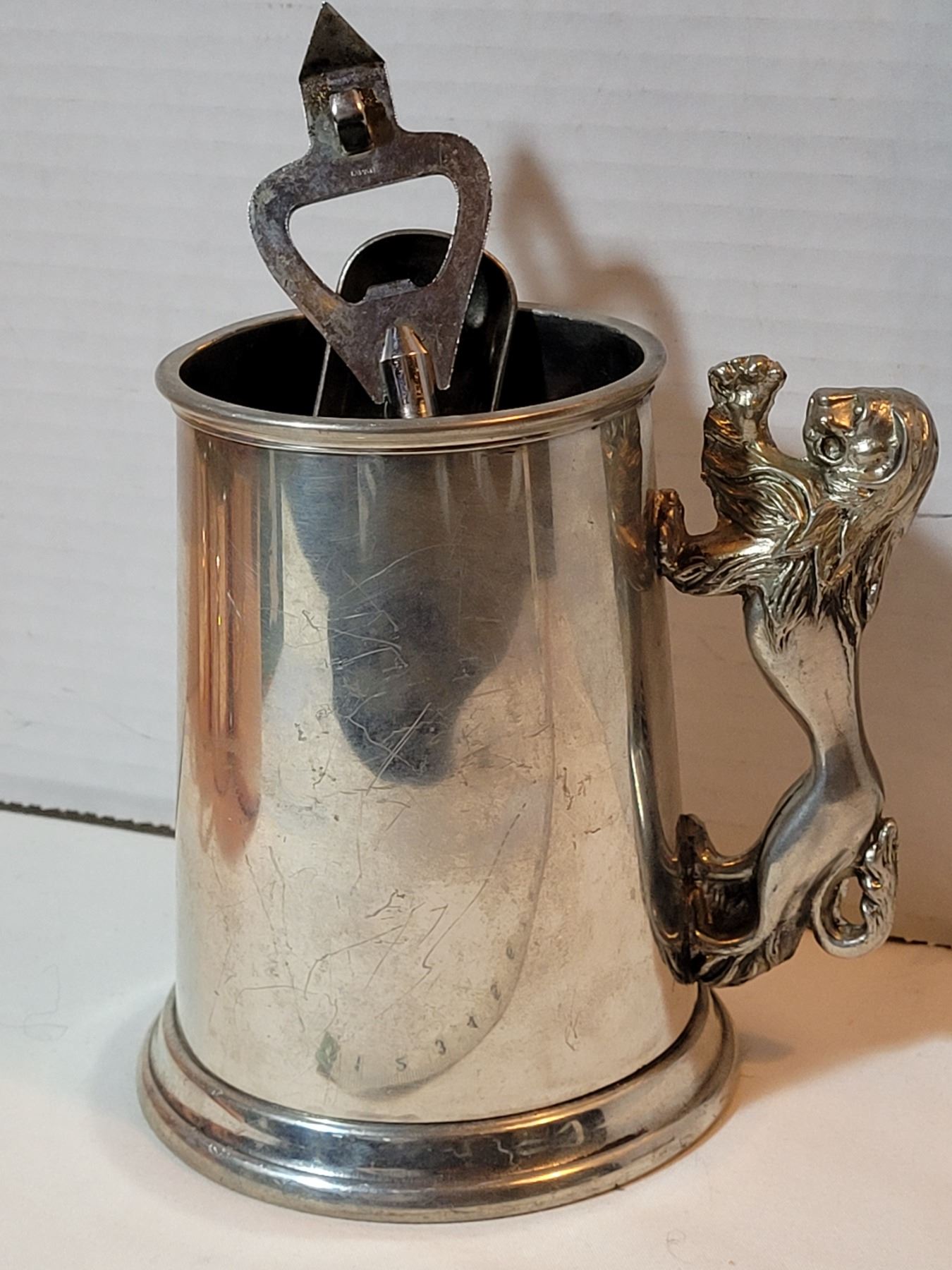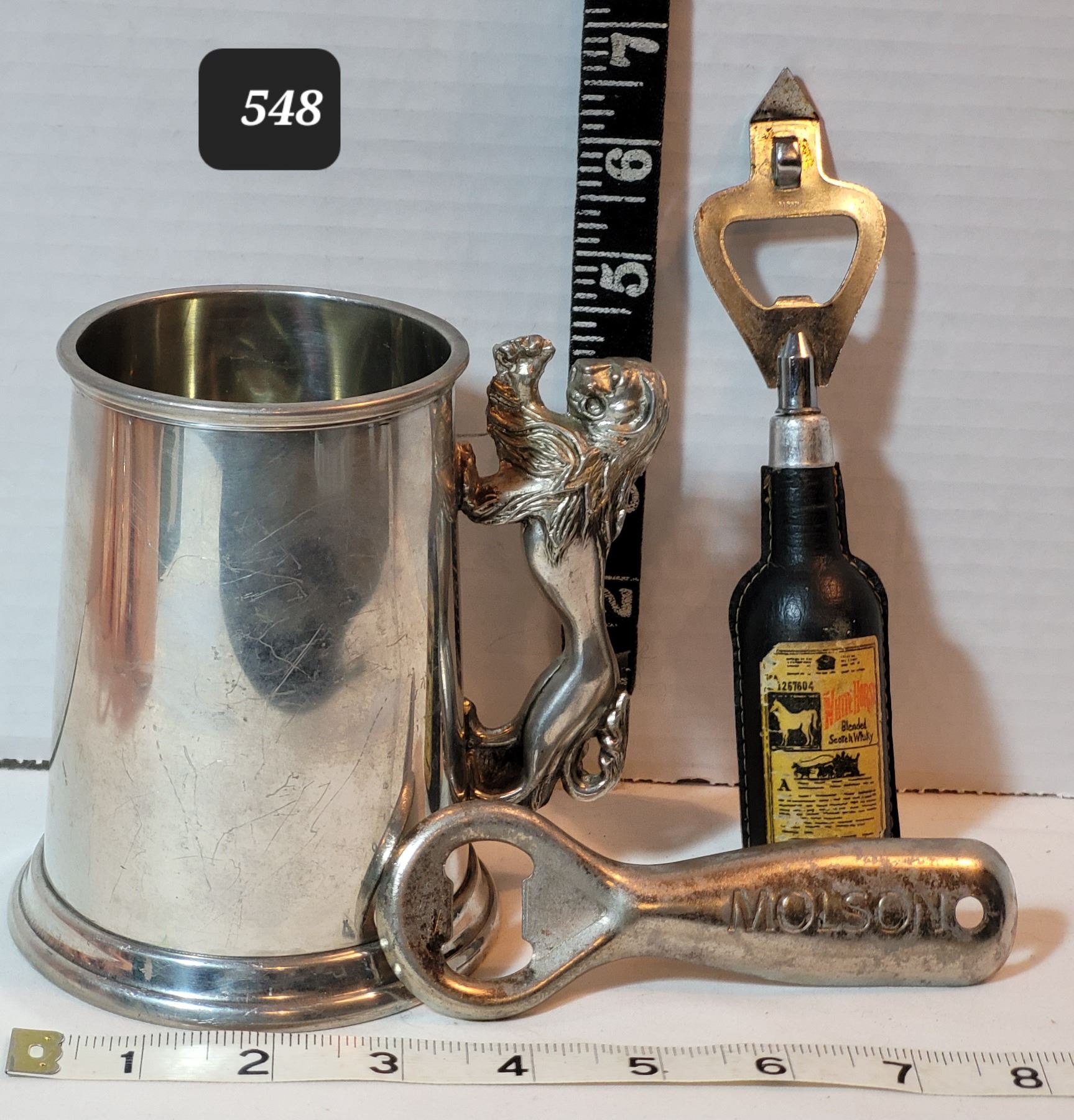 Mid Century, lion handle, beer stein. Molson & Leather wrapped Scotch Whiskey bottle openers.