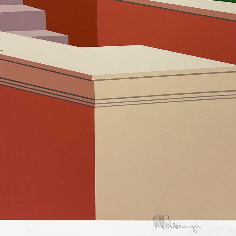 Mid-Day Vista By Schlesinger (1915-2011). "Mid-Day Vista" is a limited edition serigraph on paper by William Schlesinger (1915-2011), numbered 224/300 and hand signed by the artist. Includes Letter of Authenticity. Measures approx. 35.5" x 40" (border), 30" x 36" (image). ** Please note: There is a small white scuff on the bottom-left corner of the image, as well as smudges and creases in the white border area. **