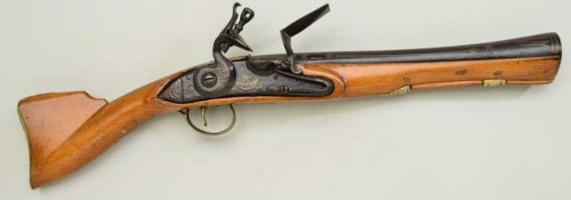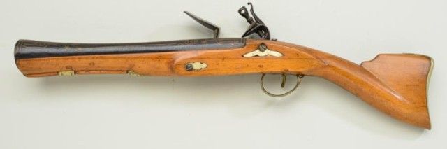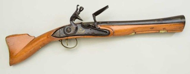 Mid-Eastern Flintlock DAG or Blunderbuss circa 19th century with English style musket size lock plate and inlaid iron barrel. The gun measures 21-1/4” overall with 12-1/4” barrel. The stock is light colored wood with brass alloy mounts, the stock has been refinished. The barrel is inlaid with copper and silver alloy showing date in Arabic, half moon, stars, scrolls etc. The lock is a very early musket lock circa 1700-1730 andthe dag is 19th century. The patina on lock and barrel are a dark black and it was common to use early parts on trade guns. From an old N.Y. collectors estate. Est.;$400-$800.