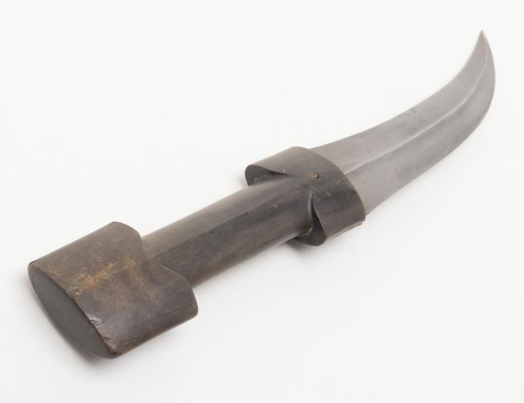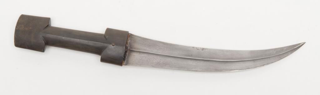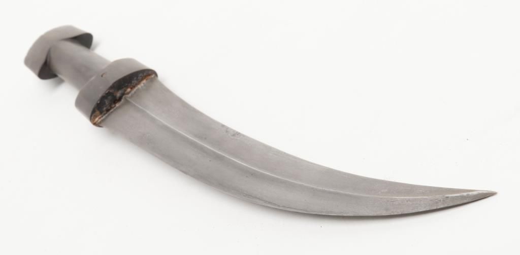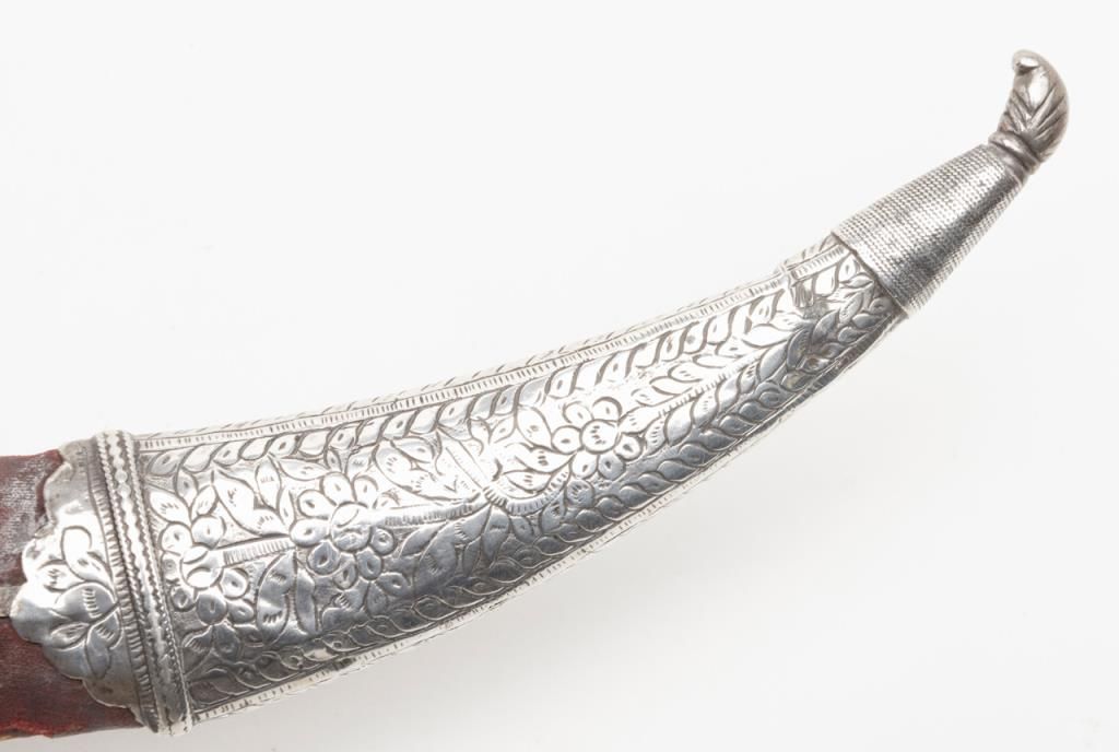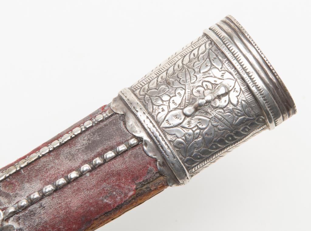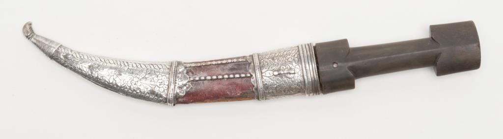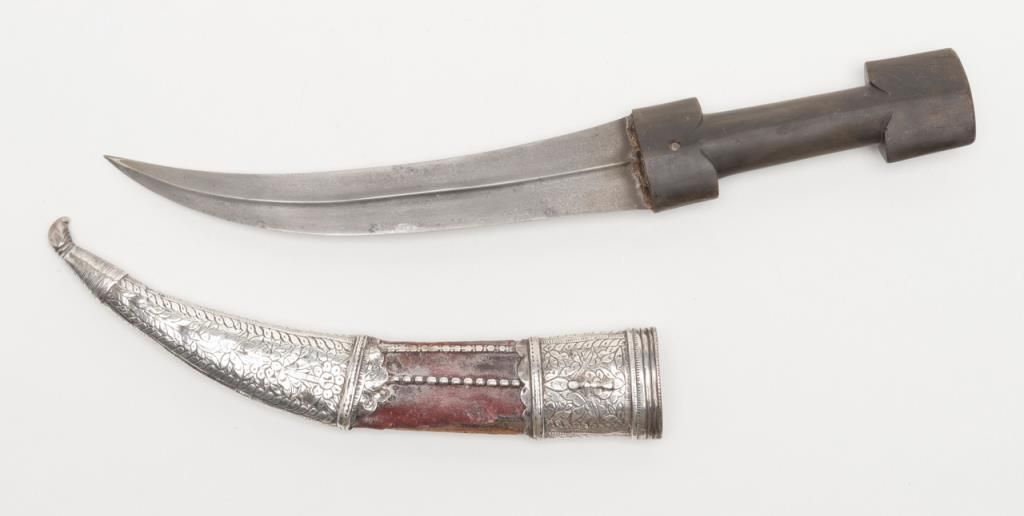 Mid-Eastern dagger with damascus blade, horn grip and silver mounted original scabbard; 19th Century in good quality. Est.: $500-$1,000.