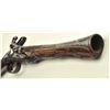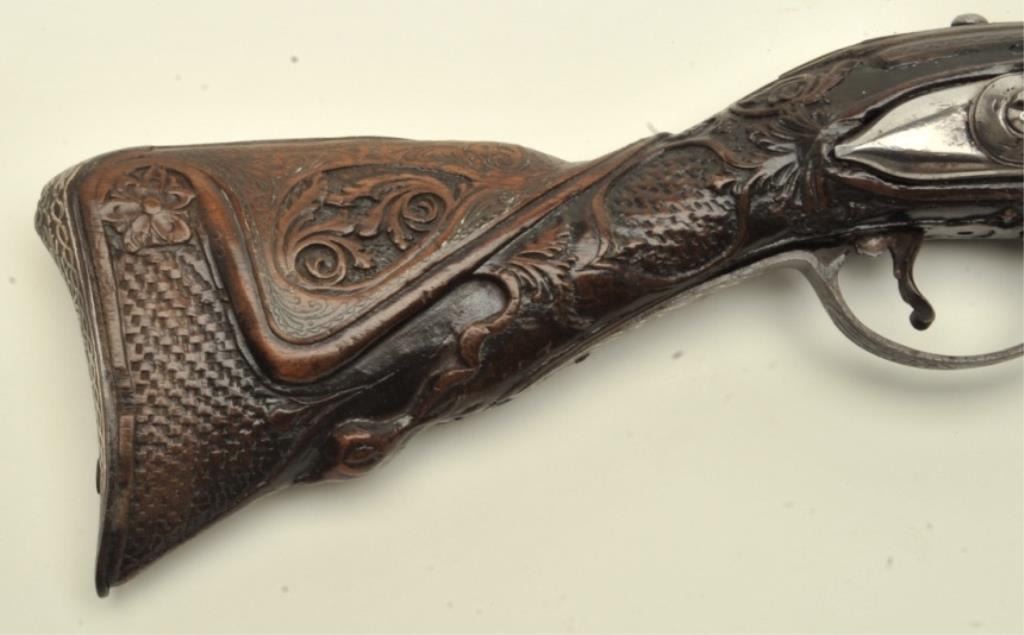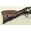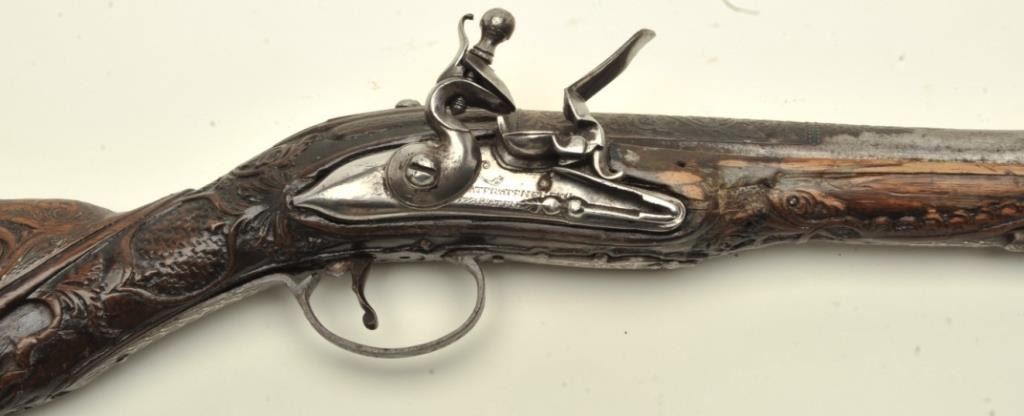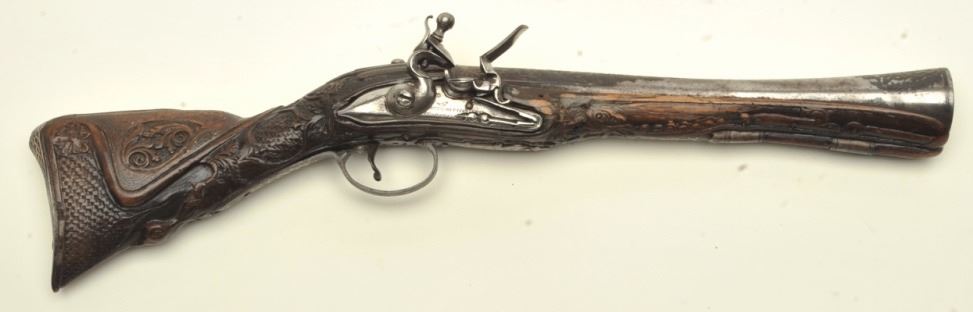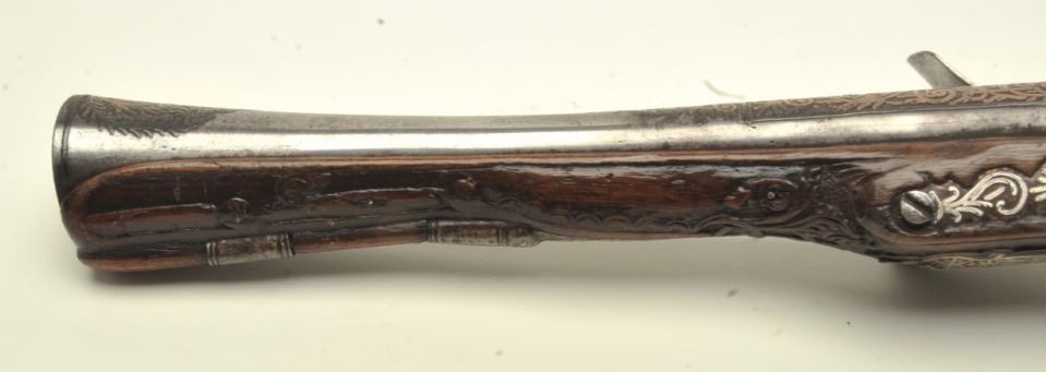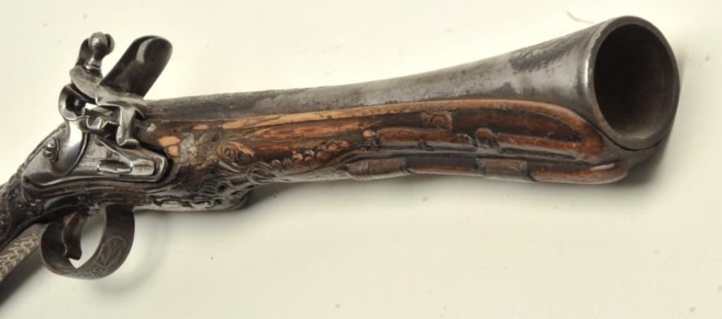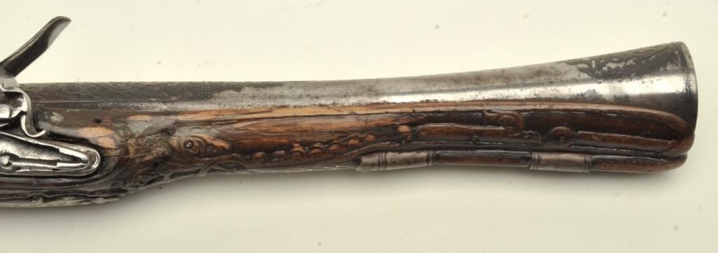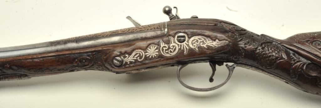 for horsemen. Ornate silver inlaid barrel and mounts. Possibly Turkish and signed on lock with name “AFTR-ATFNEHPK”. Measures 19” overall with 10 ½” barrel of approximately 1 ¼” bore. Iron barrel and mounts. Beautifully carved stock and deluxe inlaid silver that is well done. The lock works well and very attractive. (Antique) Est.: $900-$1800