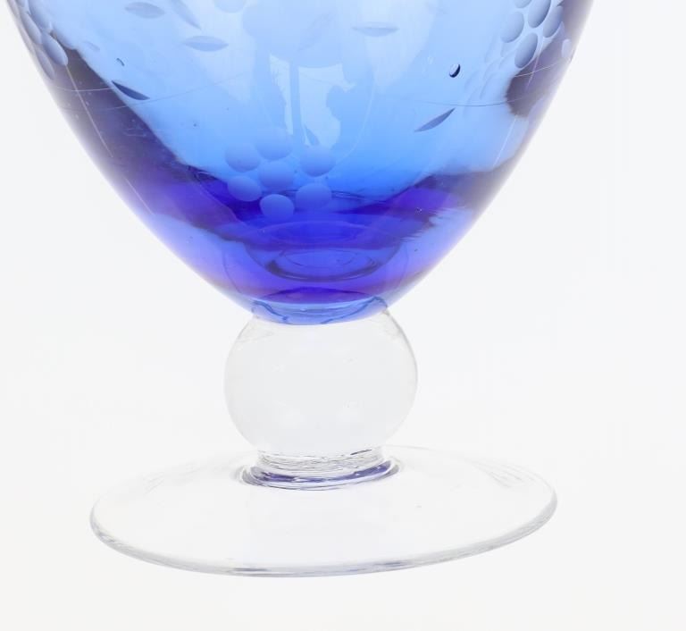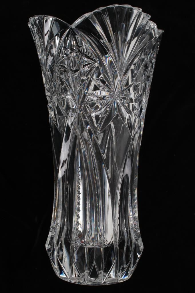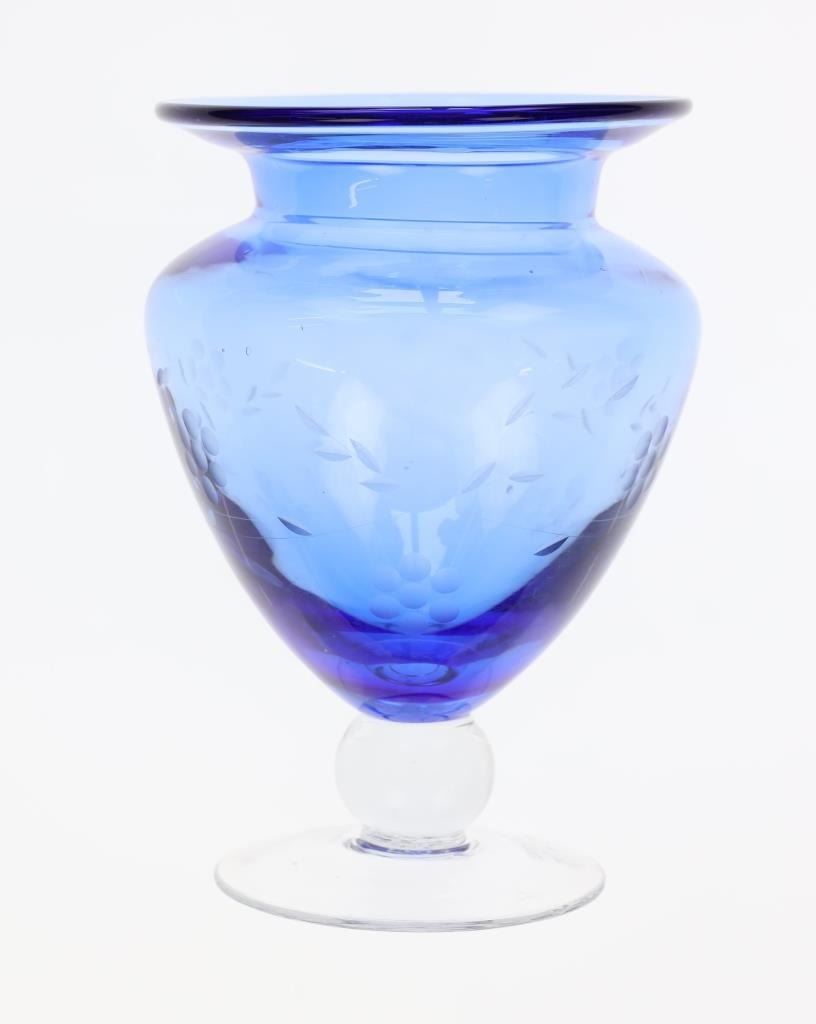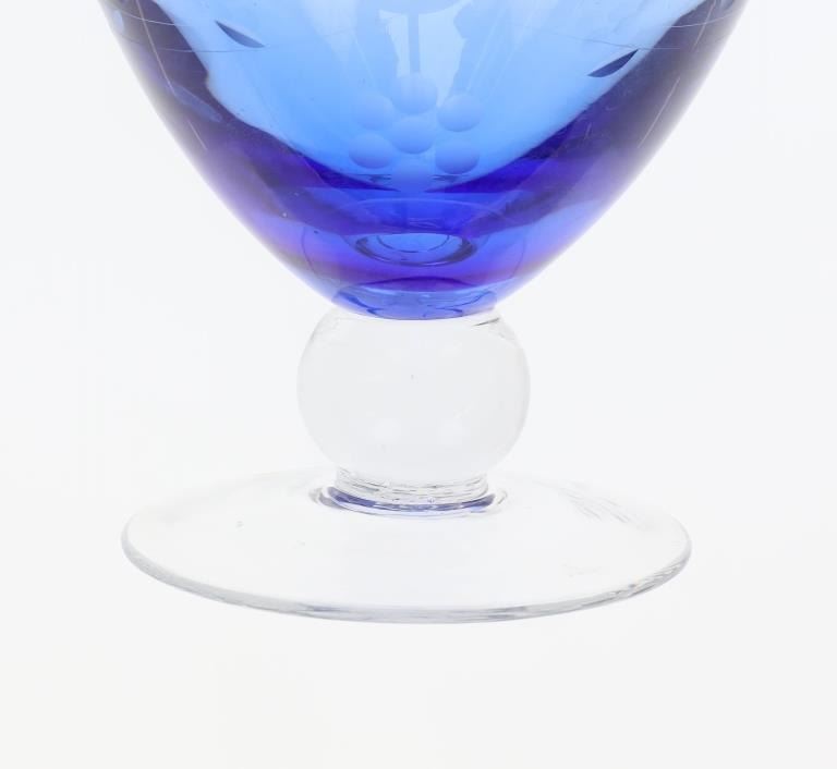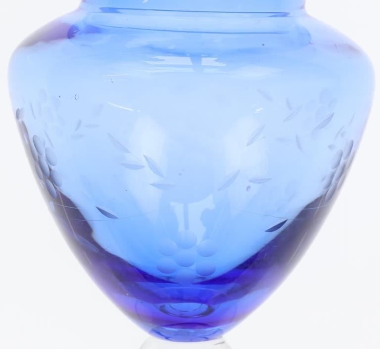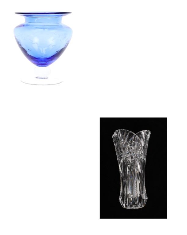 For your consideration are two beautiful glass vases from the mid to late 1900s. The first vase in this lot shows a blue and clear glass construction with finely etched cornflowers throughout the piece. The vase features a clear glass base and a blue glass upper half. The second vase in this lot shows a gorgeous clear glass, crystal cut construction. The vase shows intricate geometric designs throughout. Both vases show good condition with no signs of obvious damage, cracks or chips. The blue vase measures a top diameter 5 7/8" and a height of 9". The clear glass vase measures a top diameter of 6 3/8" and a height of 11 1/2".