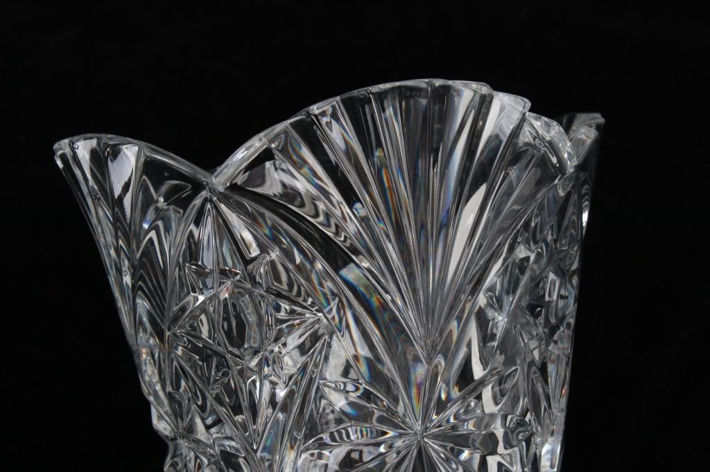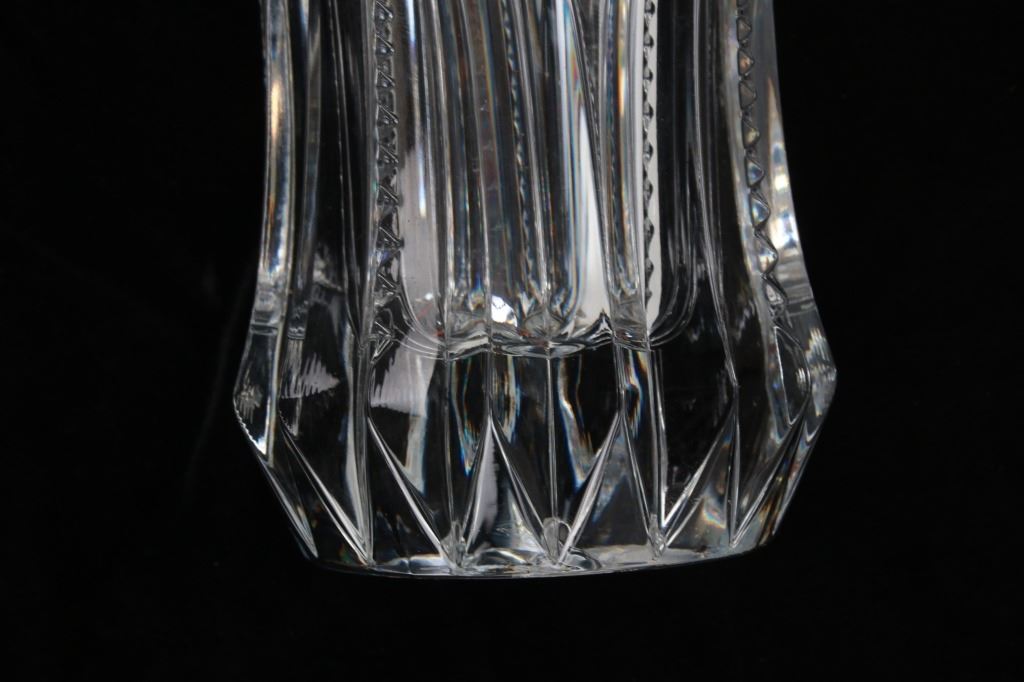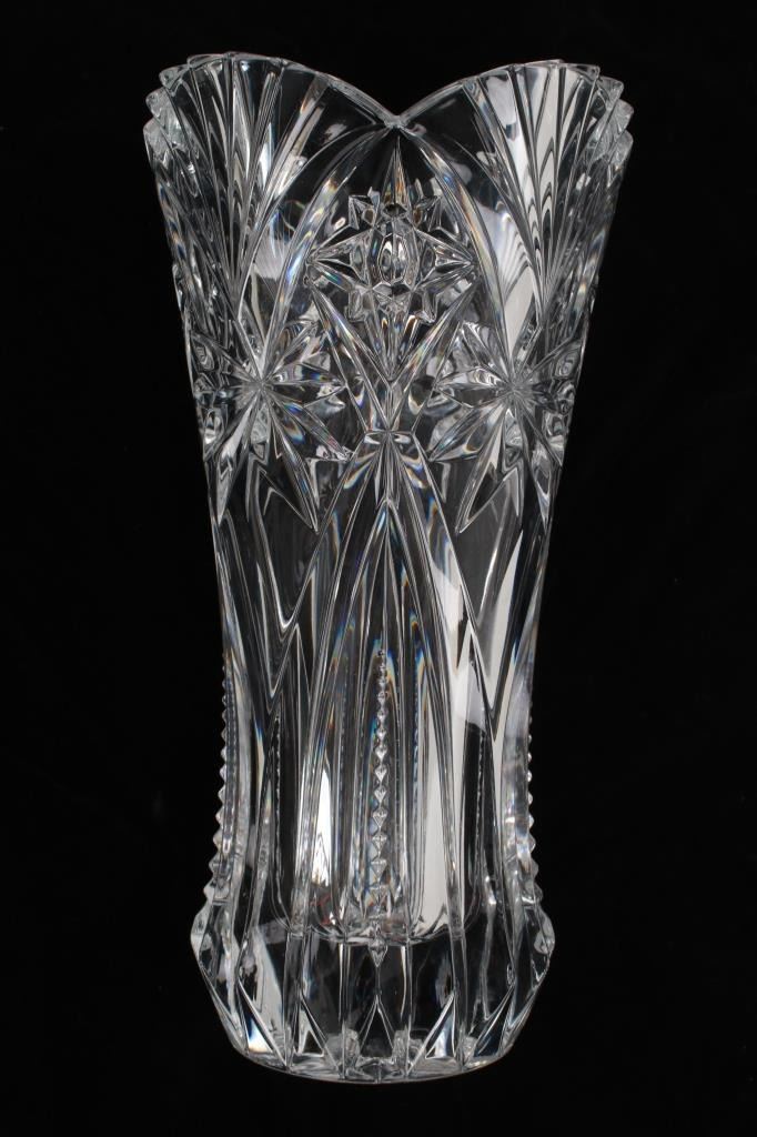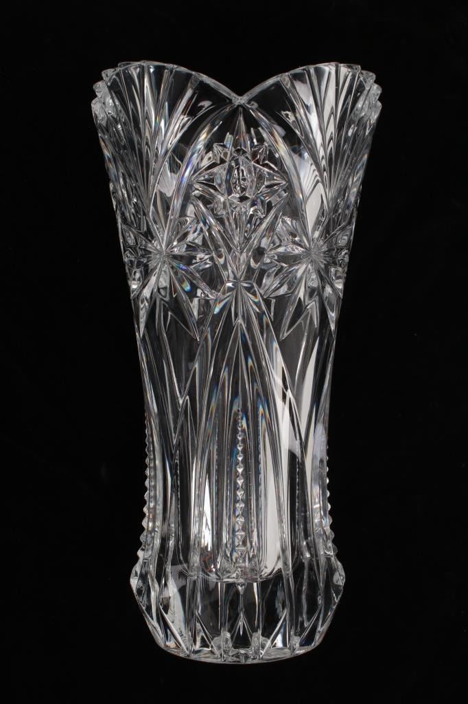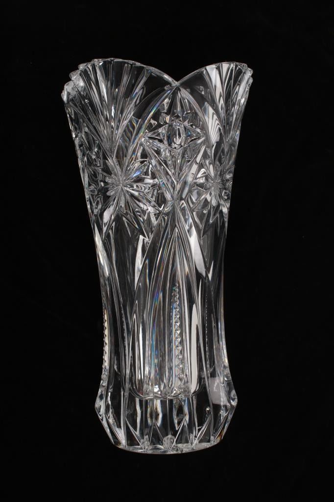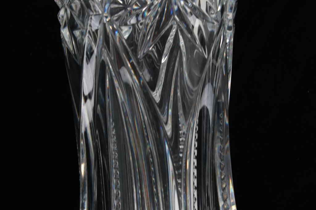 For your consideration are two beautiful glass vases from the mid to late 1900s. The first vase in this lot shows a blue and clear glass construction with finely etched cornflowers throughout the piece. The vase features a clear glass base and a blue glass upper half. The second vase in this lot shows a gorgeous clear glass, crystal cut construction. The vase shows intricate geometric designs throughout. Both vases show good condition with no signs of obvious damage, cracks or chips. The blue vase measures a top diameter 5 7/8" and a height of 9". The clear glass vase measures a top diameter of 6 3/8" and a height of 11 1/2".