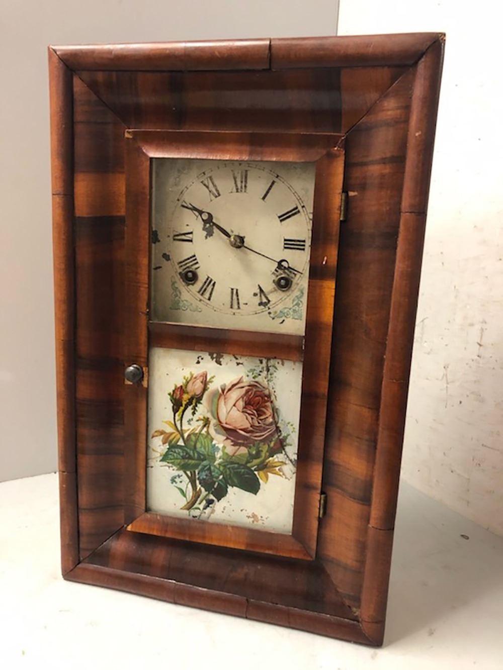 Mid size OG shelf clock, all original, beautiful case in unusual wood design. This clock has original reverse painted lower glass, if you had to replace the glass, it would cost approx. $300. This example gives an idea of the value of this clock in all original condition. Was in running condition at the estate. From the Chatham, Ma, Cape Cod Collection.