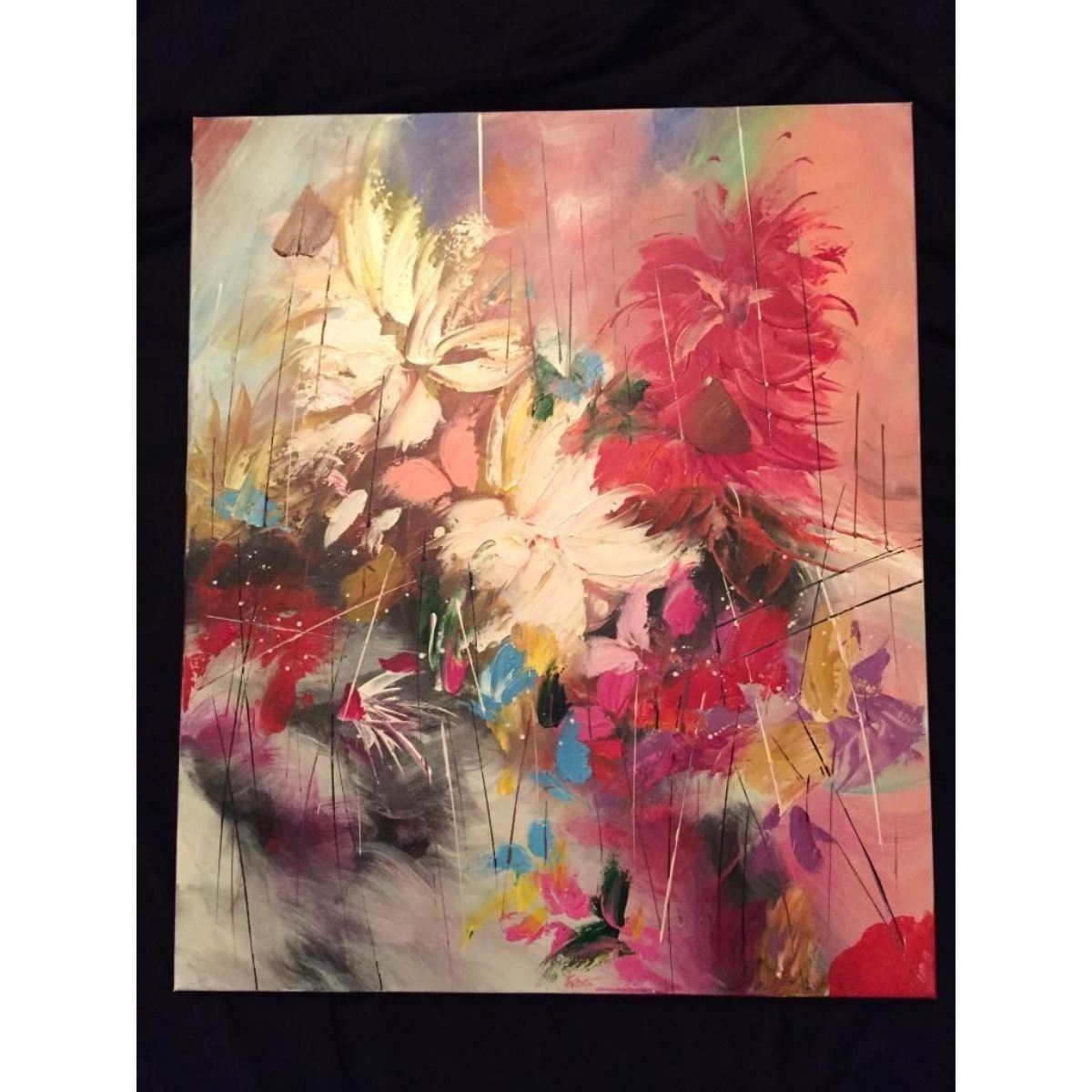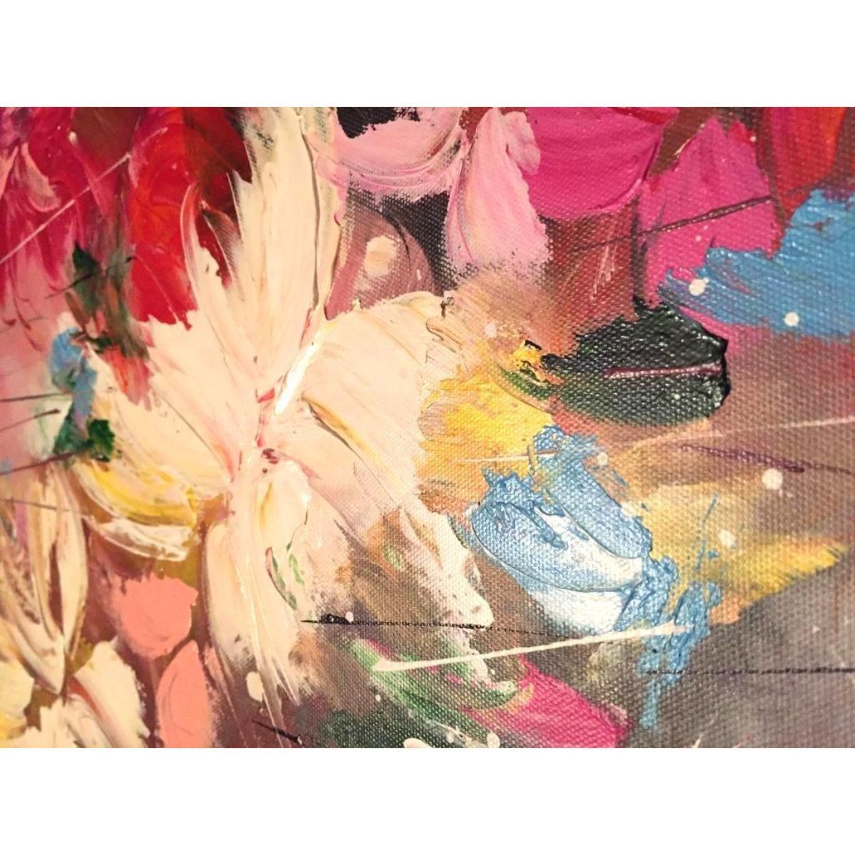 Mid-century-style modern abstract expressionist floral still life painting on studio wrap canvas. Thick impasto texture in the foreground. Unsigned. 19 1/2" X 23 1/2".