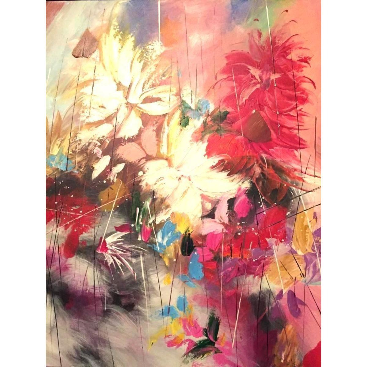 Mid-century-style modern abstract expressionist floral still life painting on studio wrap canvas. Thick impasto texture in the foreground. Unsigned. 19 1/2" X 23 1/2".