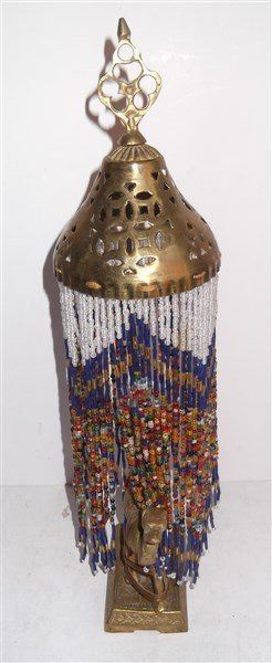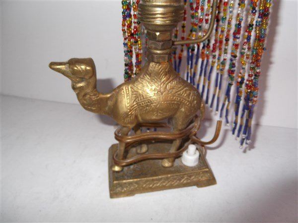 Mid-century Brass & beaded camel lamp. Needs re-wiring. 13 1/2 inches high x 2 inches wide x 3 inches deep.