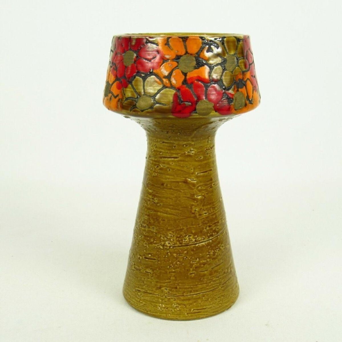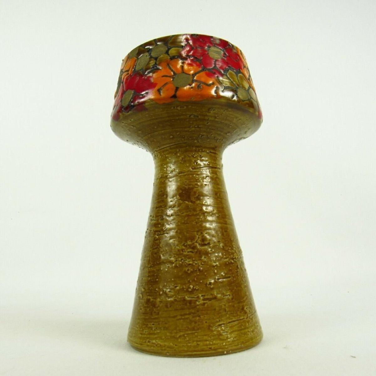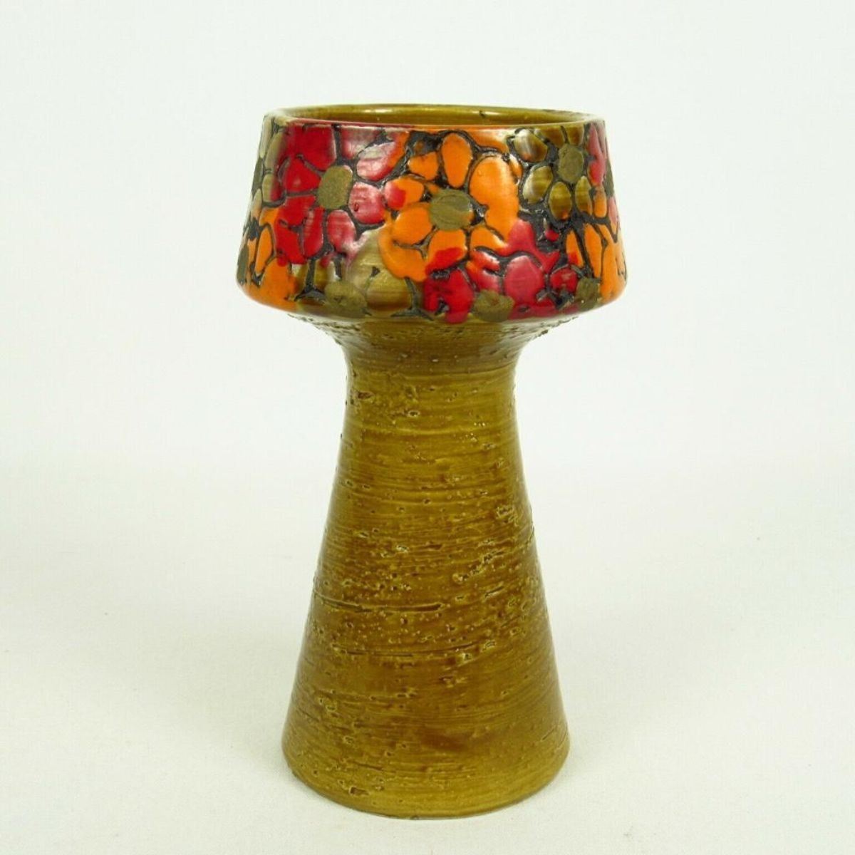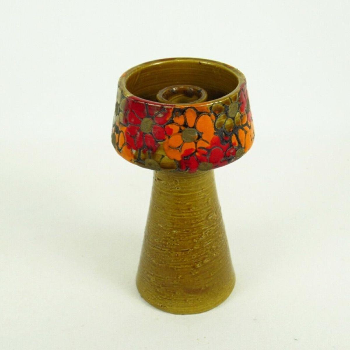 Mid-century modern, 1950's Italian signed Bitossi pottery candle holder with yellow undertone brown glaze with red & orange brutalist style flowers. Concave underside signed 67/5A Italy. 6 1/2" H X 3 1/2" D.Â